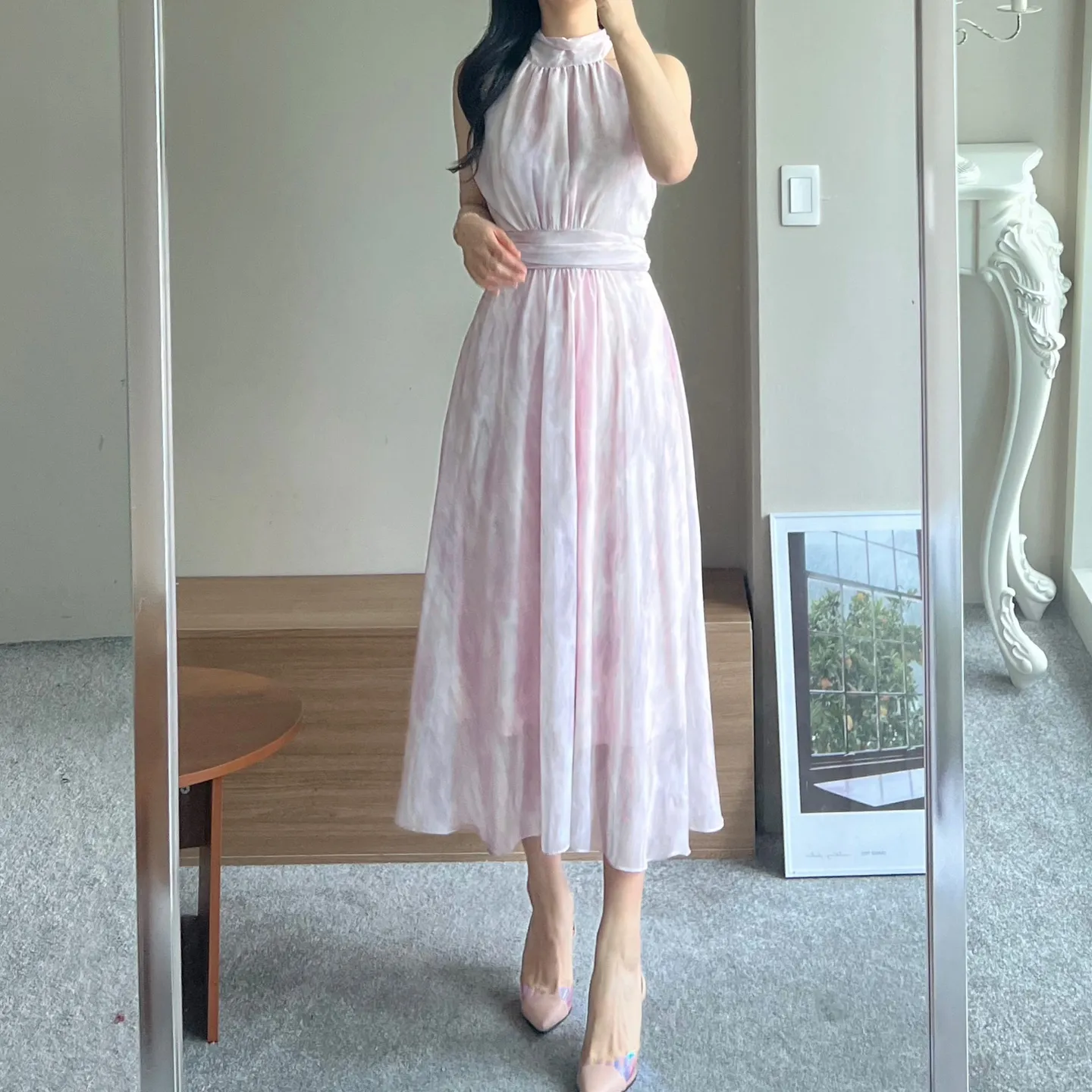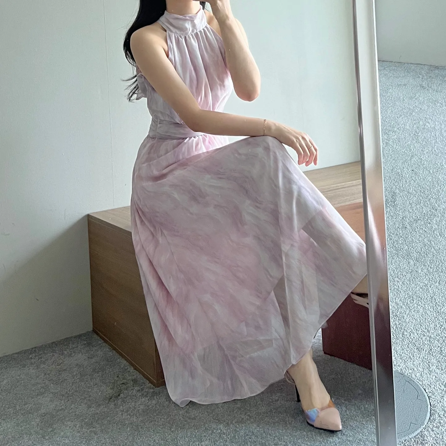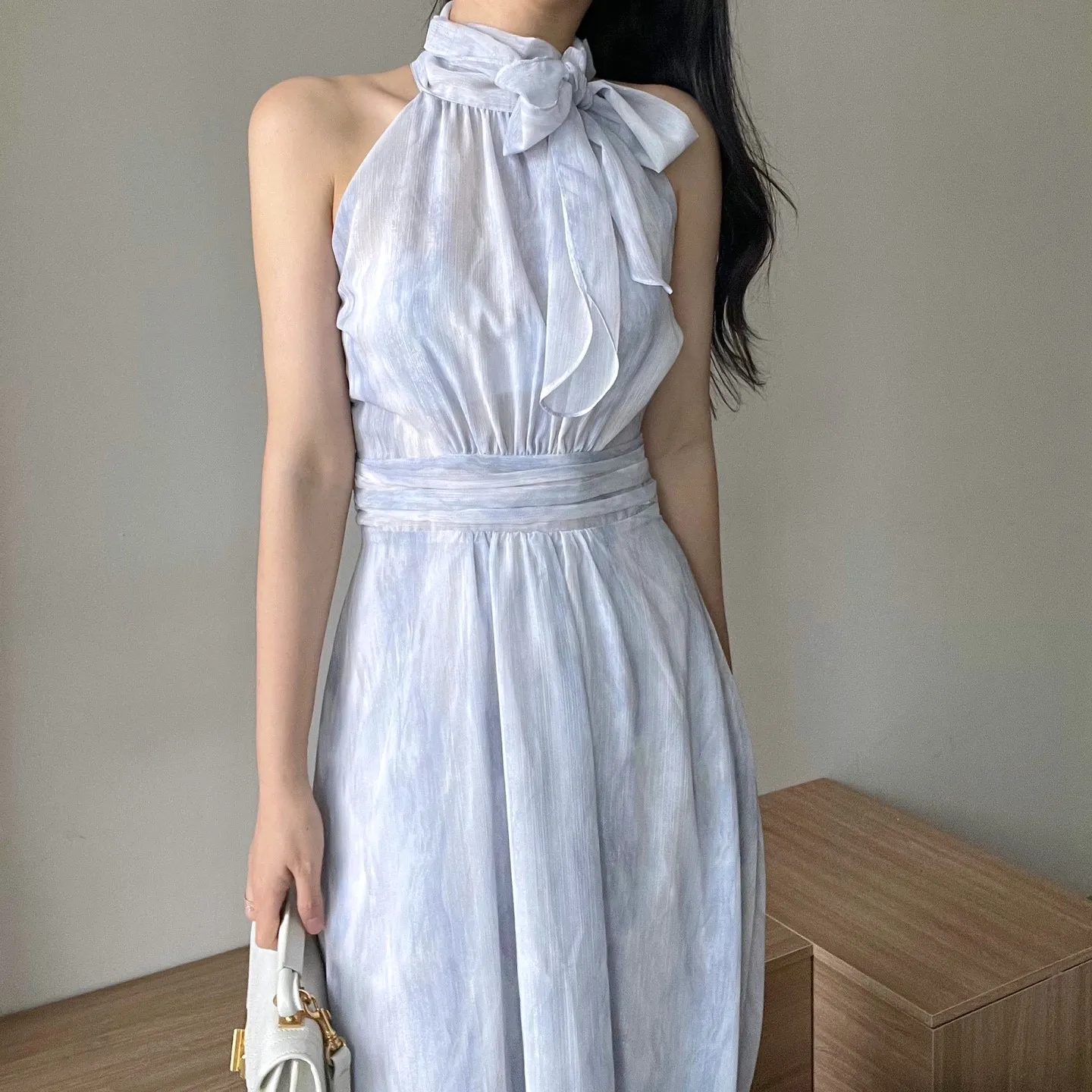 シフォンホルターネックギャザーバックストラップワンピース