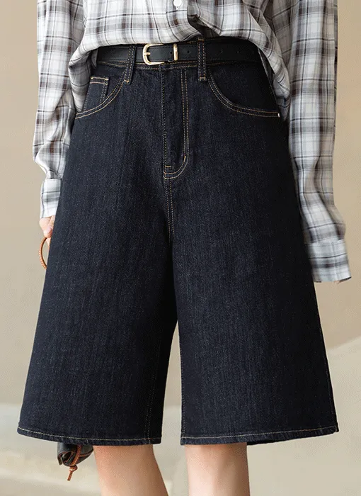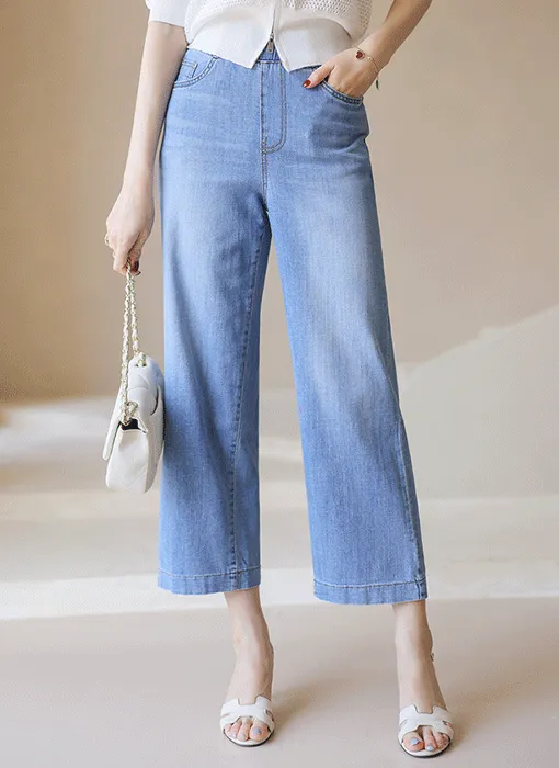 デニムコットンウォッシングポケットリベットバックポケットストレートワイドジップアップバックルループヒドゥンバンディングライトブルーディープブルーデニムパンツ[選べる丈]