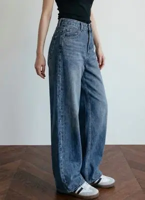 リネン混デニムジップアップバックルウォッシングポケットハイウエストウエストゴムリベットワイドループバックポケットライトブルーディープブルーデニムパンツ[選べる丈]