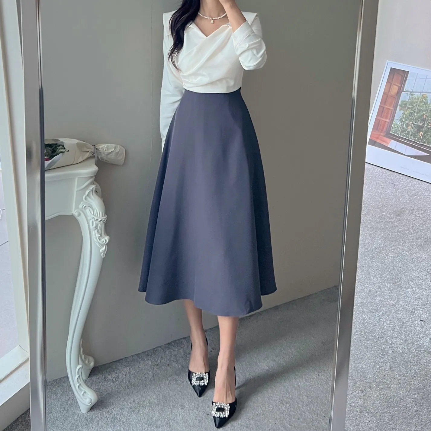 ジップアップスクエアネックパール調ボタンラインパフスリーブロングAラインワンピース