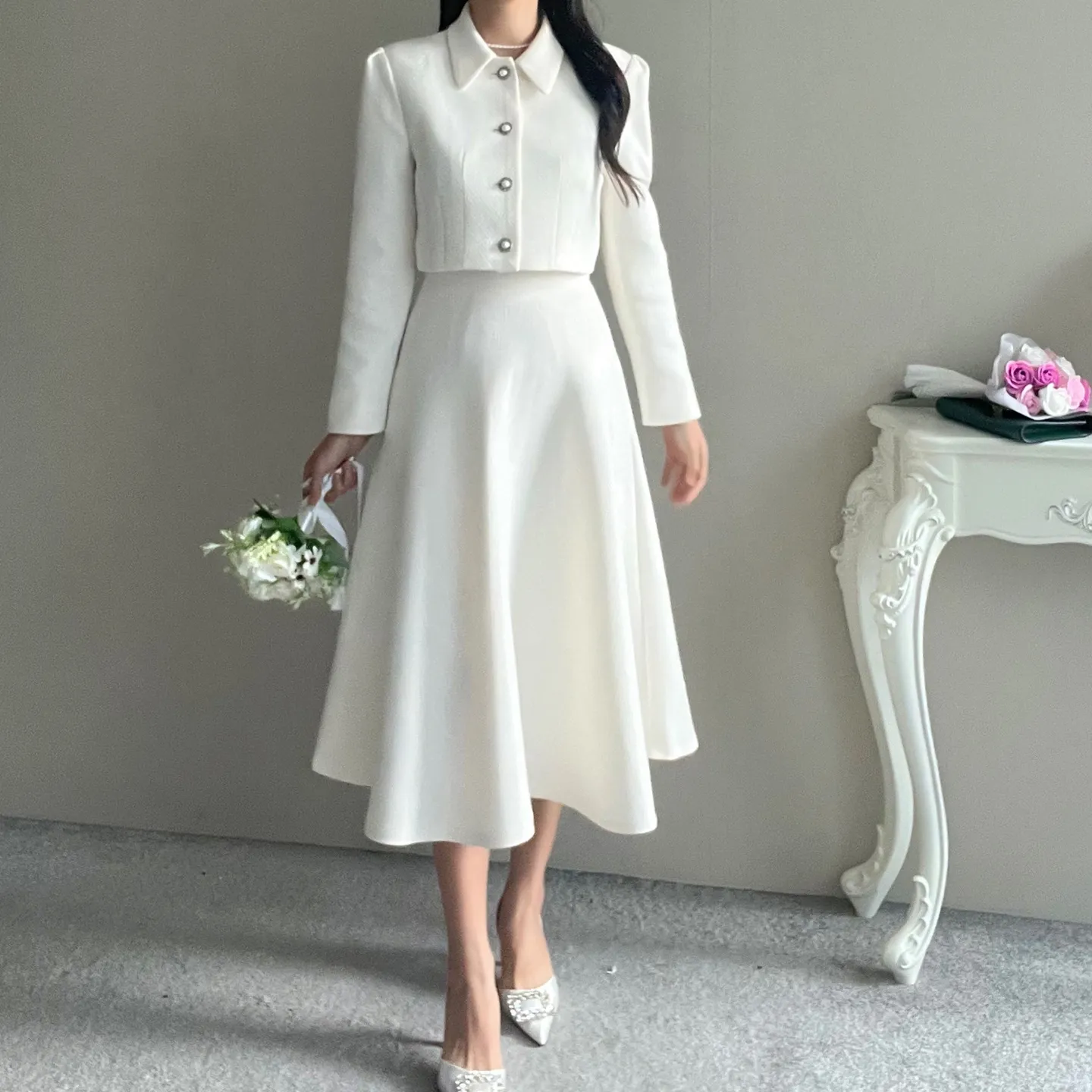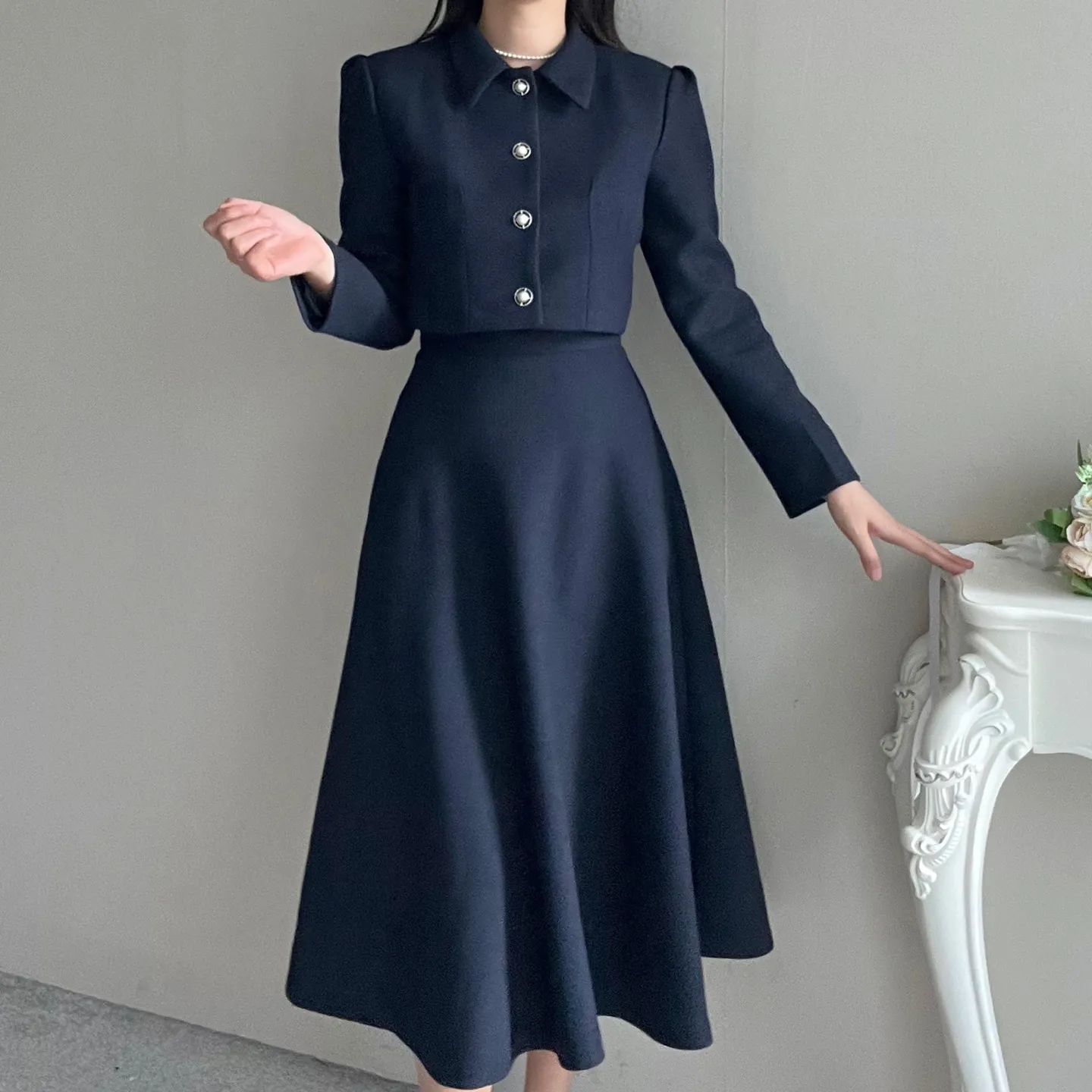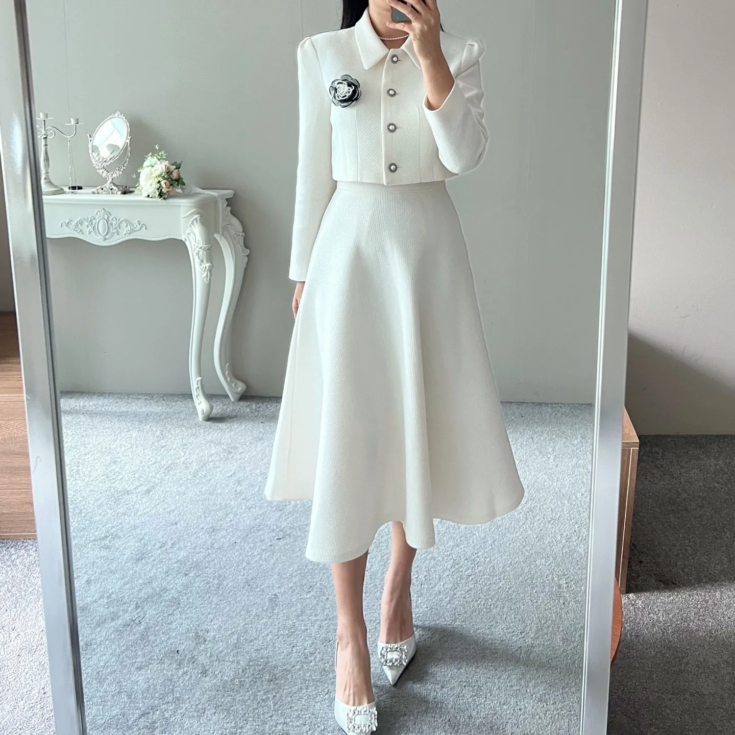 パール調ボタンパフツイードジャケット&フレアスカートSET