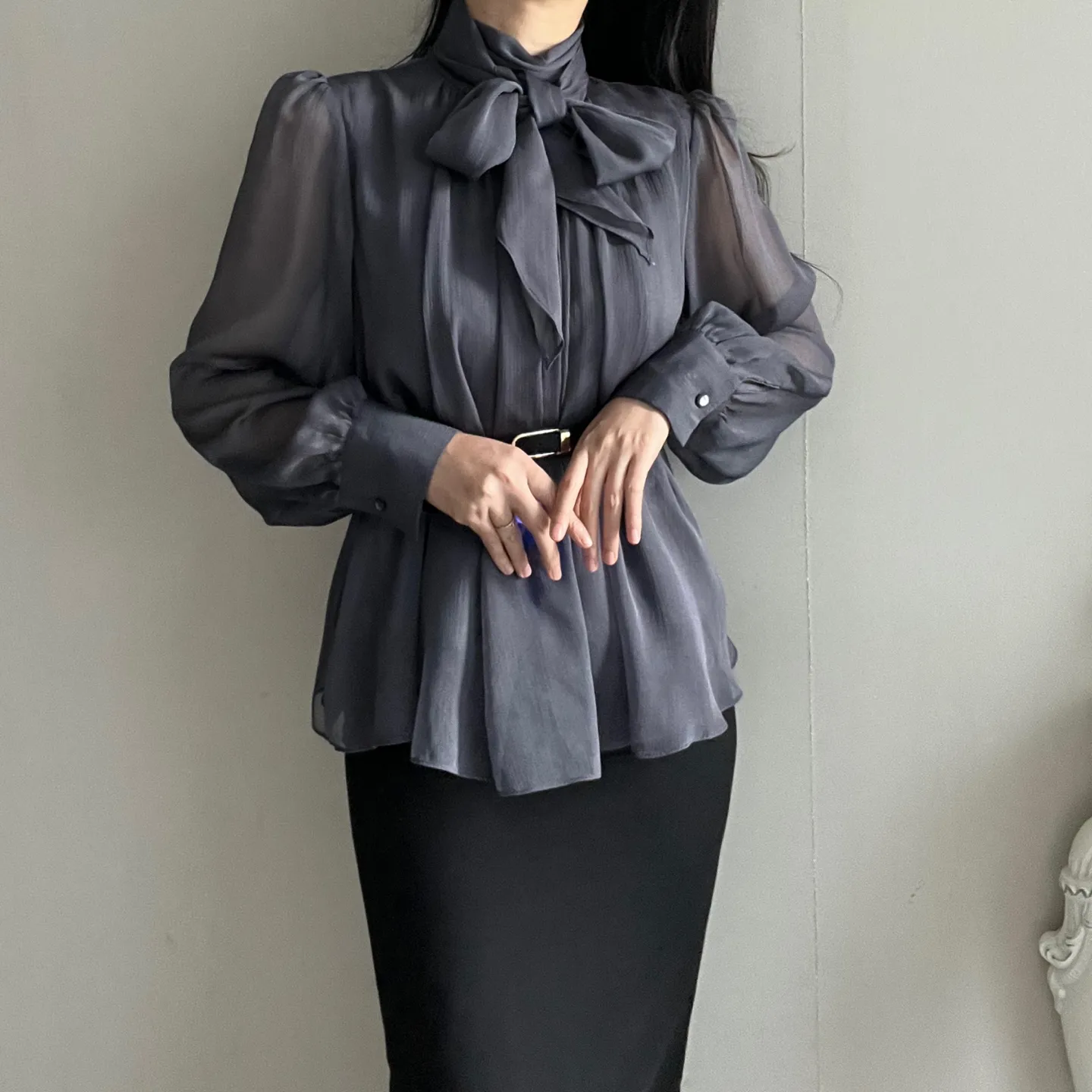 長袖ボウタイリンクルブラウス