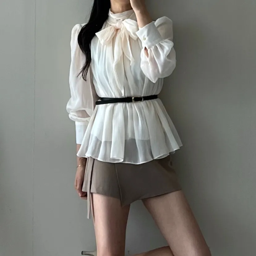 シースルースカーフネック長袖ボウタイブラウス