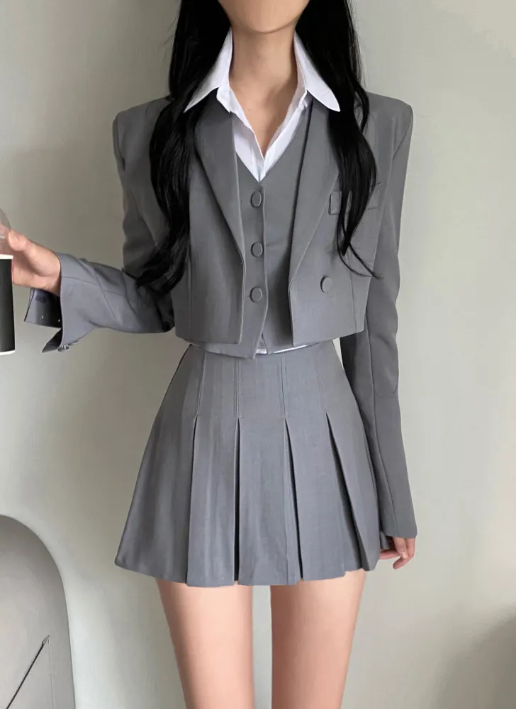 ツイードウール混ラウンドネックプリーツ肩パッドライン長袖ビジューボタンシークレットボタンダブルボタンツーピース(トップス、ボトムス)スカートダブルジャケット