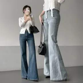 ストレッチデニムジップアップバックルウォッシングポケット骨盤パッドスリムロングフラップポケットリベットループバックポケットブーツカットライトブルーデニムパンツ