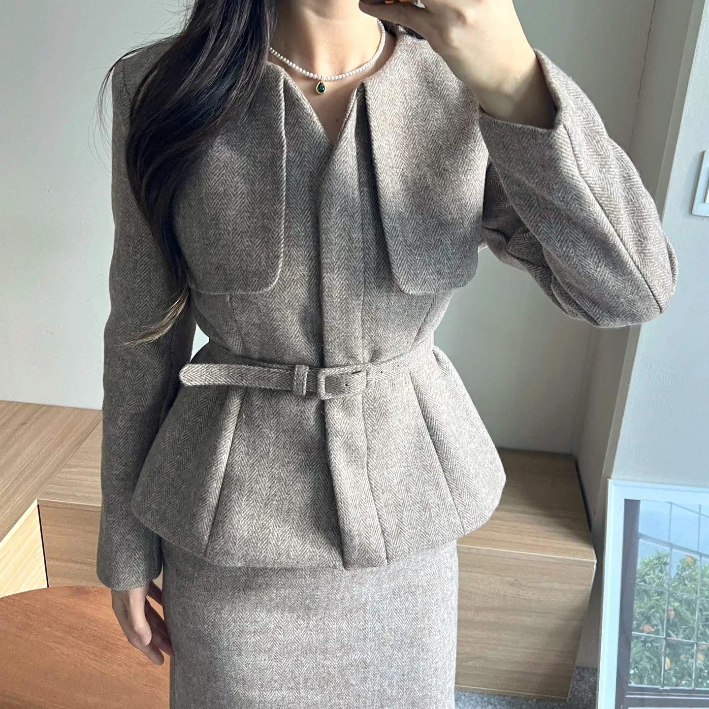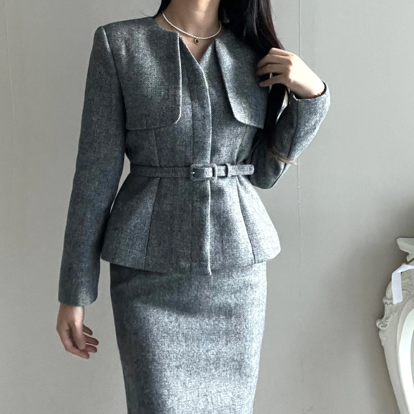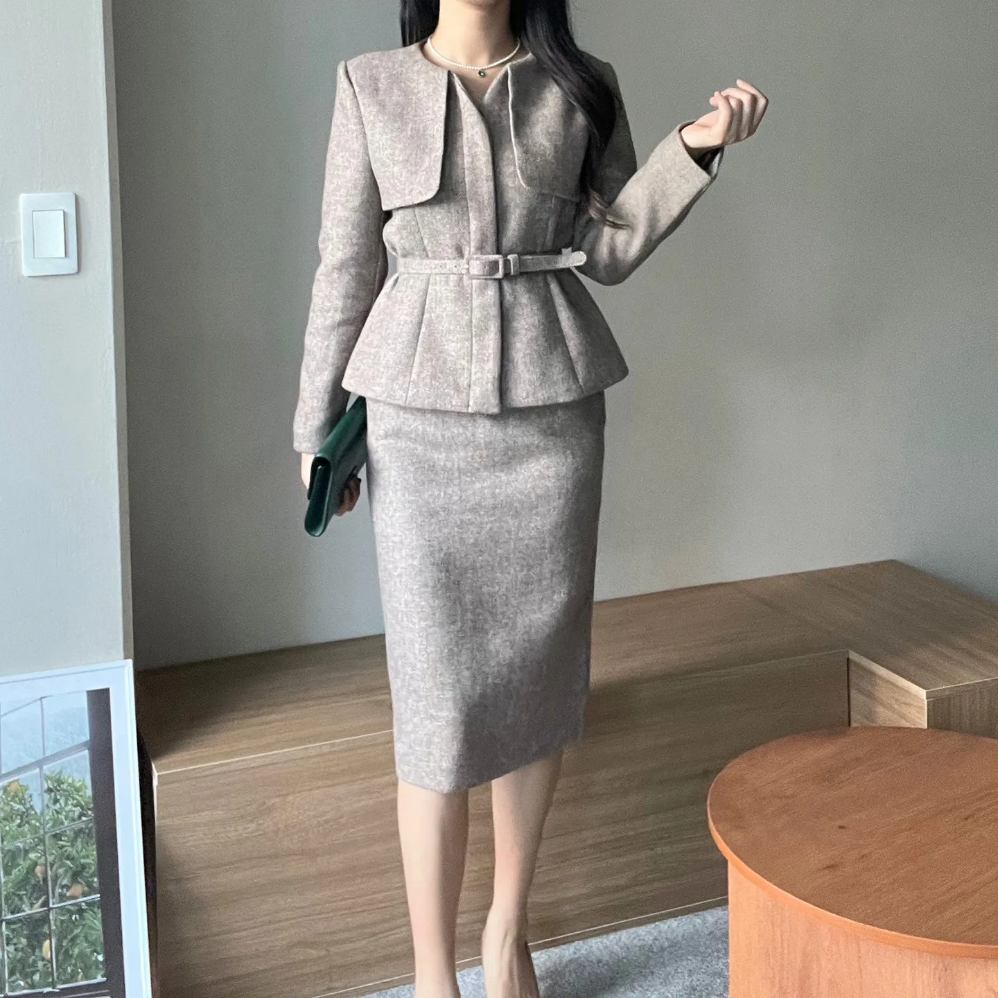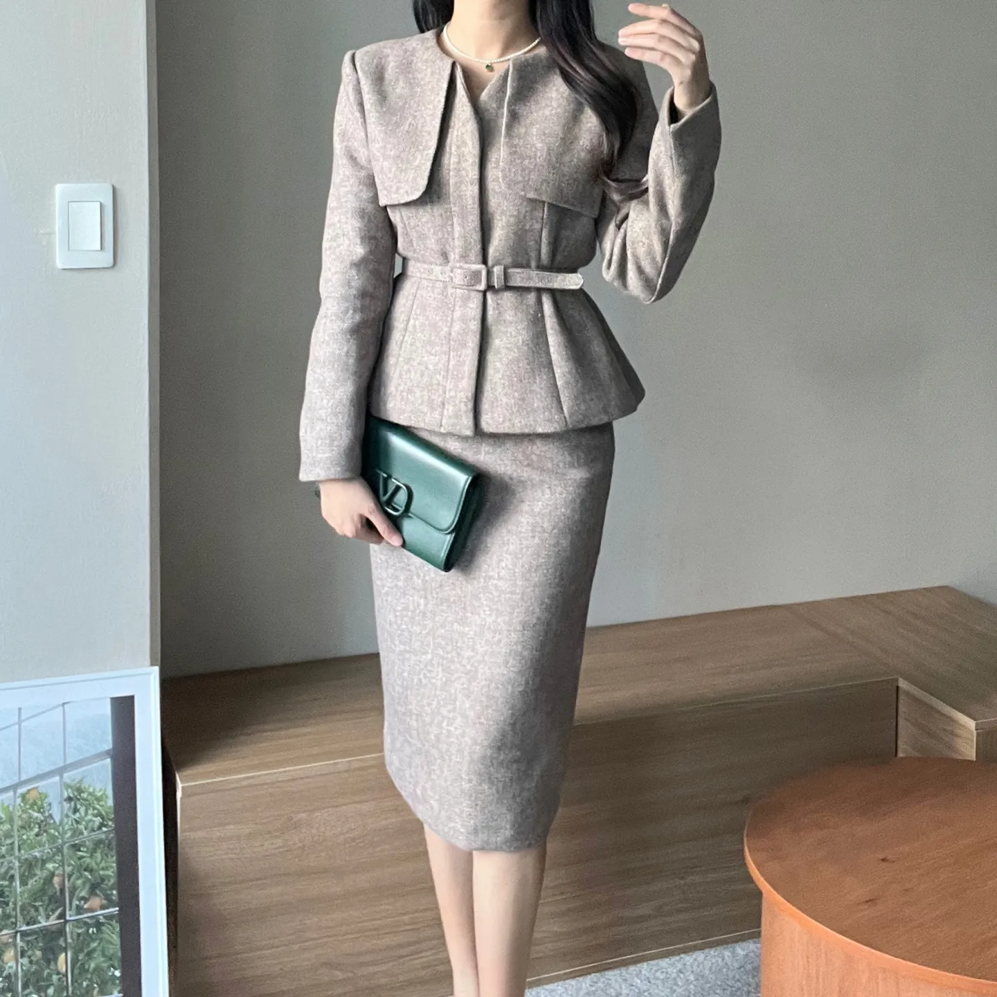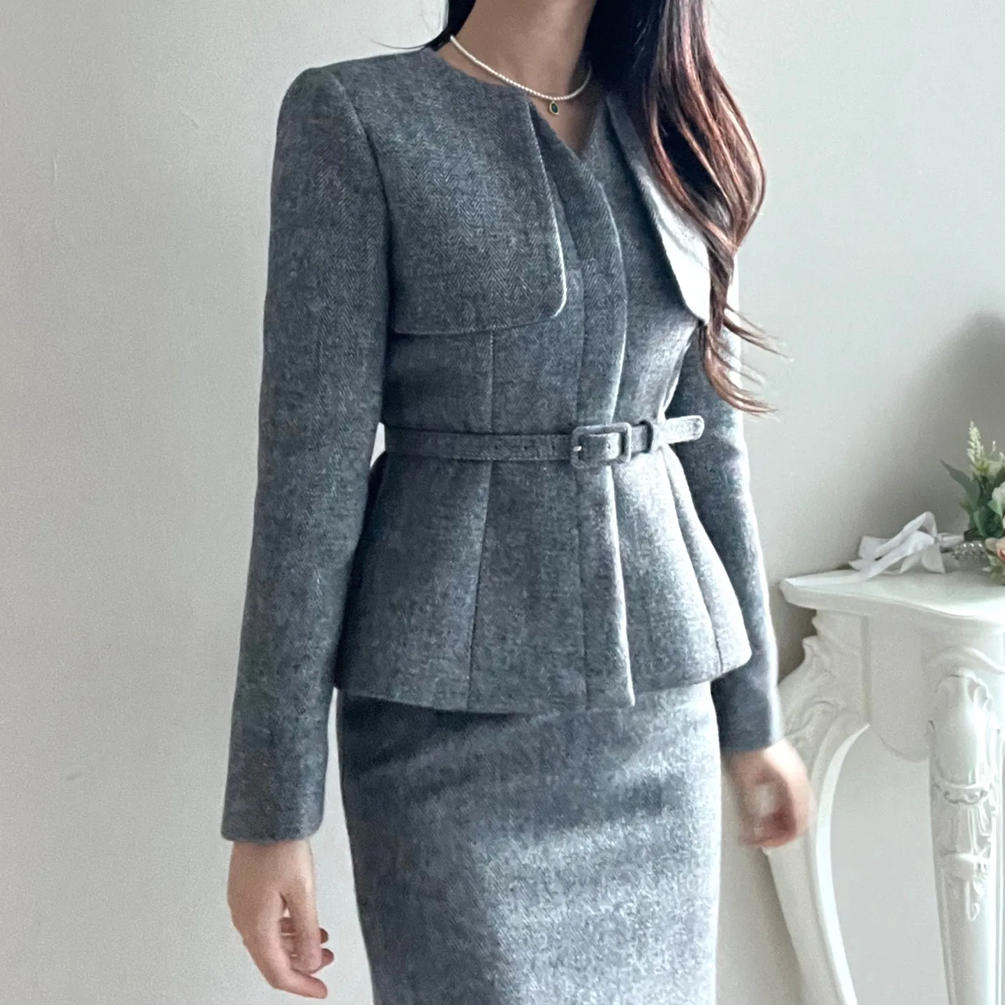 ラウンドネックノーカラースリットハイウエスト肩パッドペプラムスリムHライン長袖タックシークレットボタンダブルボタン無地ツーピース(トップス、ボトムス)スカートダブルジャケット