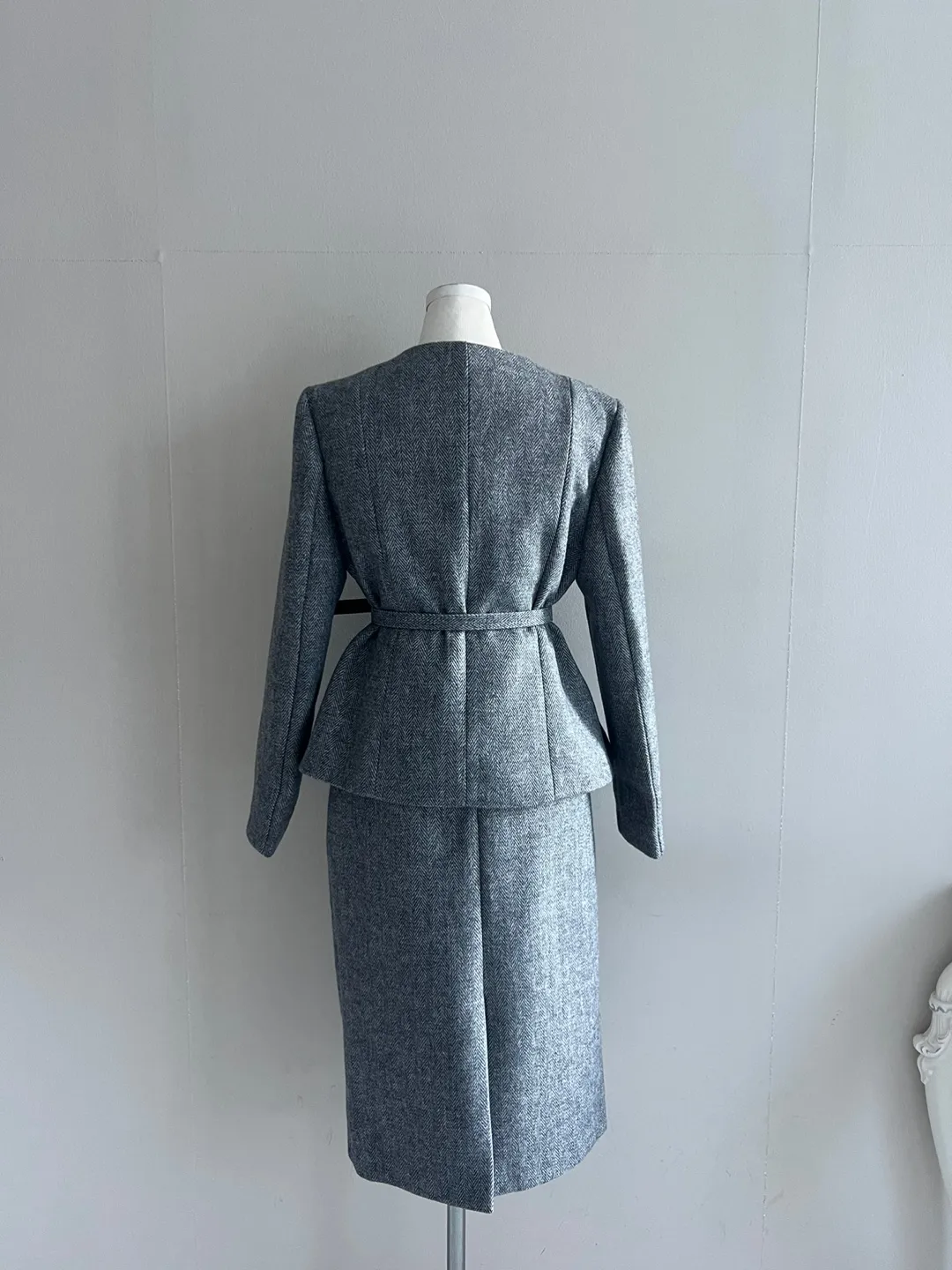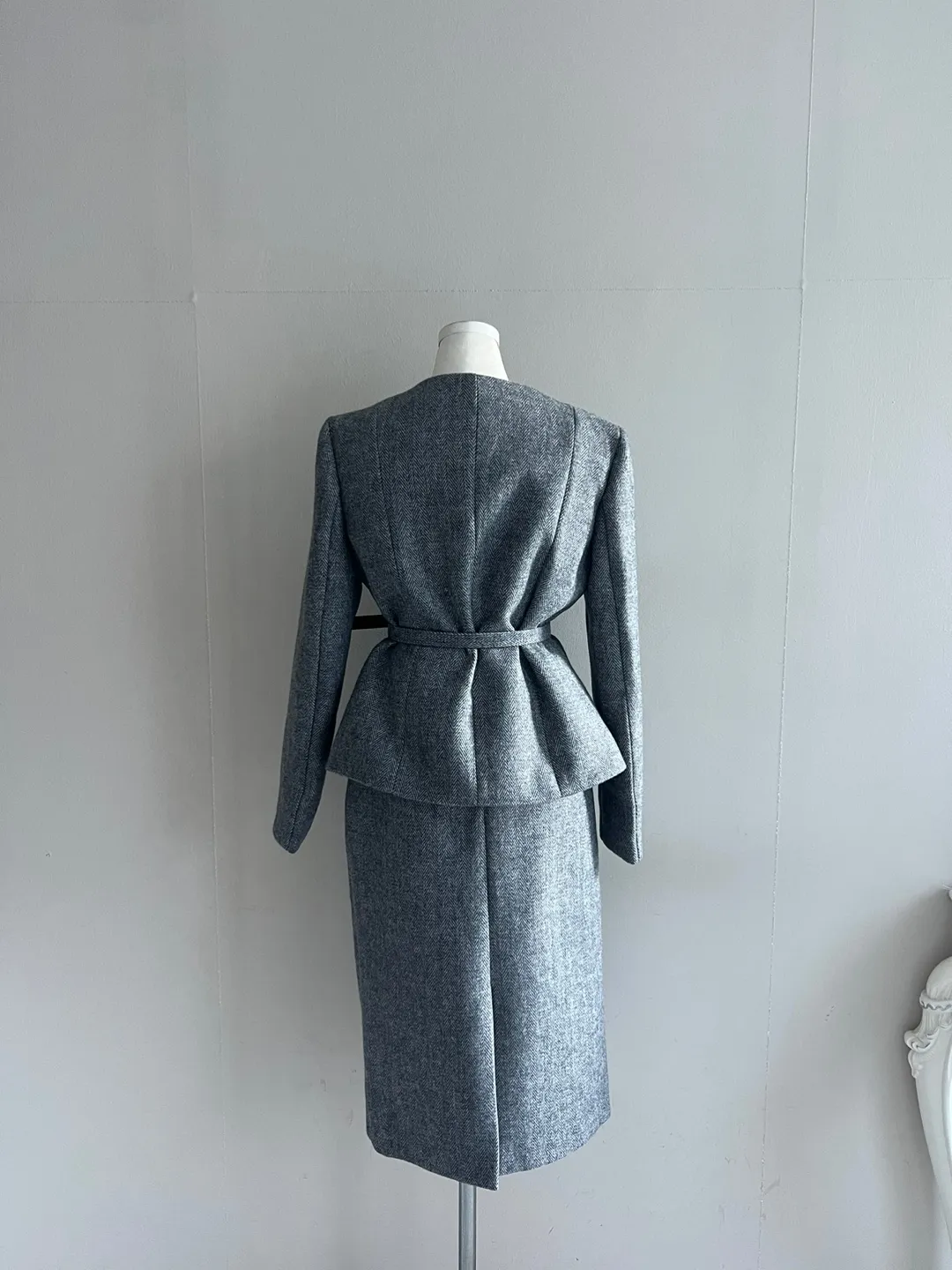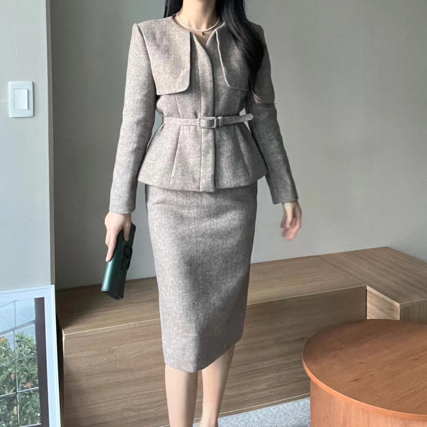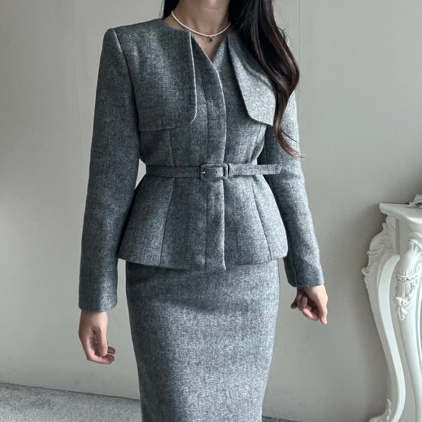 ラウンドネックノーカラースリットハイウエスト肩パッドペプラムスリムHライン長袖タックシークレットボタンダブルボタン無地ツーピース(トップス、ボトムス)スカートダブルジャケット