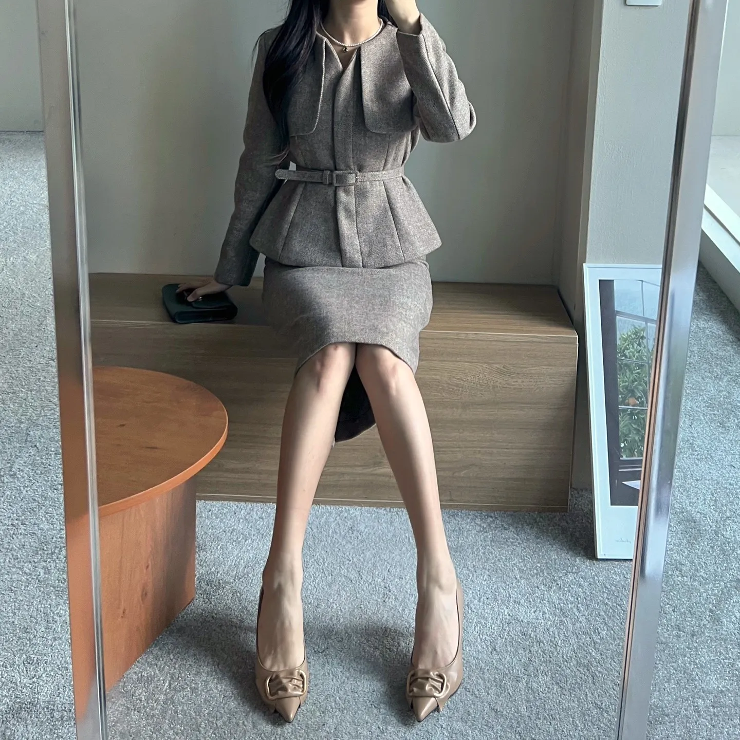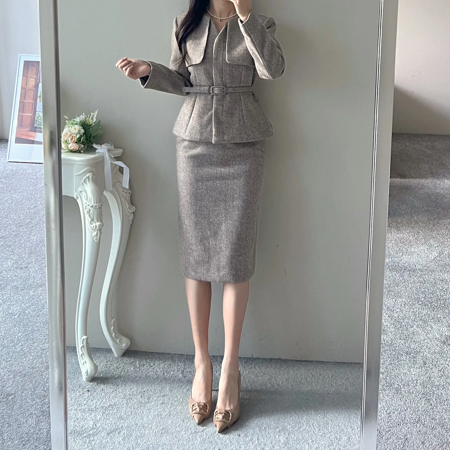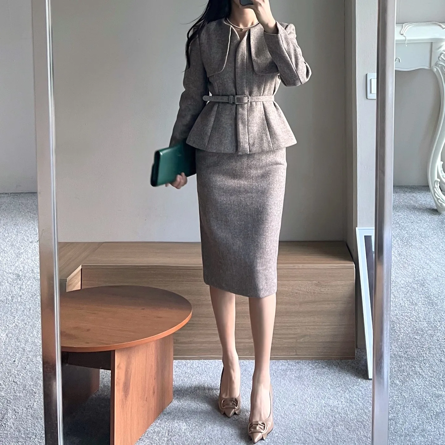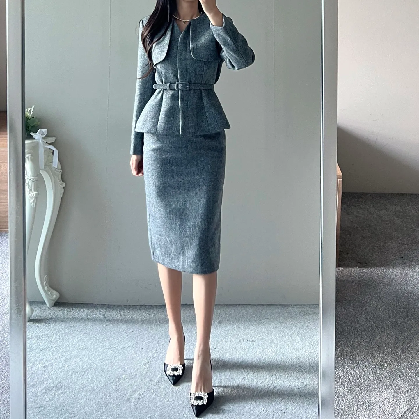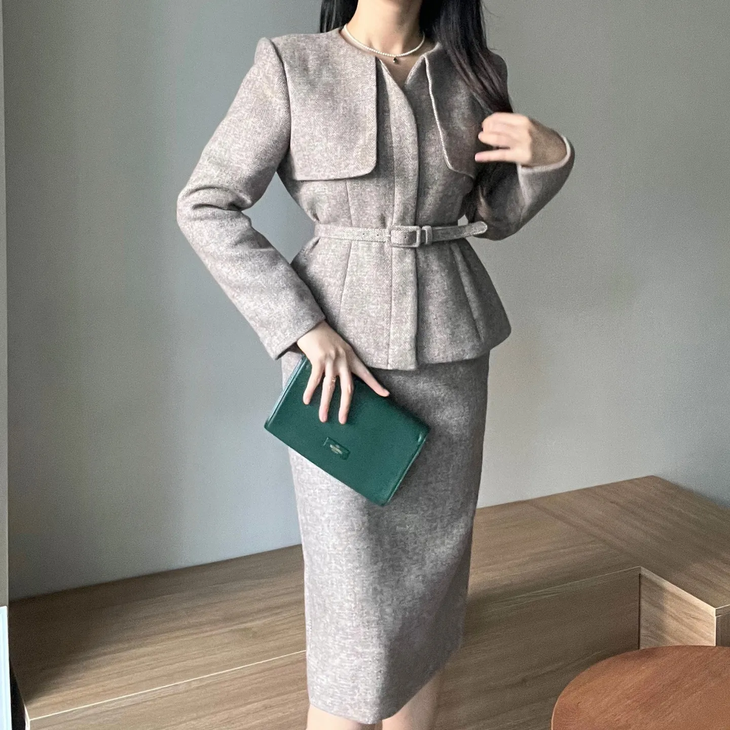 ラウンドネックノーカラースリットハイウエスト肩パッドペプラムスリムHライン長袖タックシークレットボタンダブルボタン無地ツーピース(トップス、ボトムス)スカートダブルジャケット