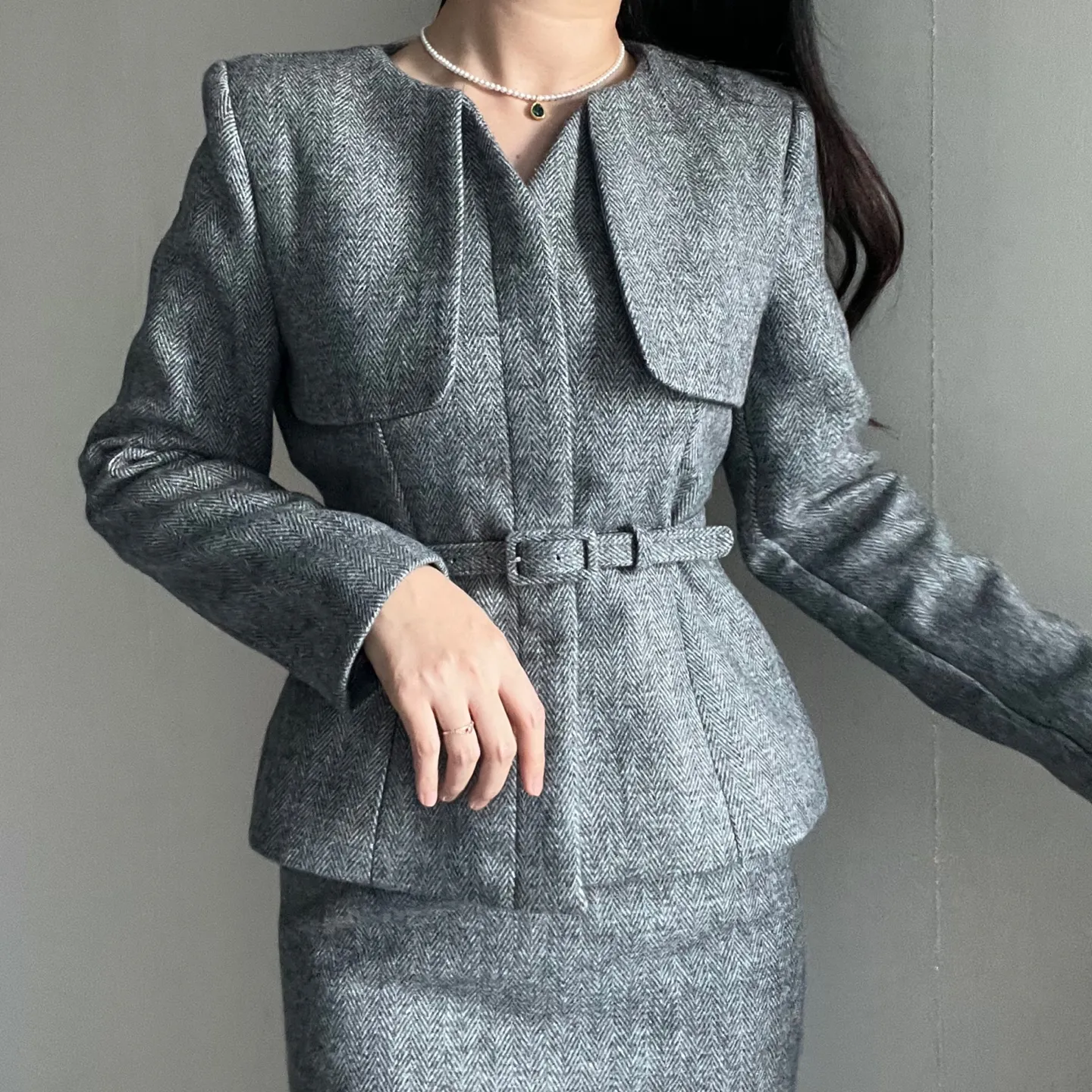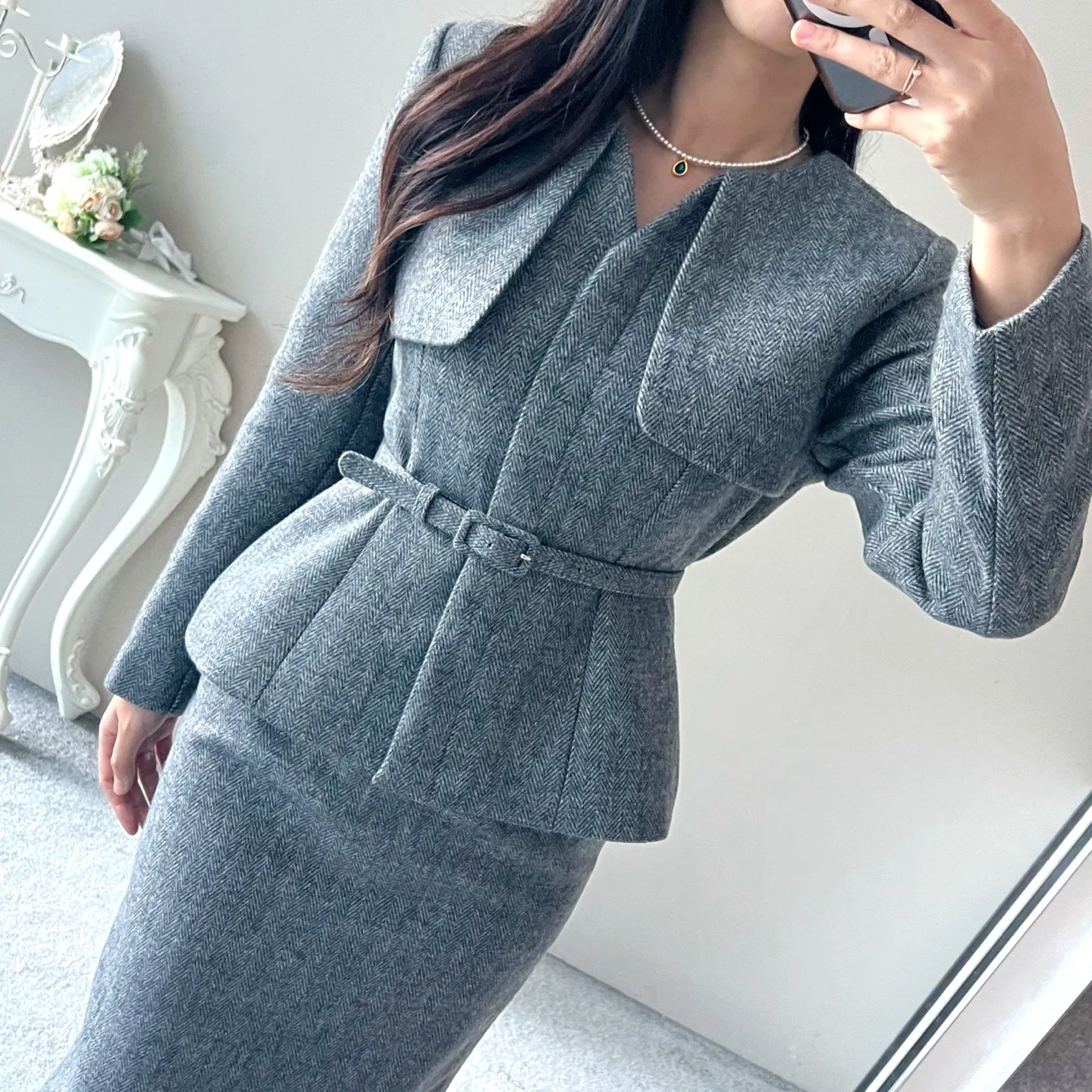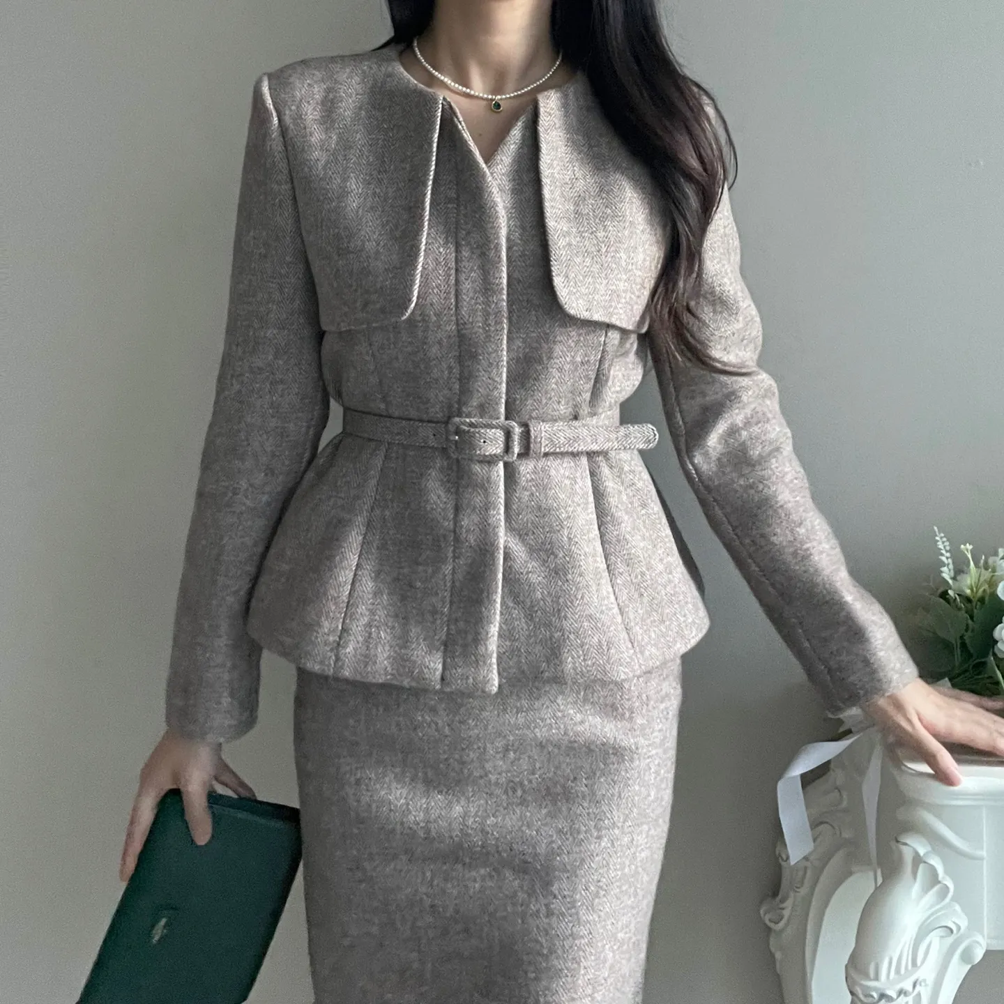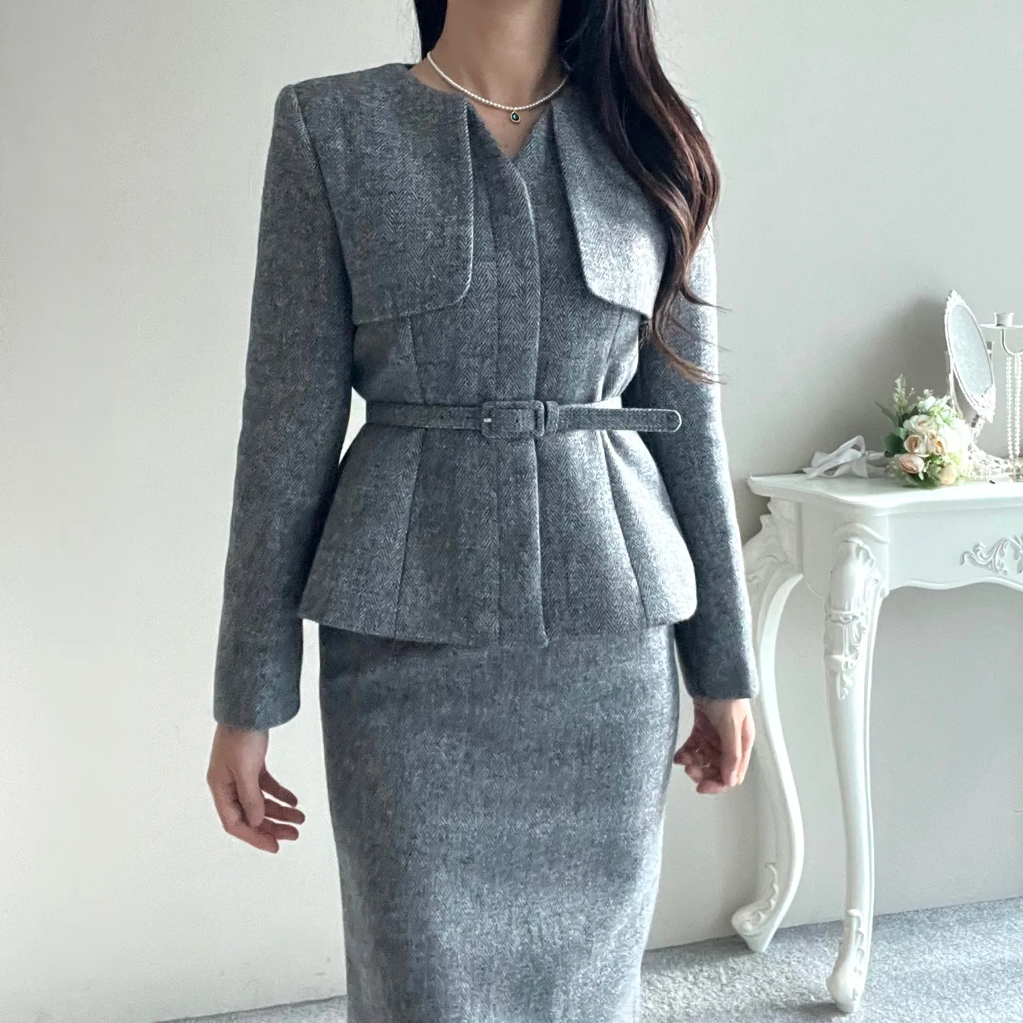 ベルト付ガンフラップヘリンボーンジャケット&IラインスカートSET・p696605