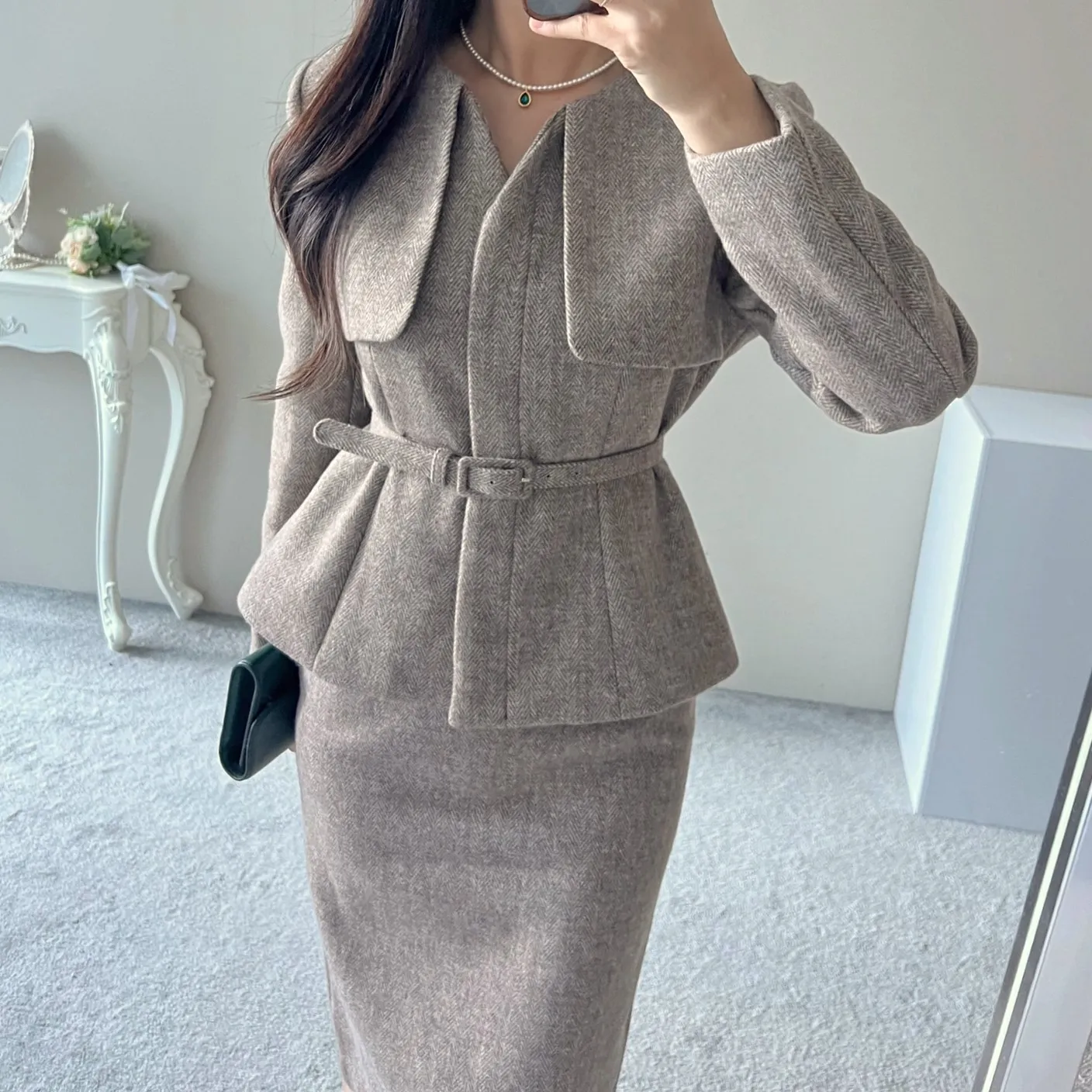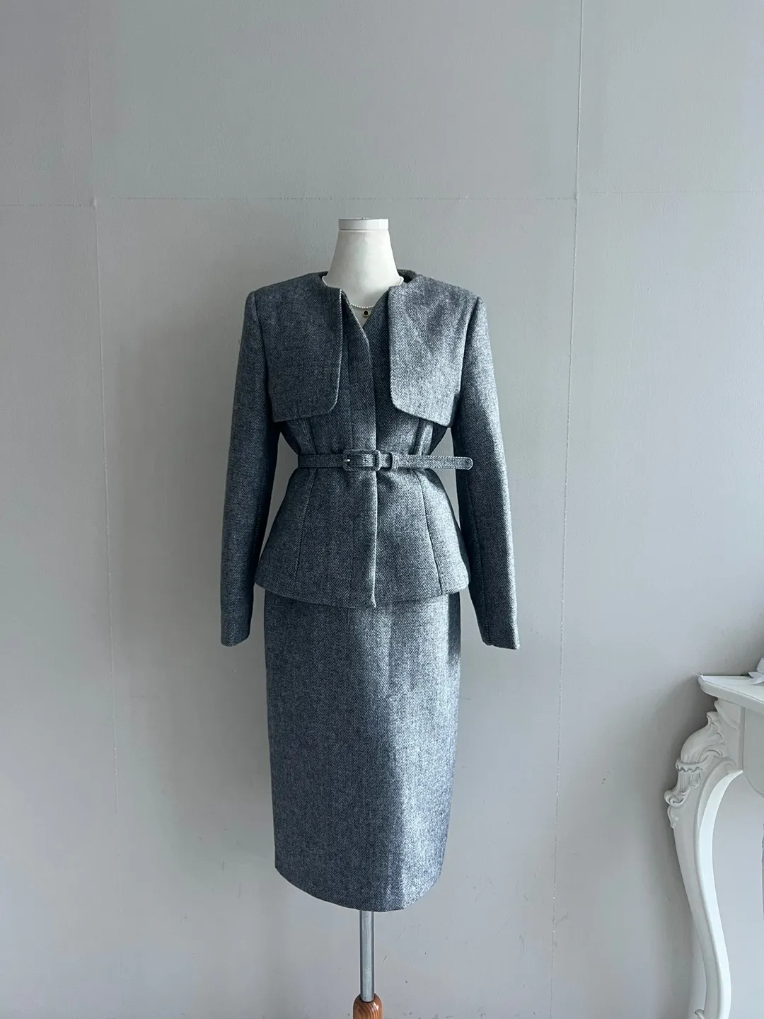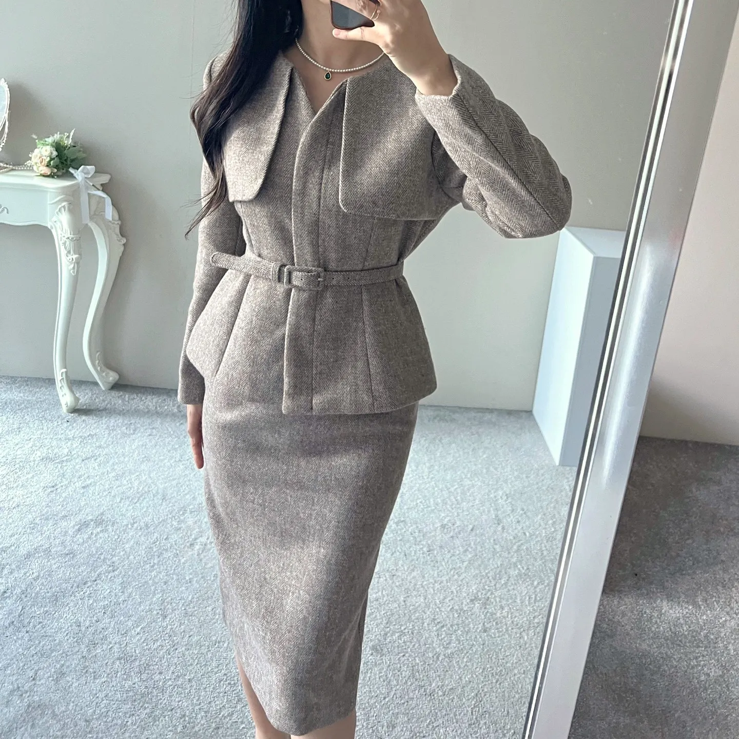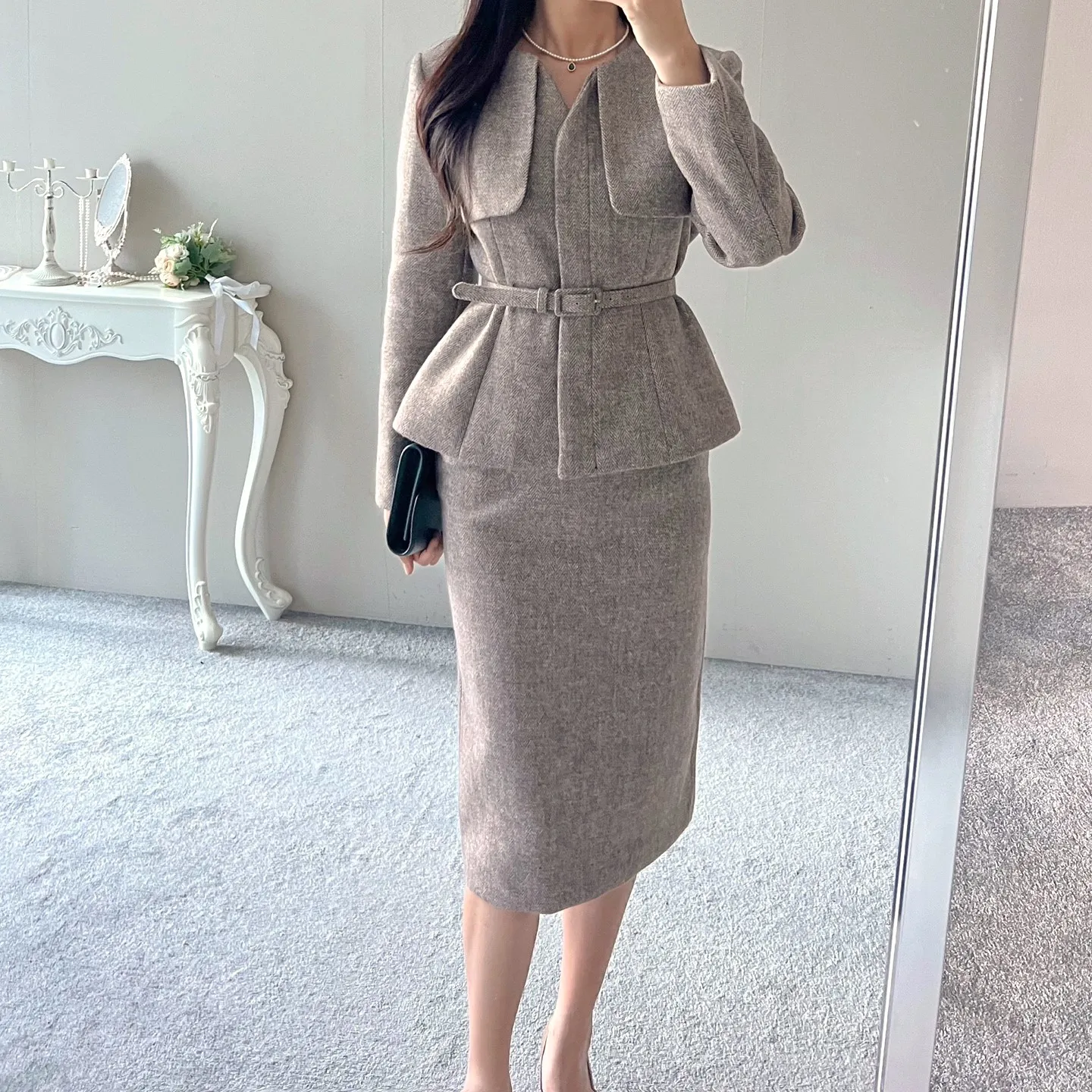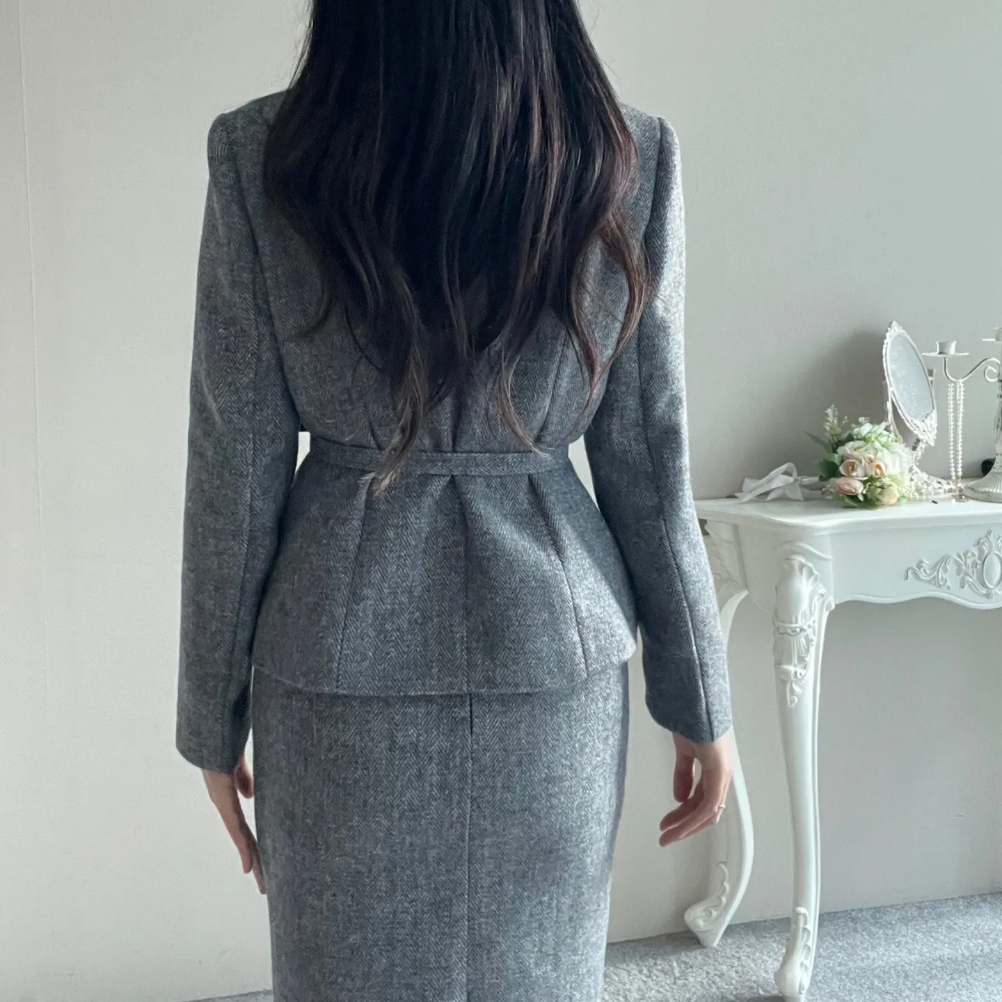 ベルト付ガンフラップヘリンボーンジャケット&IラインスカートSET・p696605