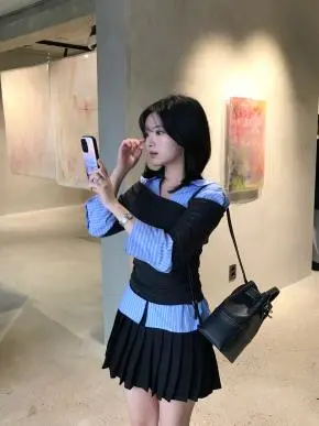 カラーシャツはニットやカーディガンと合わせると