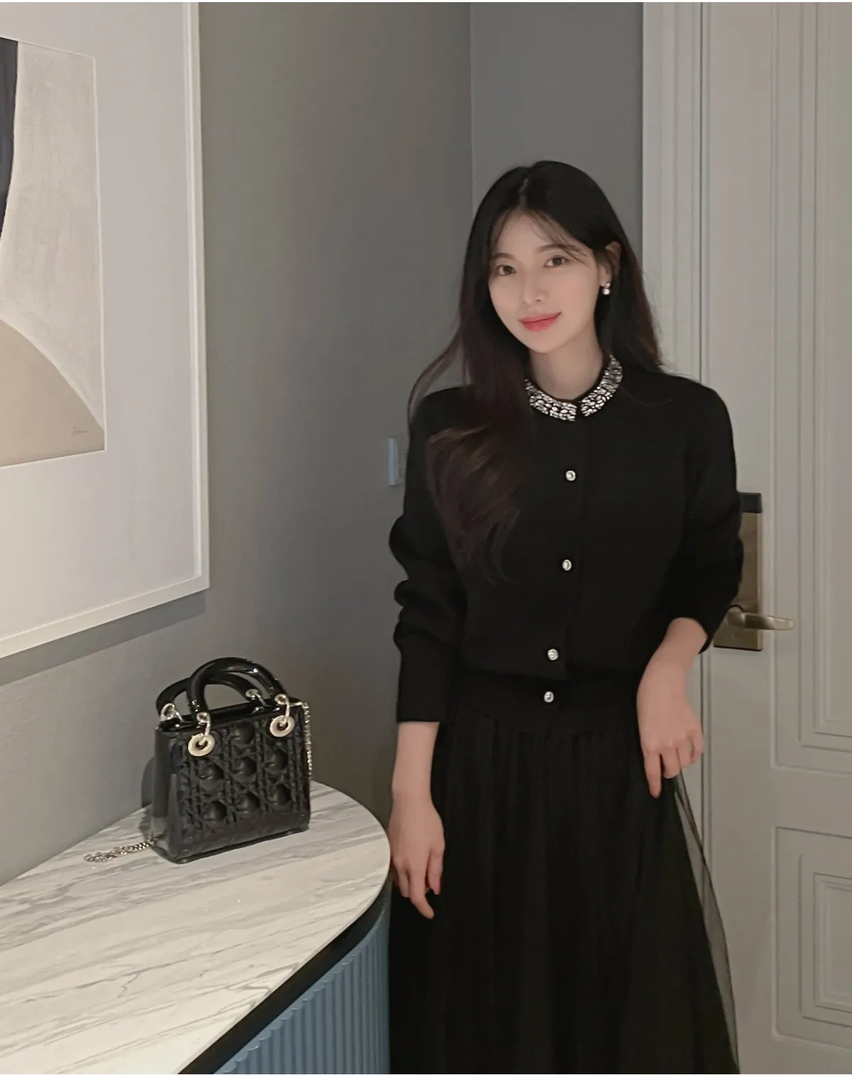 ネックラインのキュービック装飾は