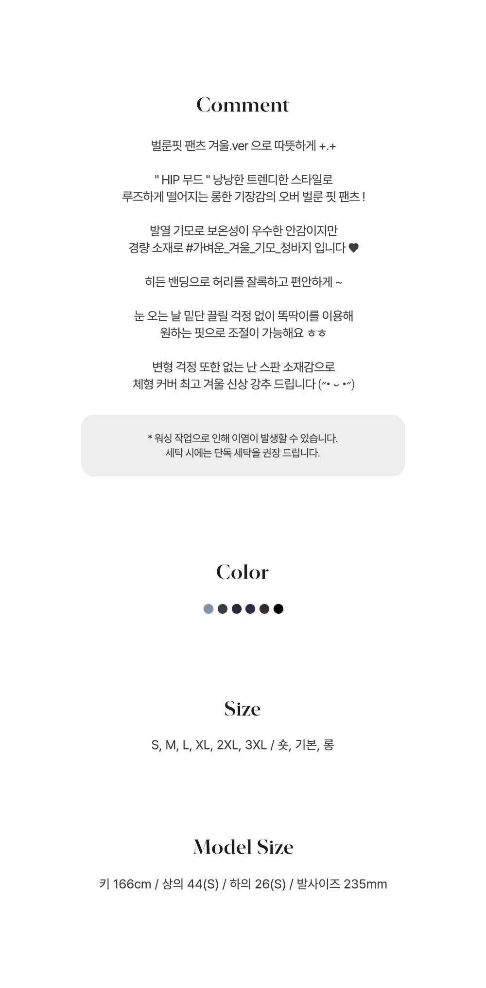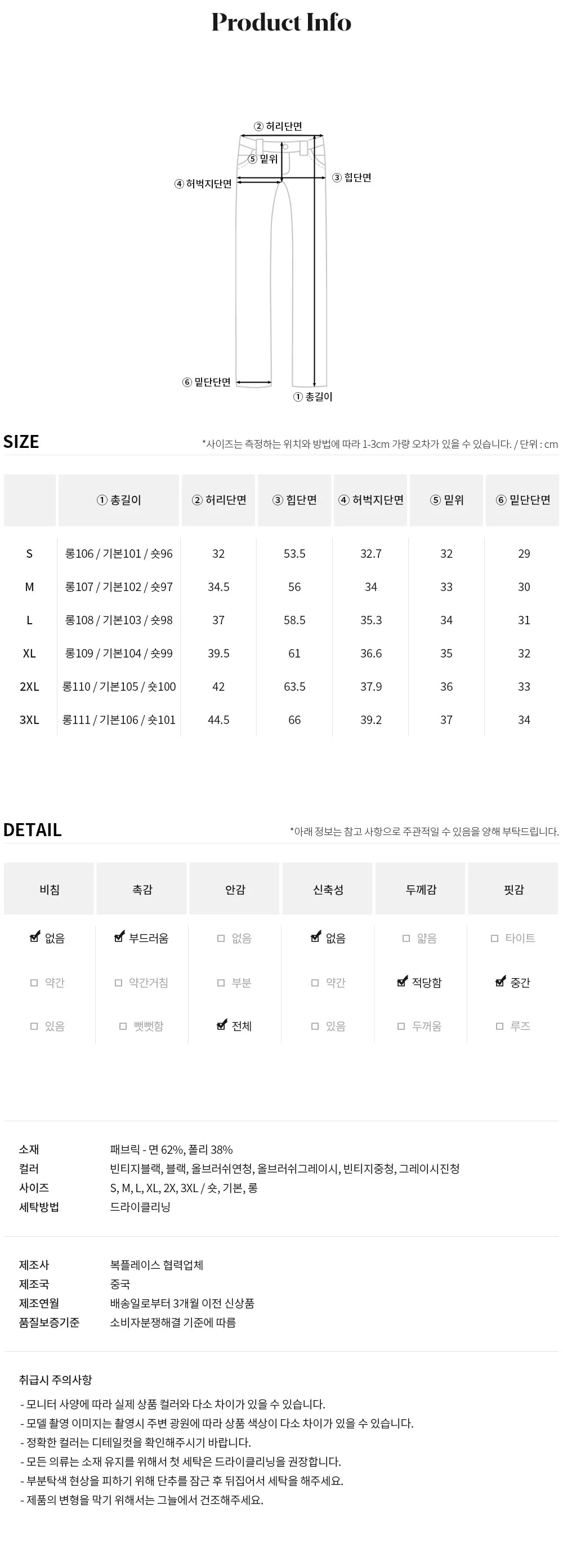 Size | ウエスト | ヒップ | 裾幅 | わたり | 股上 | 着丈 |