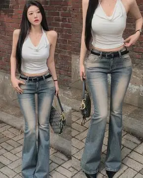 デニムポケットフラップポケットバックポケットループジップアップバックルローライズ骨盤パッドウォッシングブーツカットライトブルーデニムパンツ