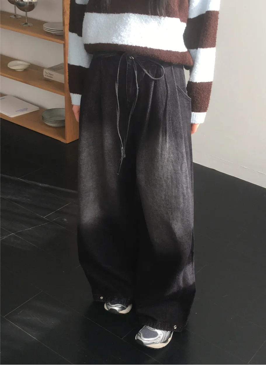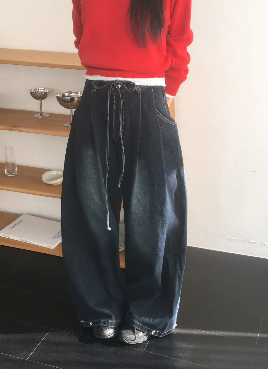 デニムベーシックショートループリベットジップアップリボン(固定)ワイドバックポケットポケットフラップポケットウォッシングディープブルーデニムパンツ[選べる丈]