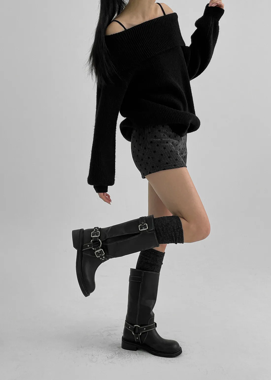 リブ長袖スリムオフショルダーニット