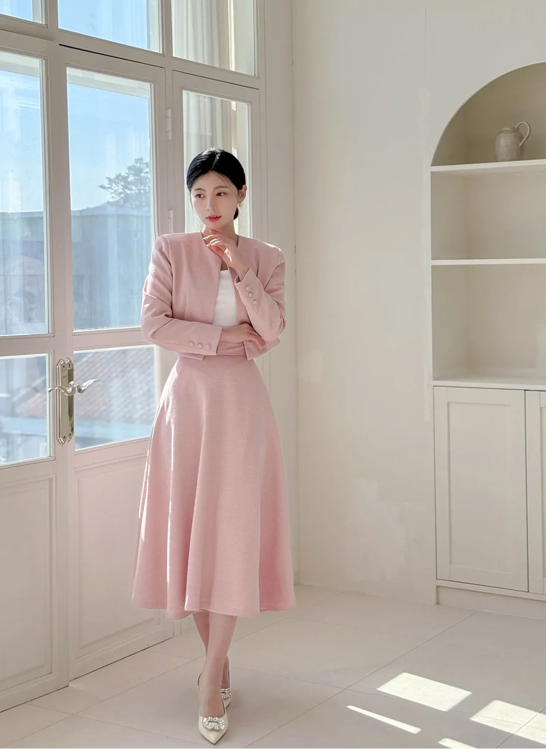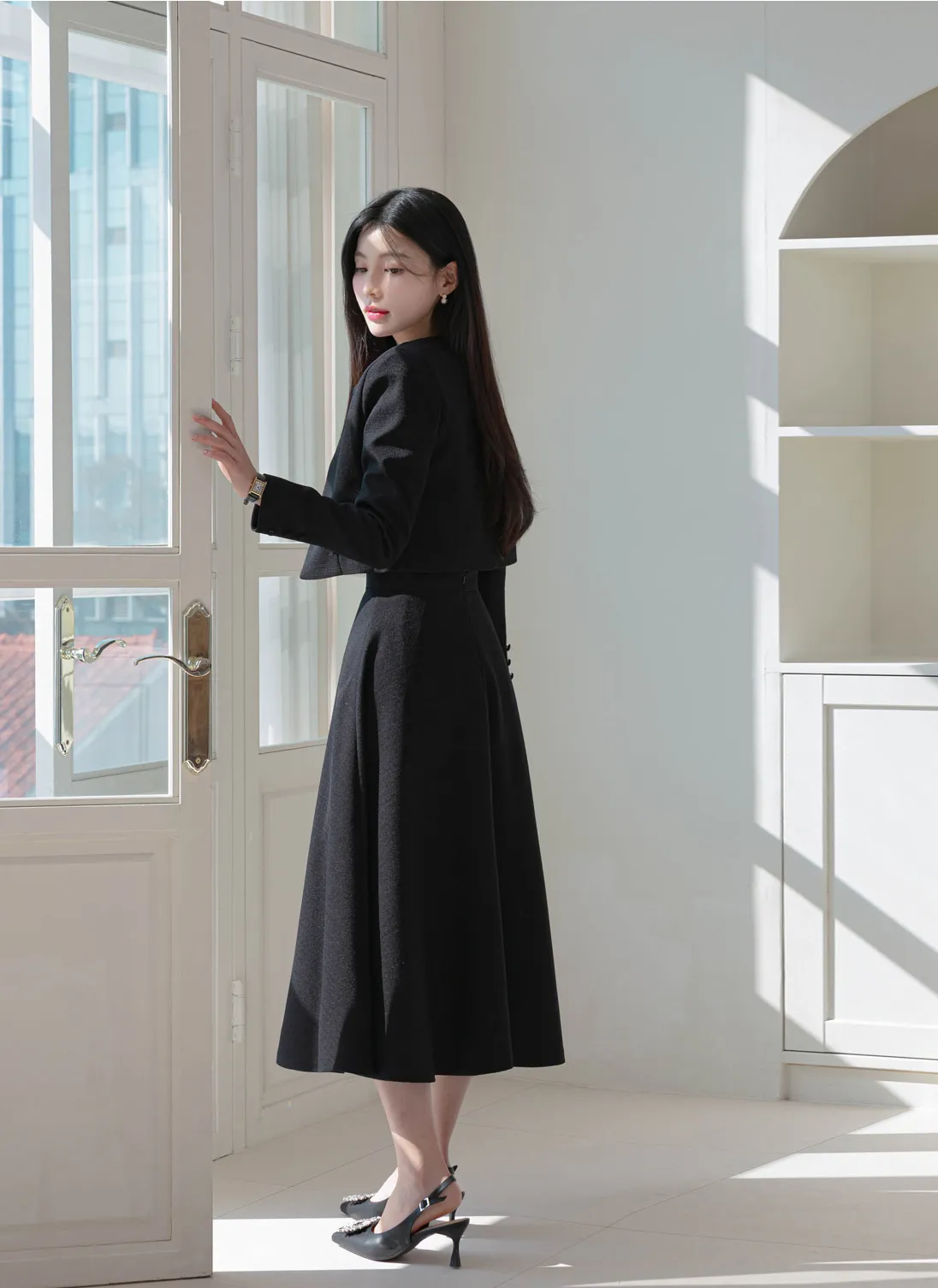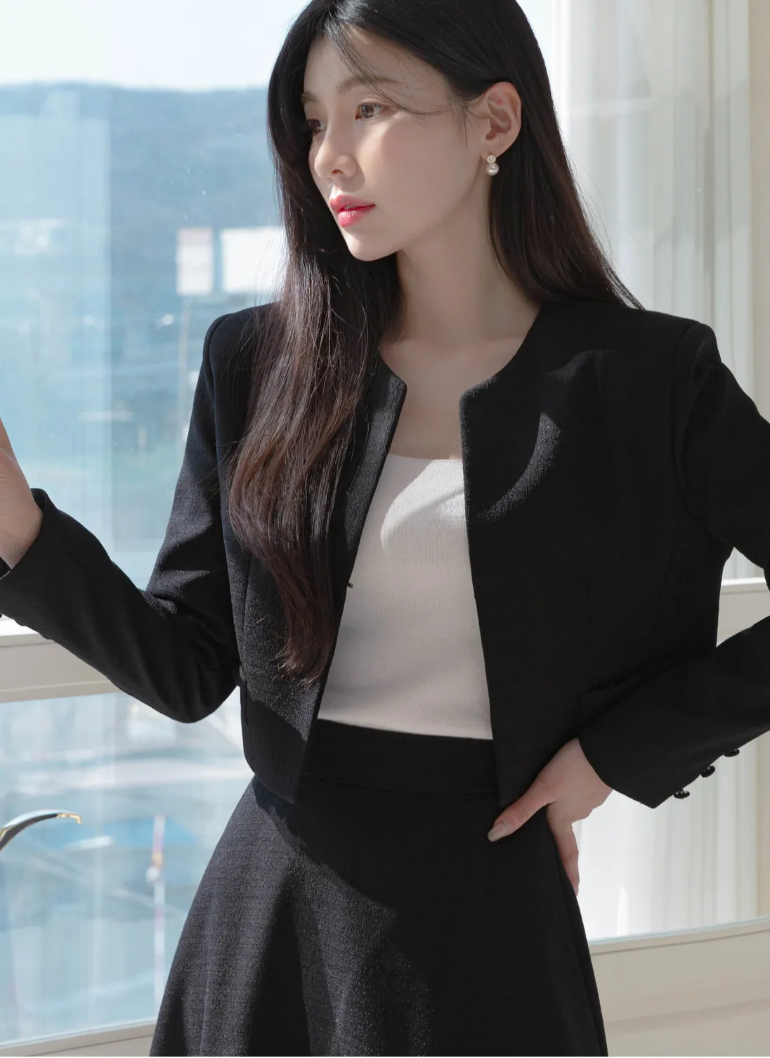 カラークロップドロングAラインフレアボタンスリーブジップアップパフスリーブ肩パッドスナップボタンパール調ボタン無地ツーピース(トップス、ボトムス)スカートジャケットジャケット