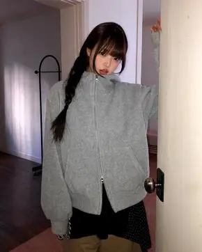 両起毛ソフト長袖フードルーズダブルジップポケットジップパーカー