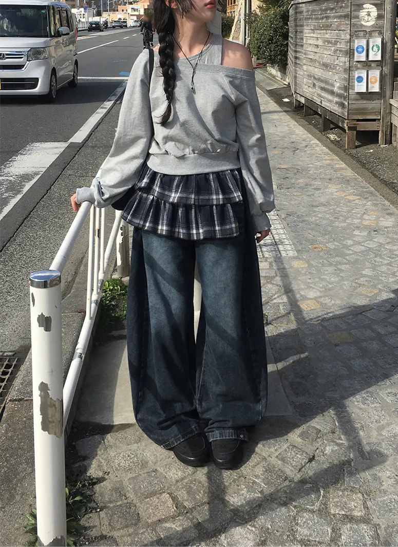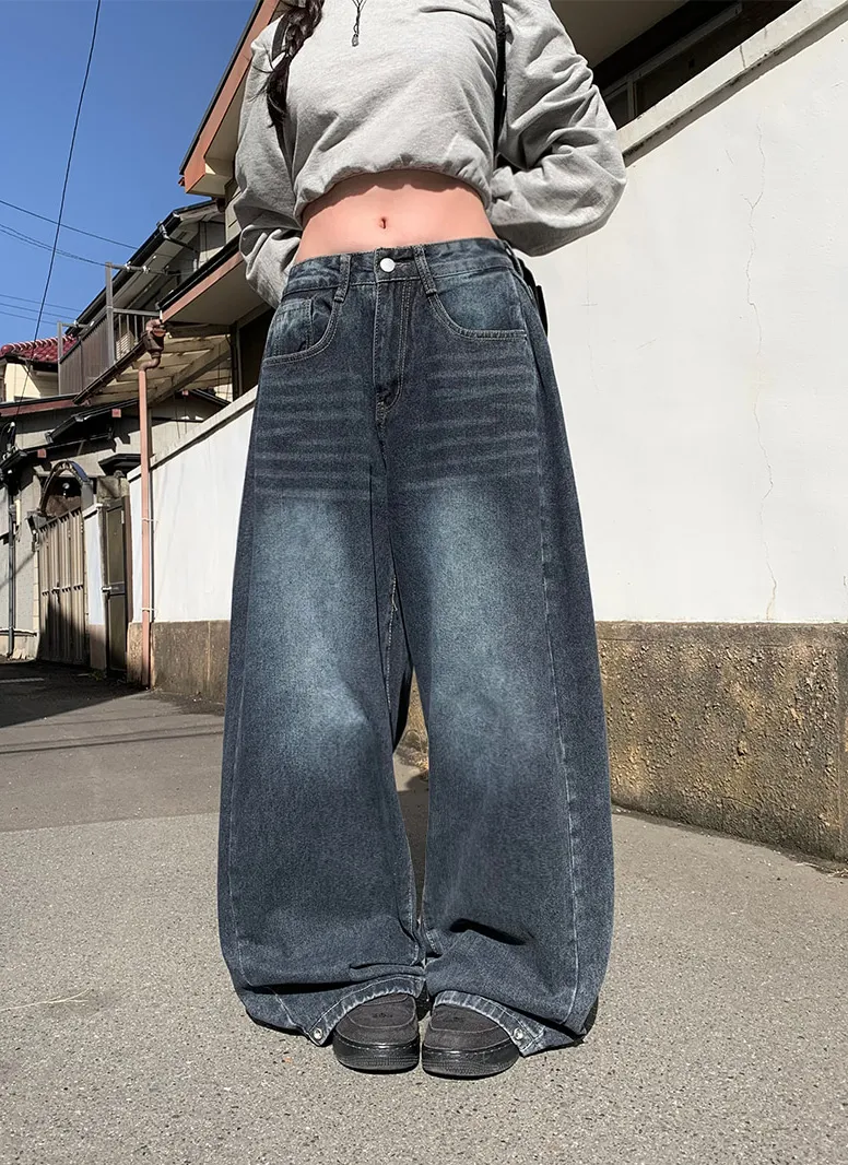 デニムベーシックショートループリベットジップアップリボン(固定)ワイドバックポケットポケットフラップポケットウォッシングディープブルーデニムパンツ[選べる丈]