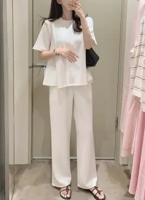 シアサッカーリンクル半袖ギャザーラウンドネックルーズオーバーサイズポケットAラインロングスリット後ボタンウエストゴムメロウブラウススカートツーピース(トップス、ボトムス)