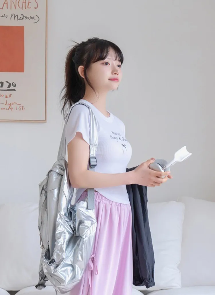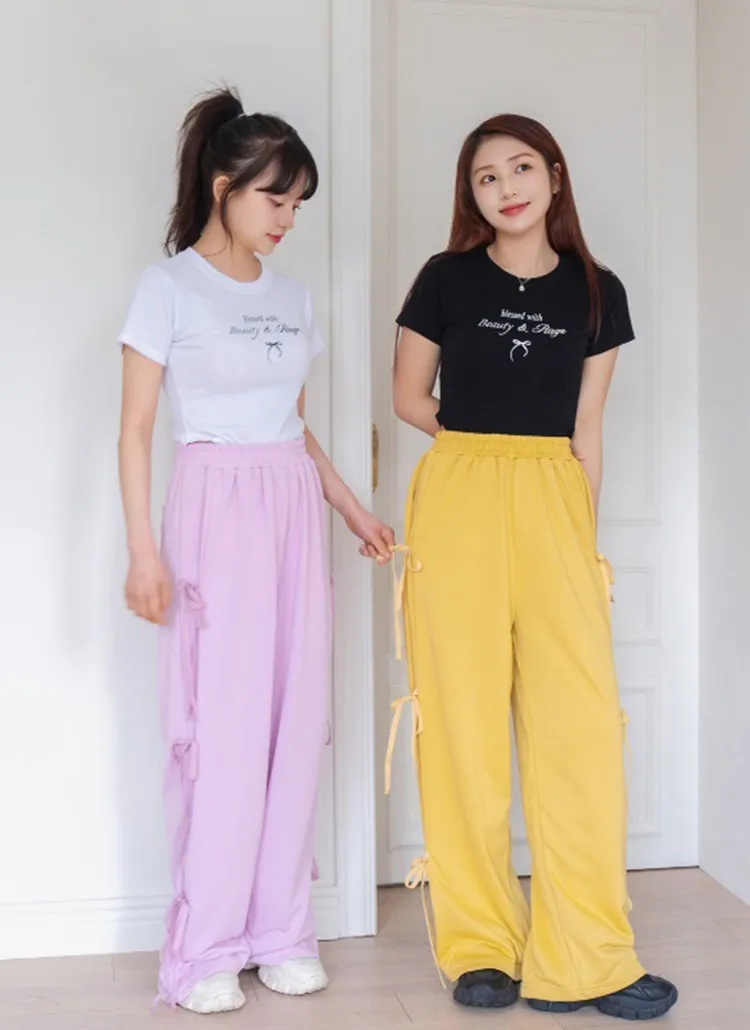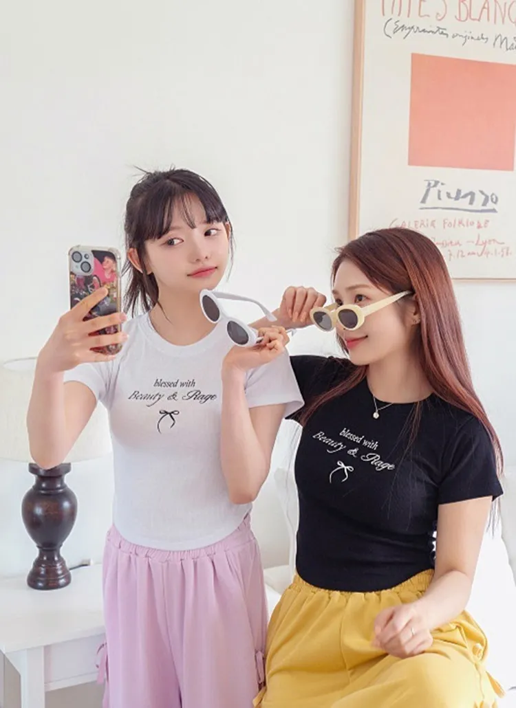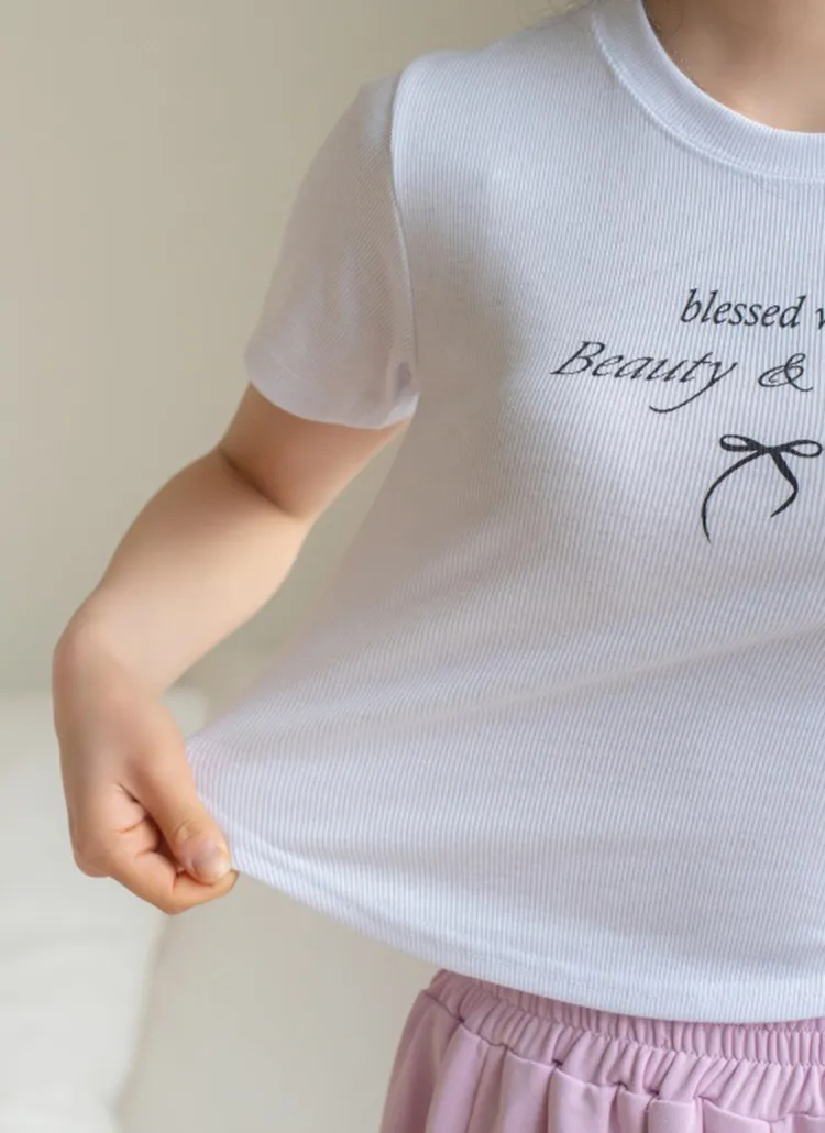 リボンレタリングラウンドヘムリブ半袖Tシャツ・B021895