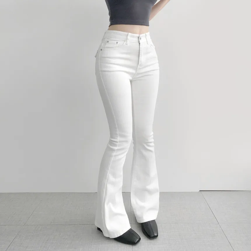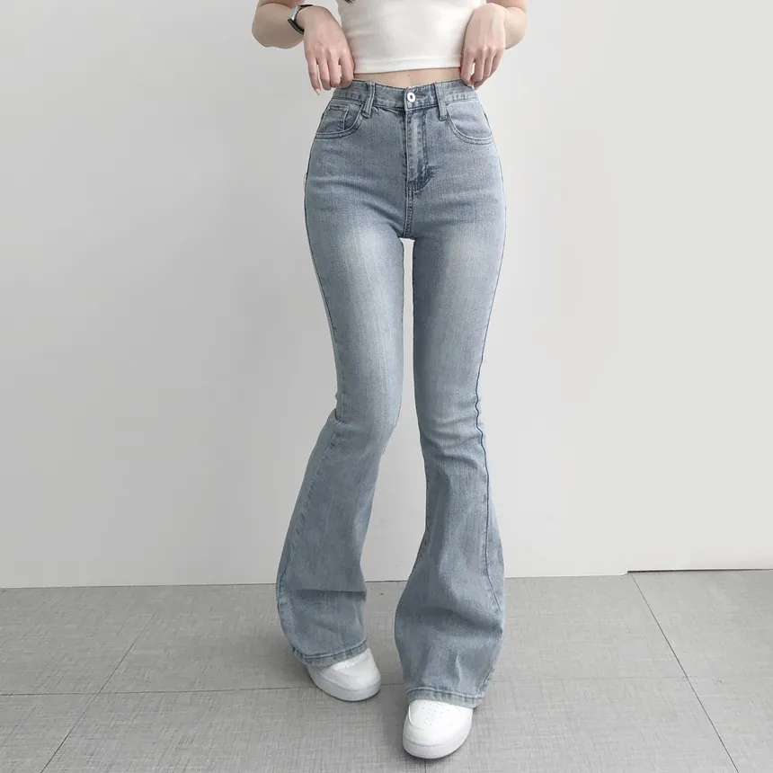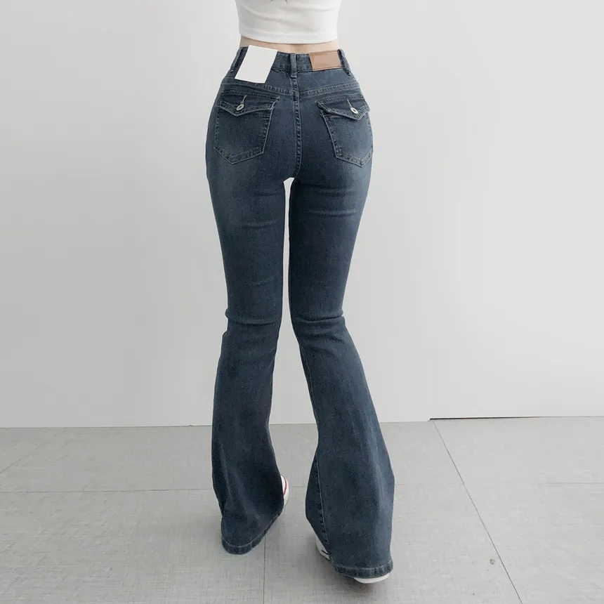 ストレッチデニムジップアップバックルウォッシングポケット骨盤パッドスリムロングフラップポケットリベットループバックポケットブーツカットライトブルーデニムパンツ