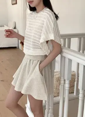 シアサッカーリンクル半袖ギャザーラウンドネックルーズオーバーサイズポケットAラインロングスリット後ボタンウエストゴムメロウブラウススカートツーピース(トップス、ボトムス)