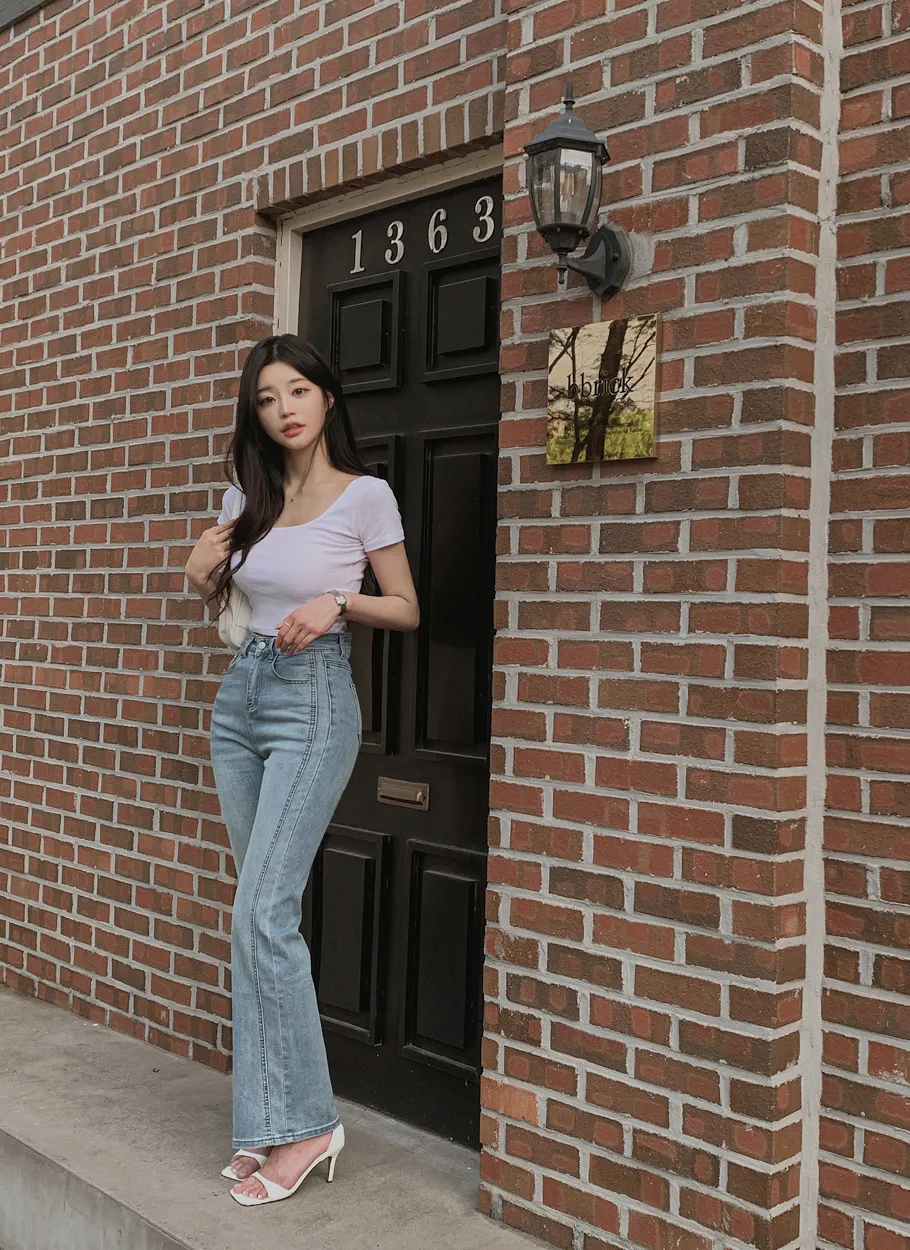 ストレッチデニムジップアップバックルウォッシングポケット骨盤パッドスリムロングフラップポケットリベットループバックポケットブーツカットライトブルーデニムパンツ