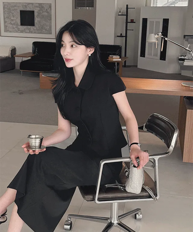 シルキーピンタックギャザースリムVネックドレープカウルネックヒドゥンジッパーストラップフレアAライン無地ノースリブラウススカートツーピース(トップス、ボトムス)