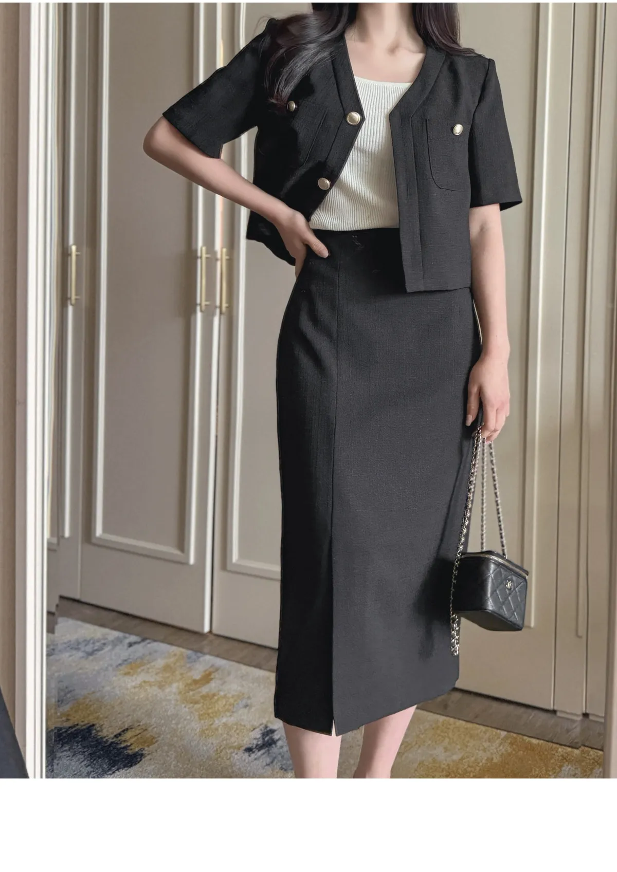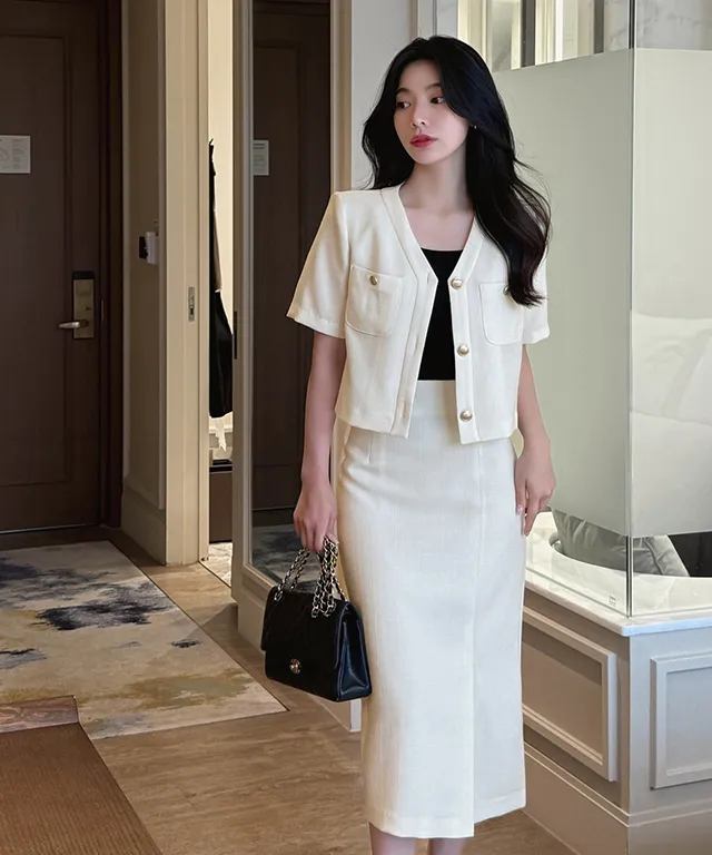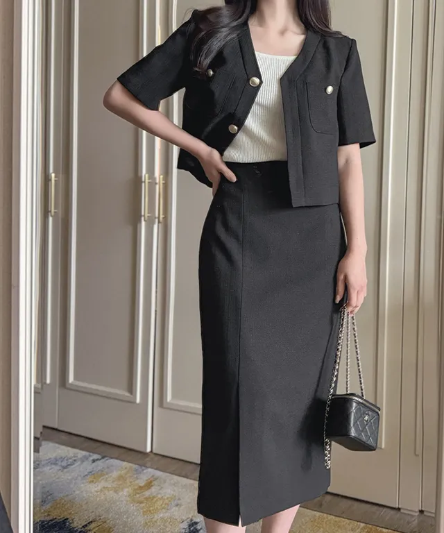 パフスリーブカラーラウンドネック長袖スリムペプラムビジューボタンラインボウタイバックゴムHライン(ロング丈)スリットラッフル無地ジャケットスカートツーピース(トップス、ボトムス)