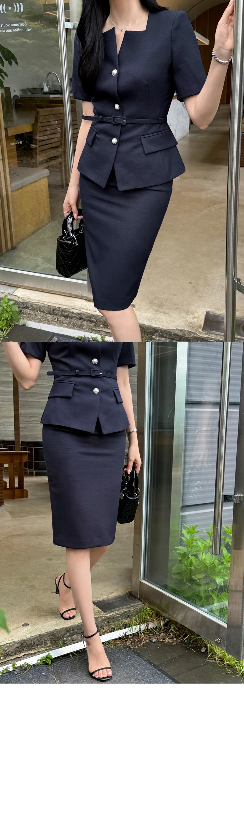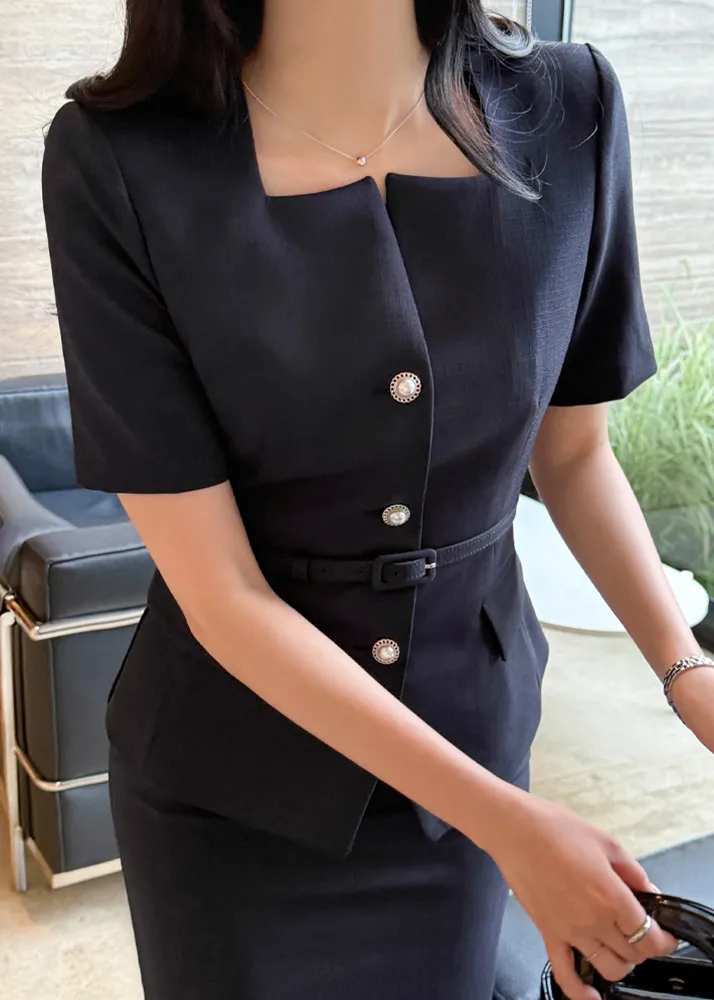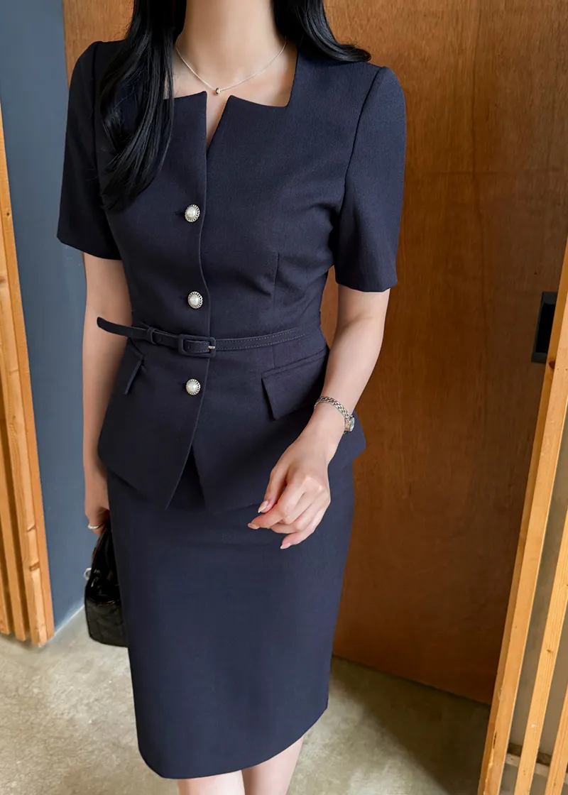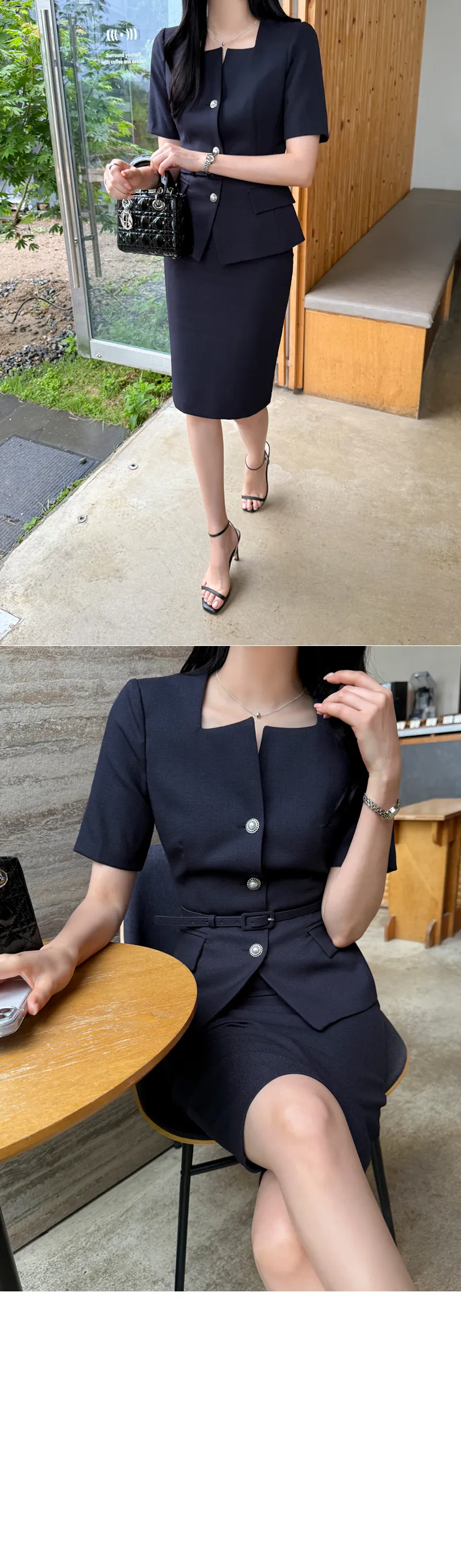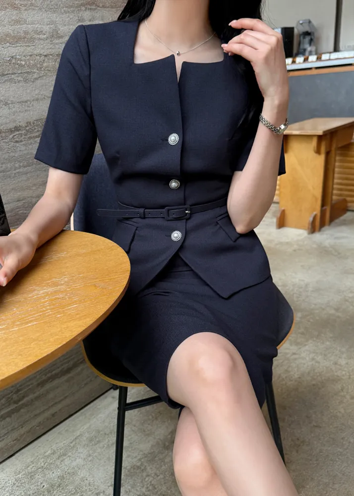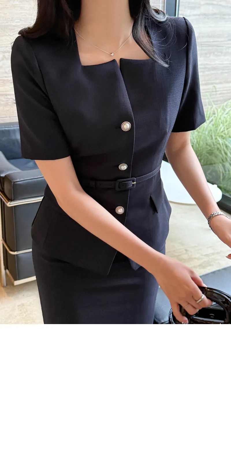 ツイードボタンラウンドネックノーカラーポケット肩パッドクロップド長袖フェイクポケットHライン(ロング丈)ヒドゥンジッパー無地ツーピース(トップス、ボトムス)スカートジャケット