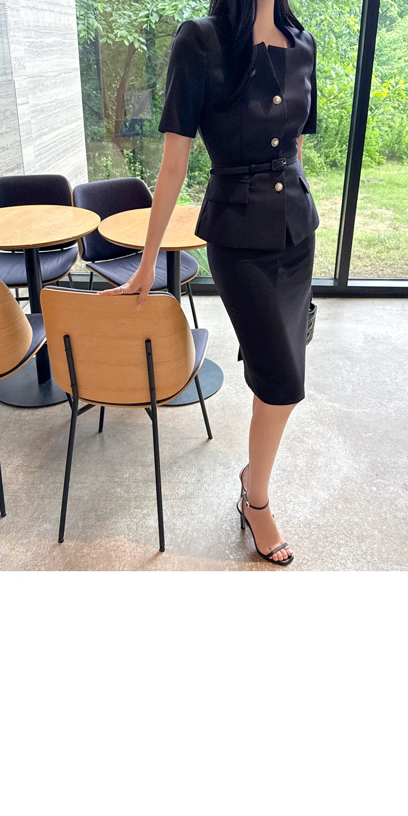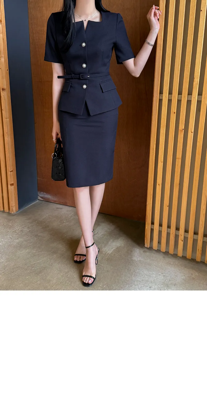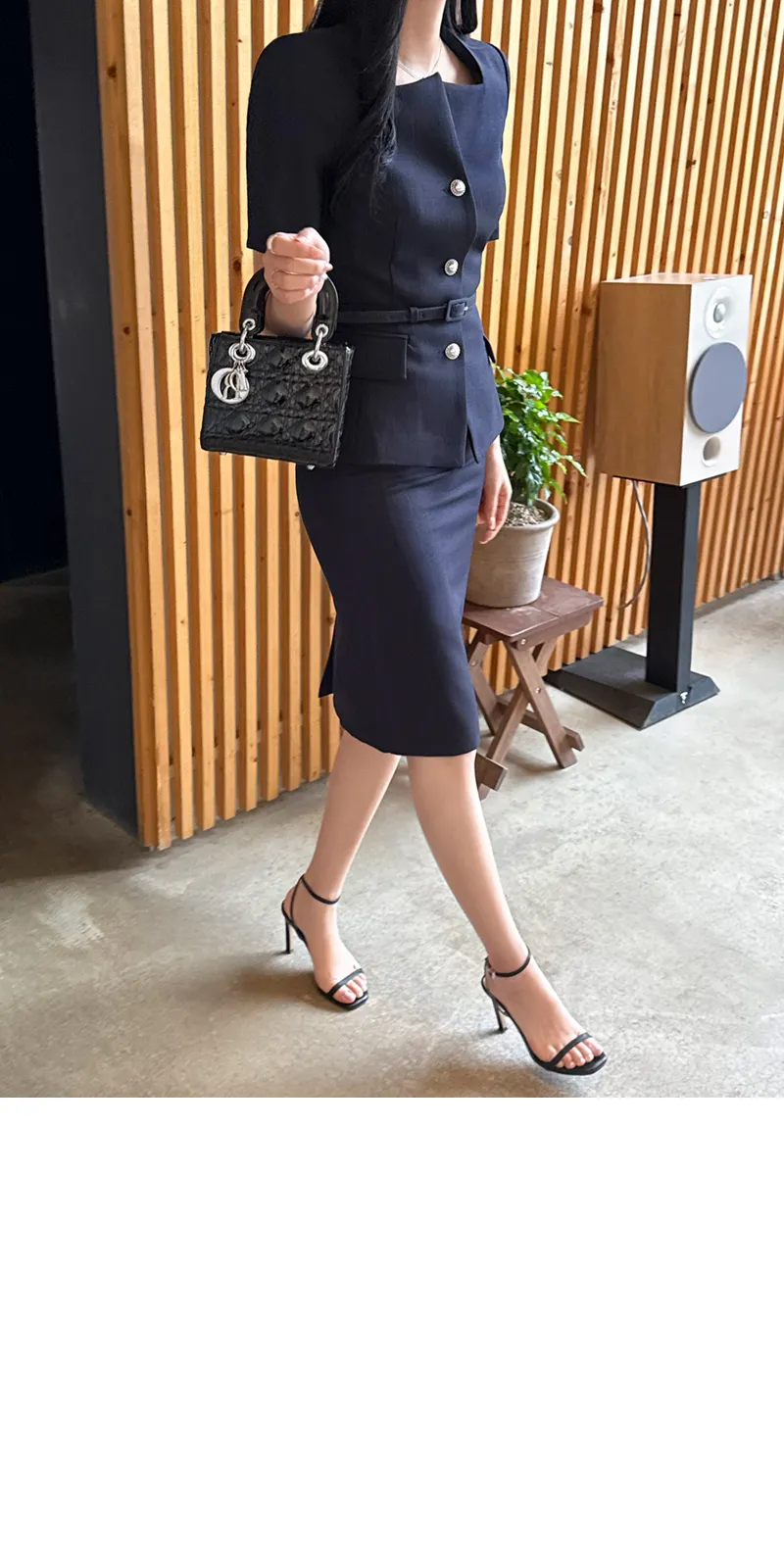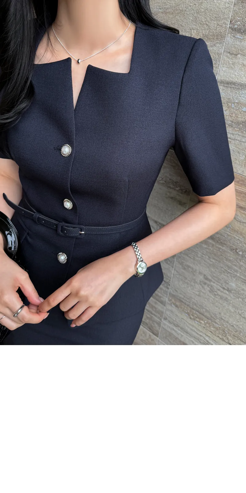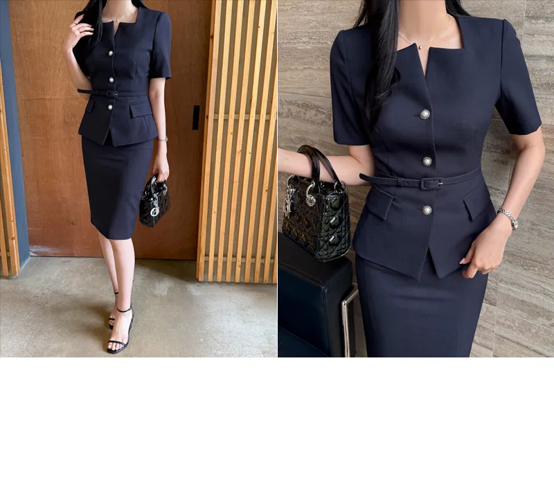 ツイードボタンラウンドネックノーカラーポケット肩パッドクロップド長袖フェイクポケットHライン(ロング丈)ヒドゥンジッパー無地ツーピース(トップス、ボトムス)スカートジャケット