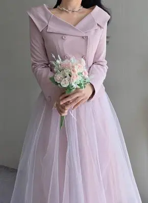 コンビチュールVネックダブルボタンボタンスリーブカラー長袖レイヤード風ロングAラインフレアヒドゥンジッパー肩パッド無地ジャケットスカートツーピース(トップス、ボトムス)ベルト付