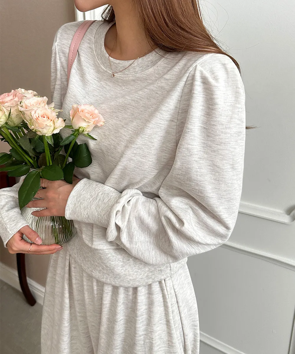 マンツーマンはシンプルなラウンドネックに、長めのリブ袖とポリューム感のあるショルダーパフをポイントにしました:)
