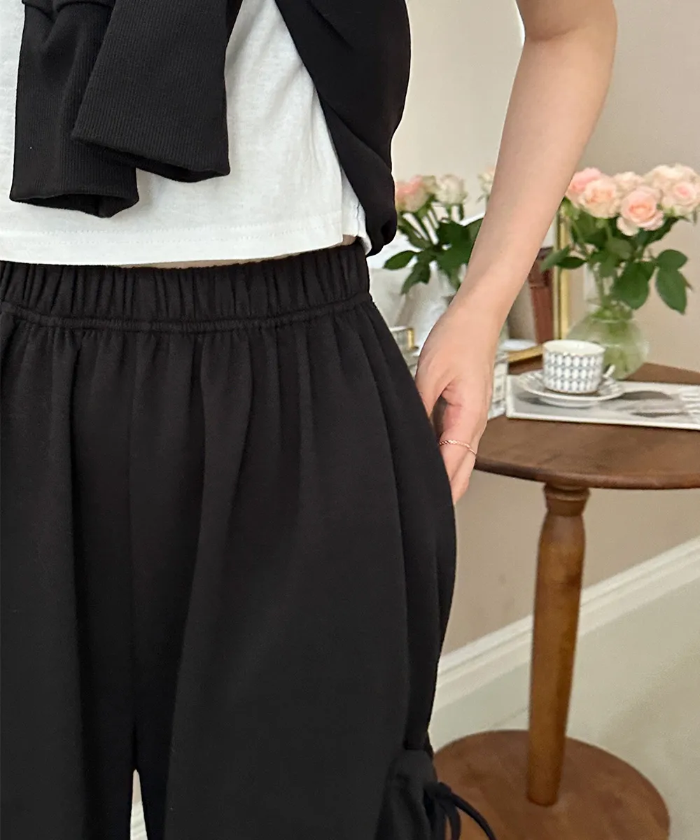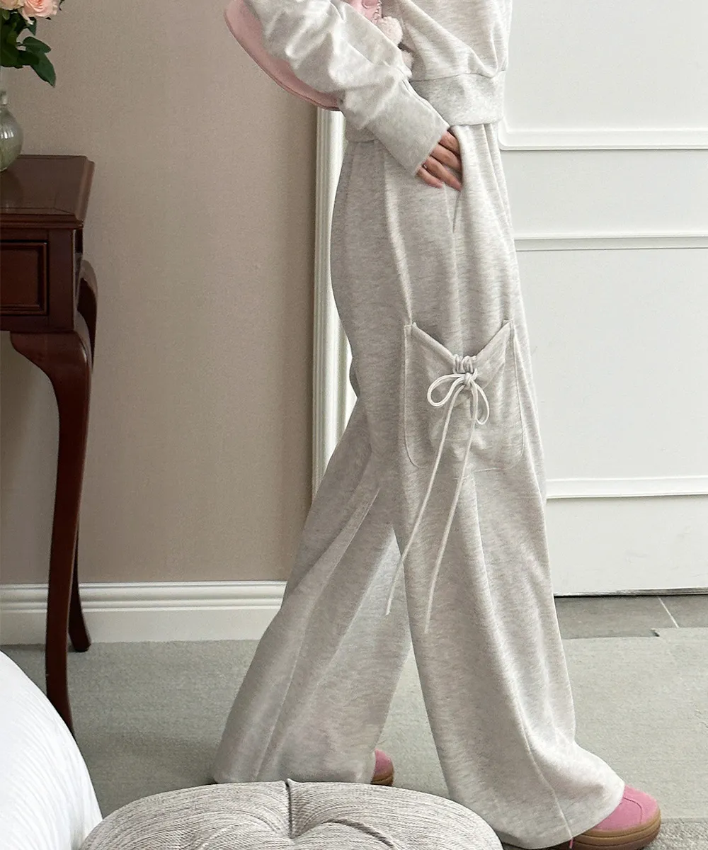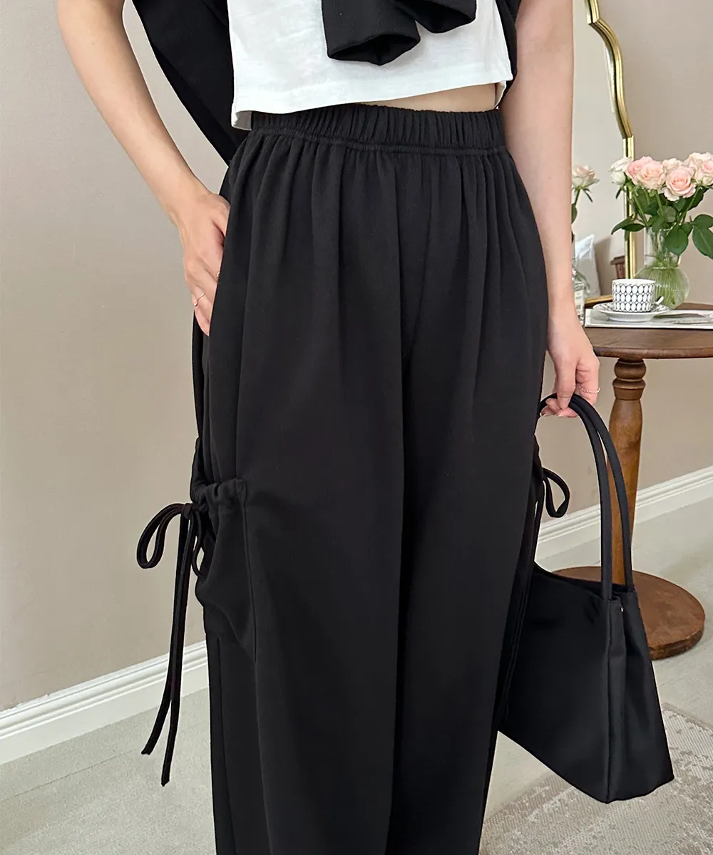 シンプルなワイドパンツにサイドポケットと可愛いリボンストラップを加え、 ユニークなポイントになるロングパンツに仕上げました:)