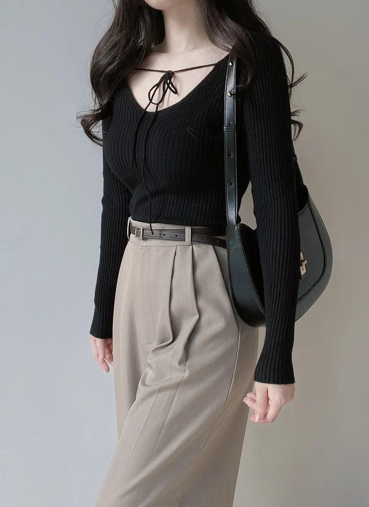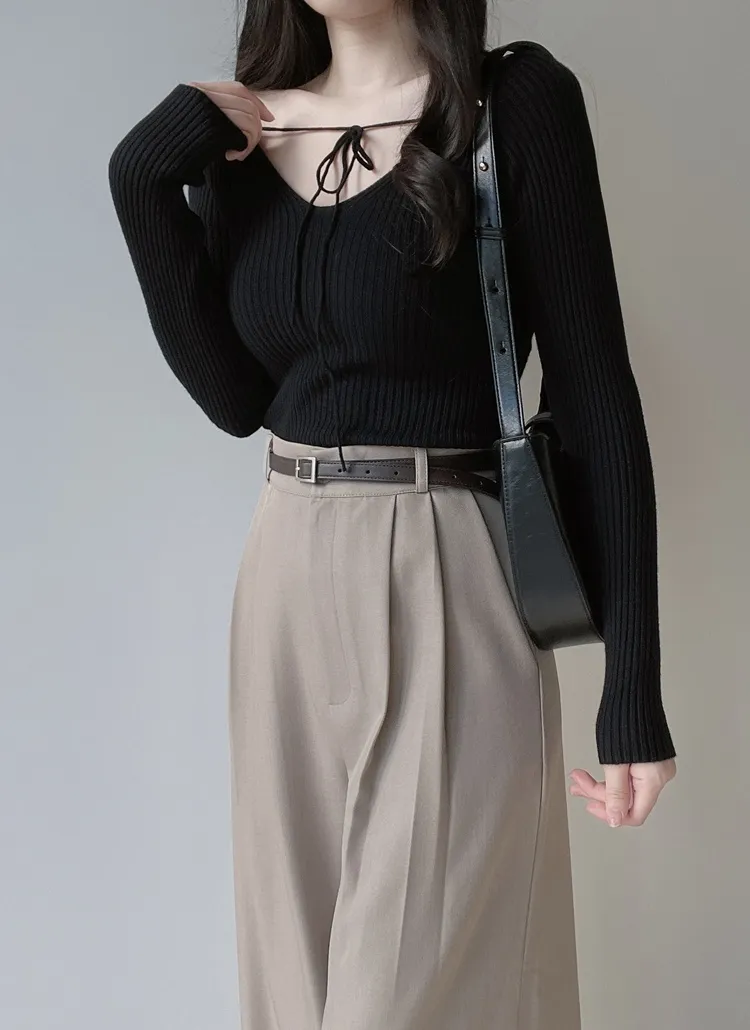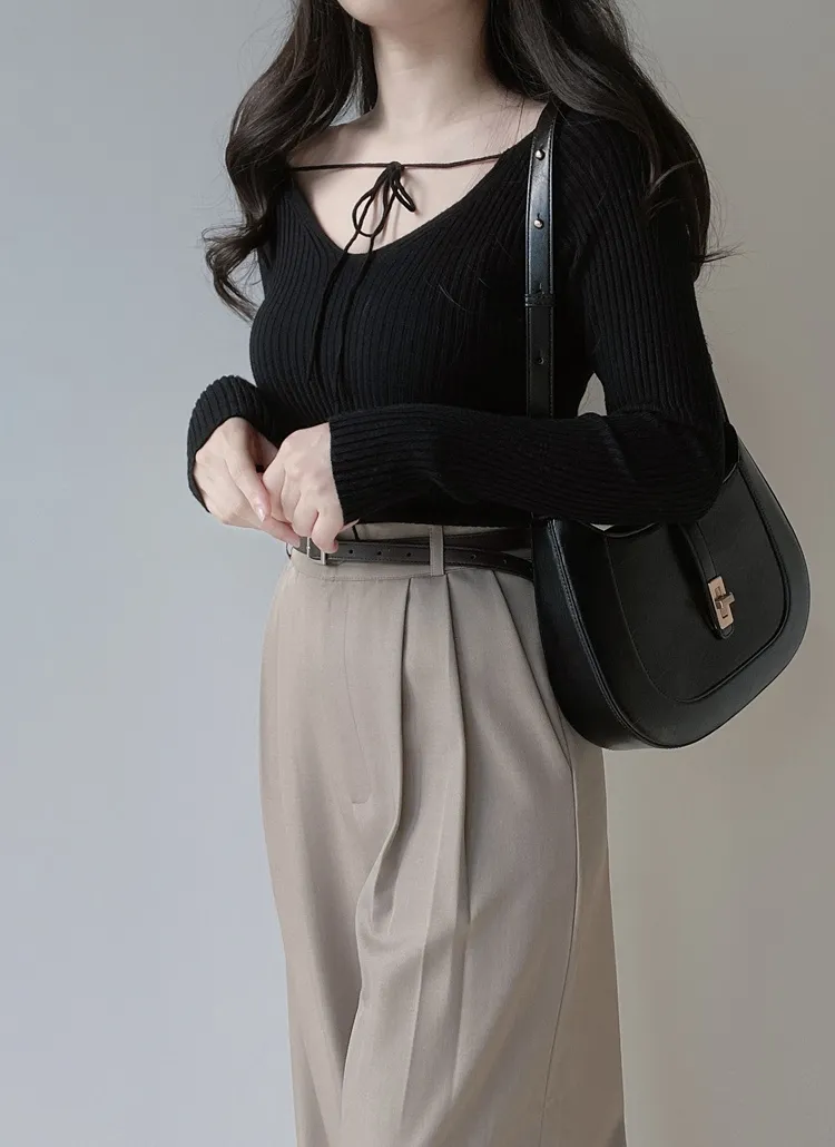 リブボタンラウンドネックカラーニット