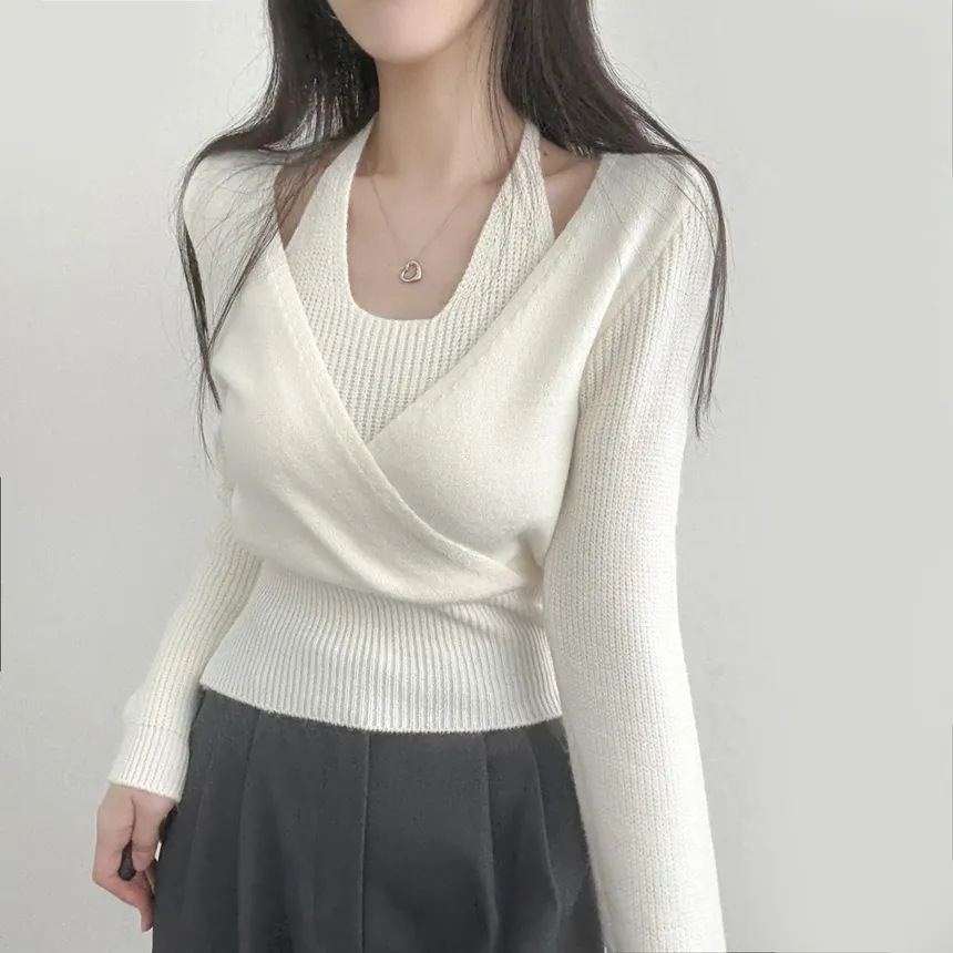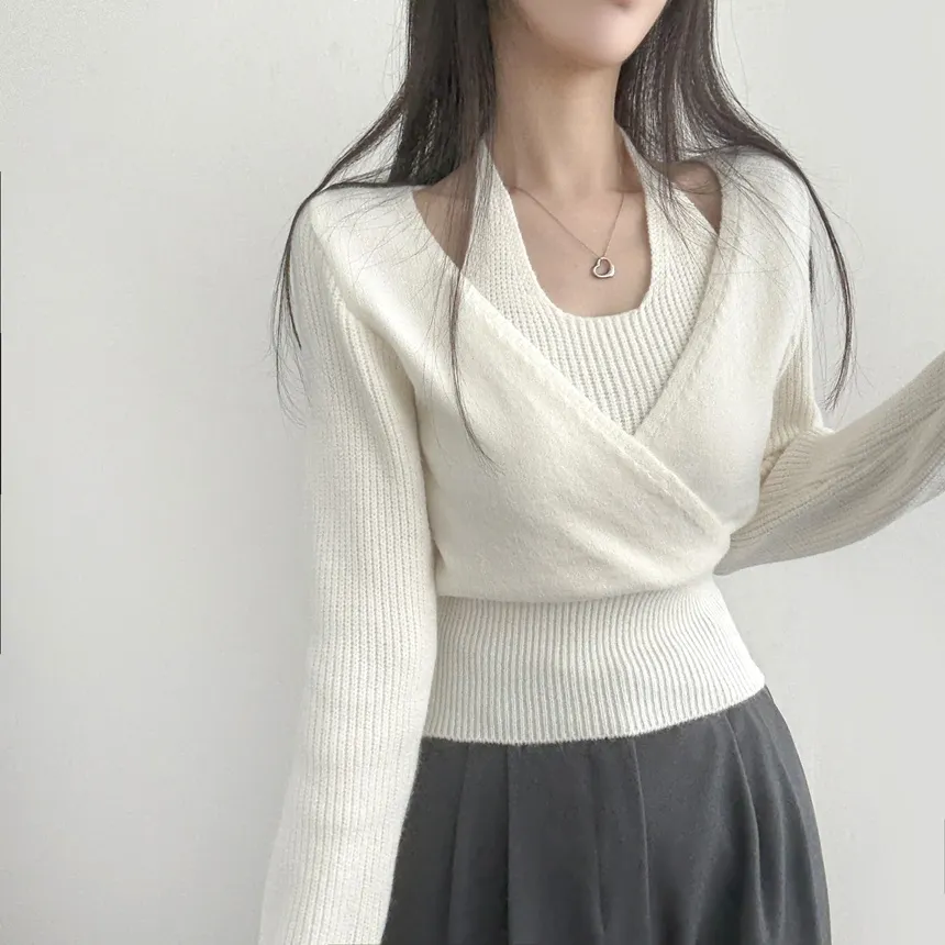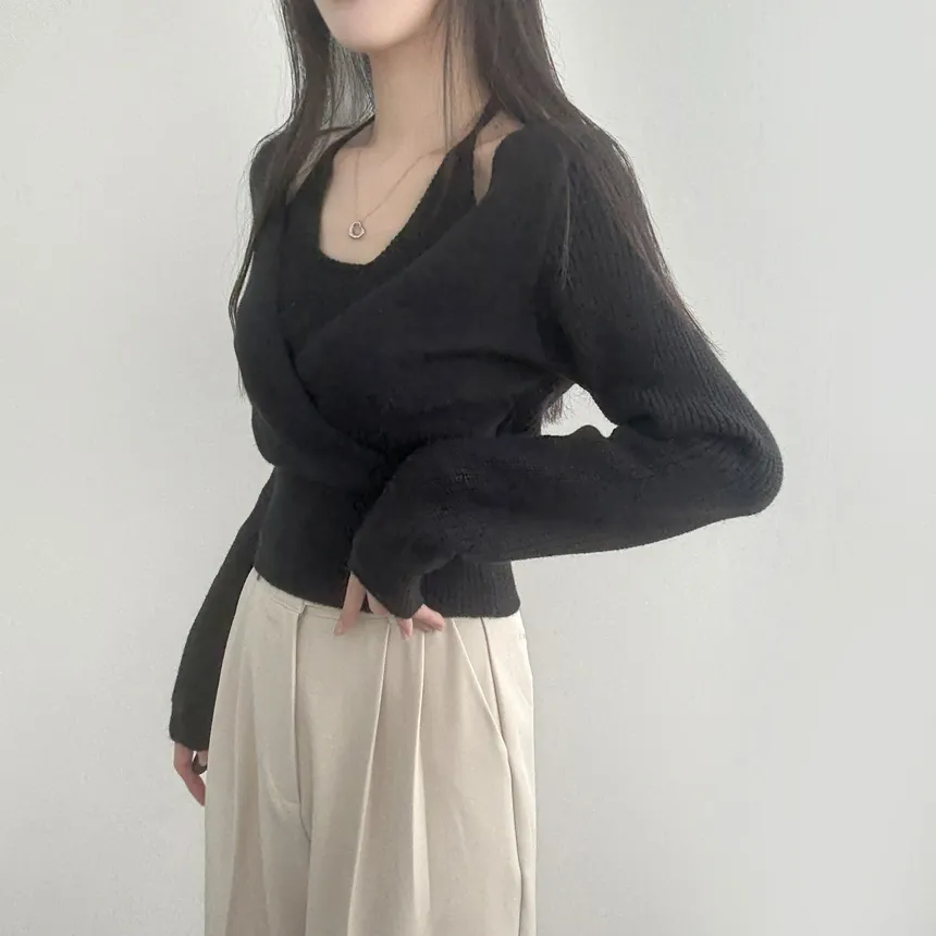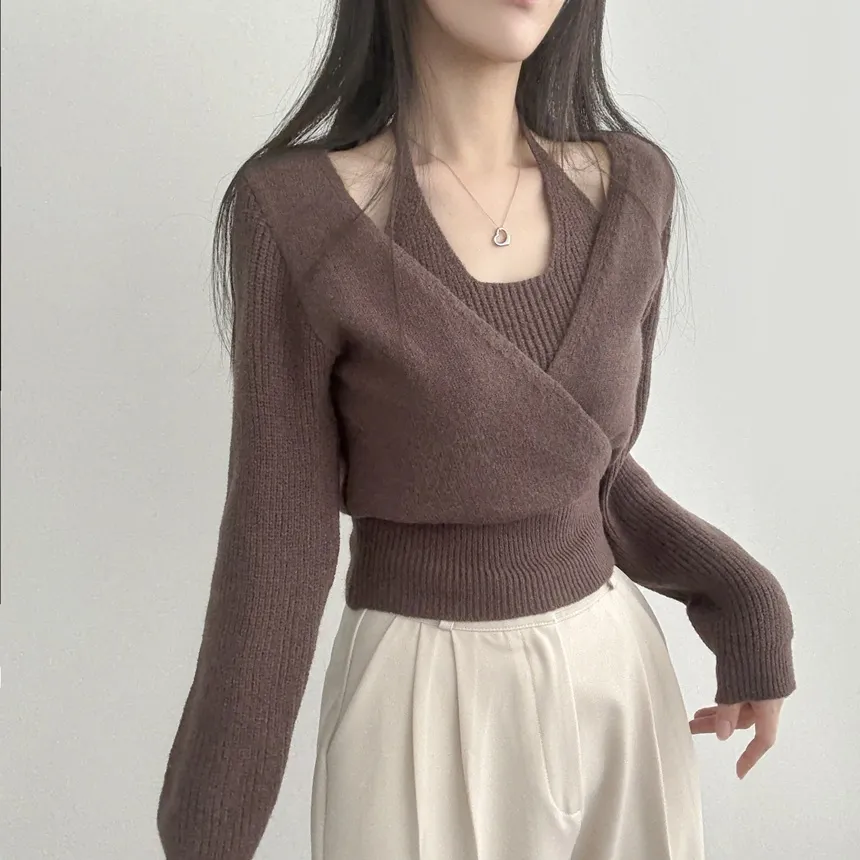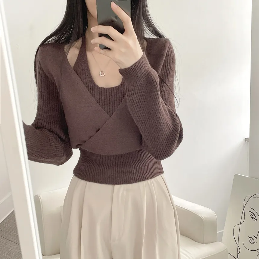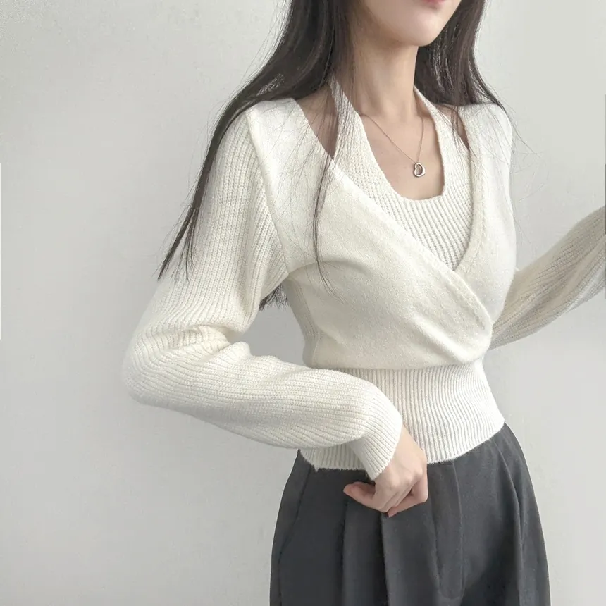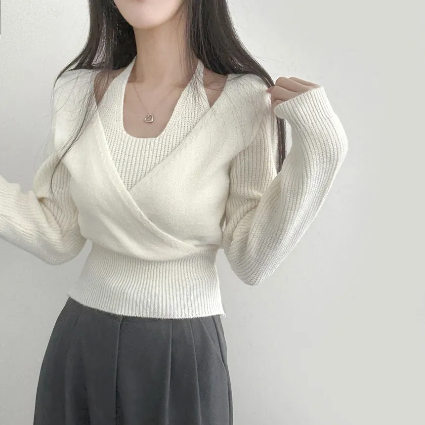 リブホルターネッククロップドレイヤード風ラップ調ニット・S1937755