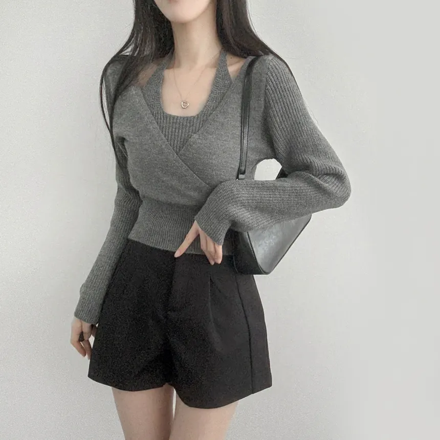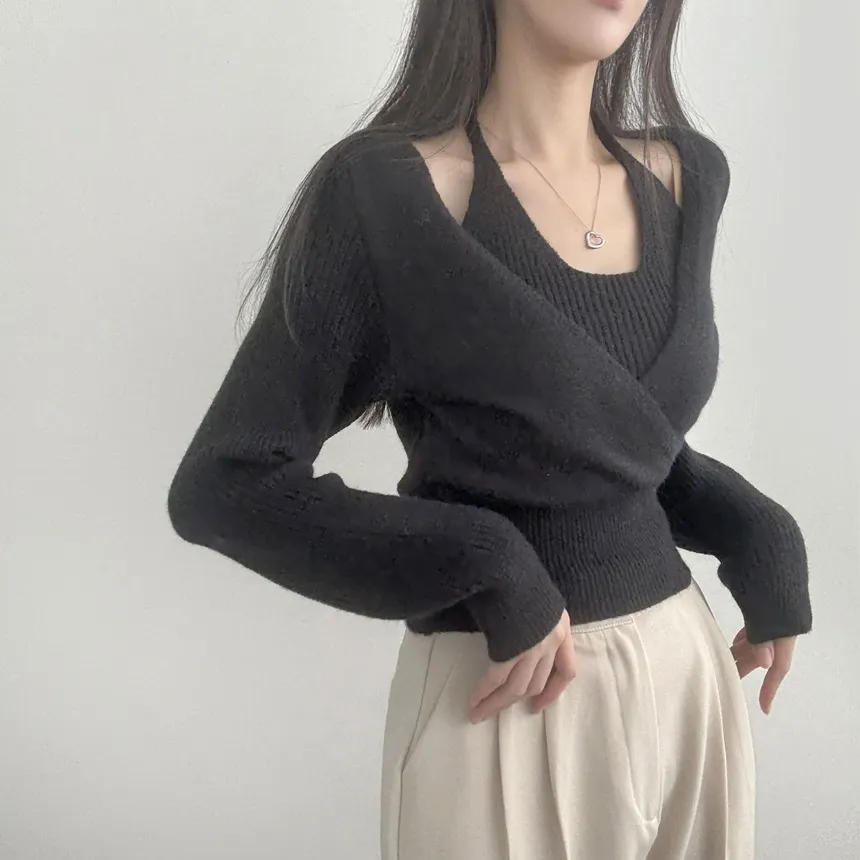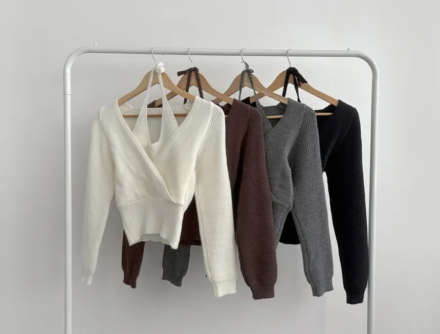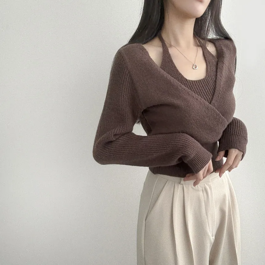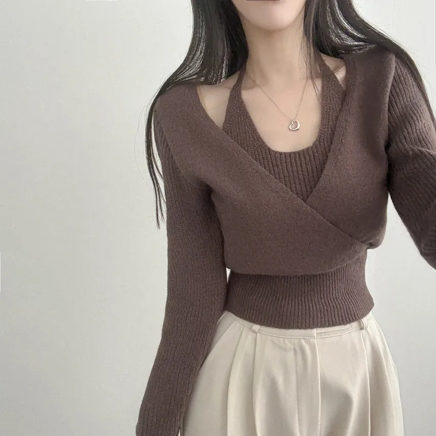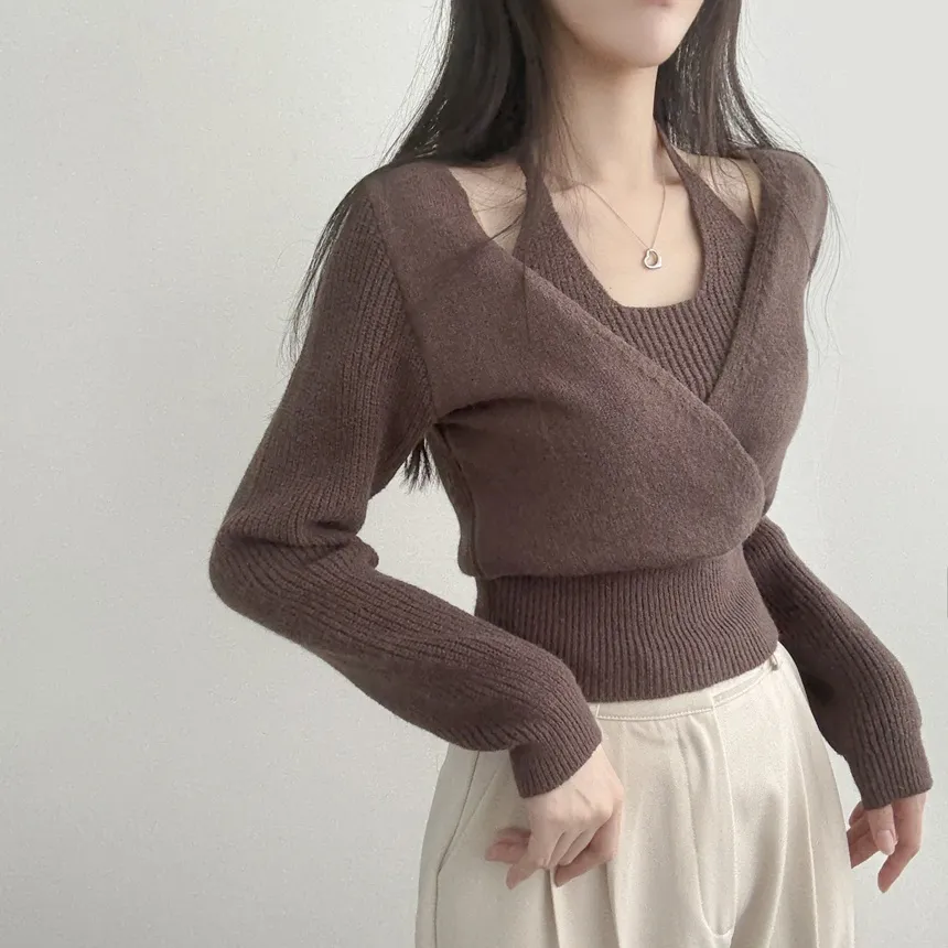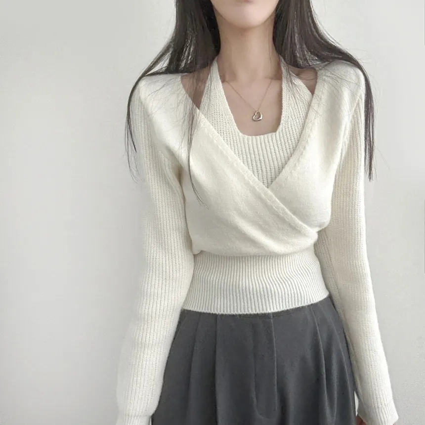 リブホルターネッククロップドレイヤード風ラップ調ニット・S1937755