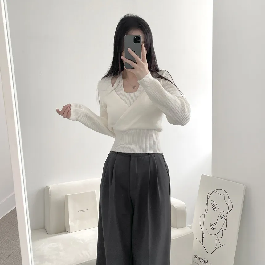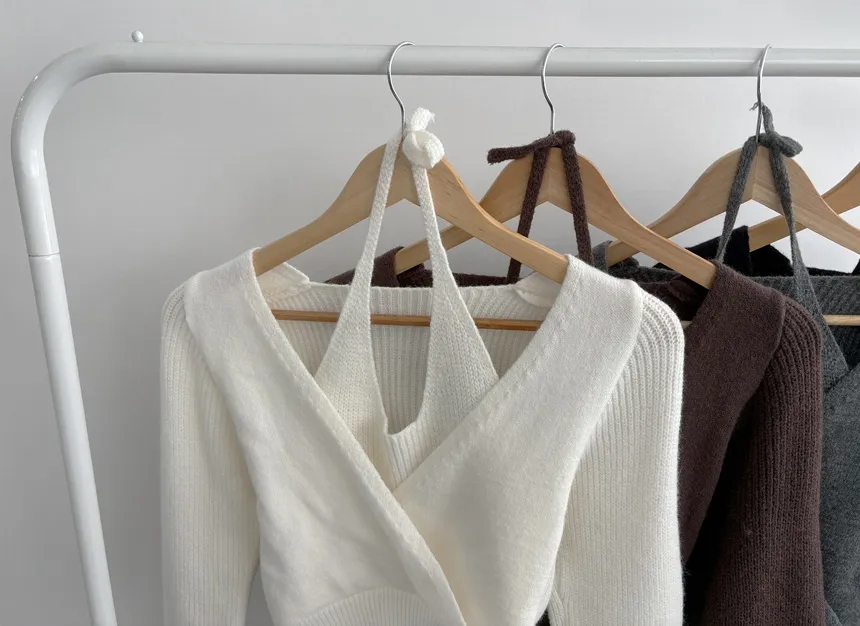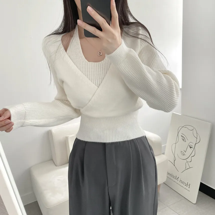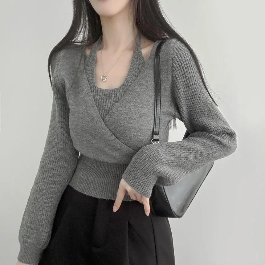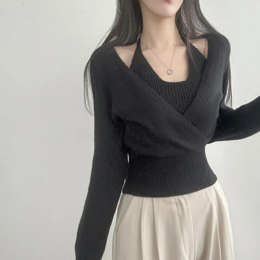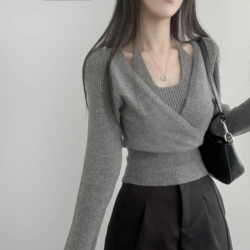 リブホルターネッククロップドレイヤード風ラップ調ニット・S1937755