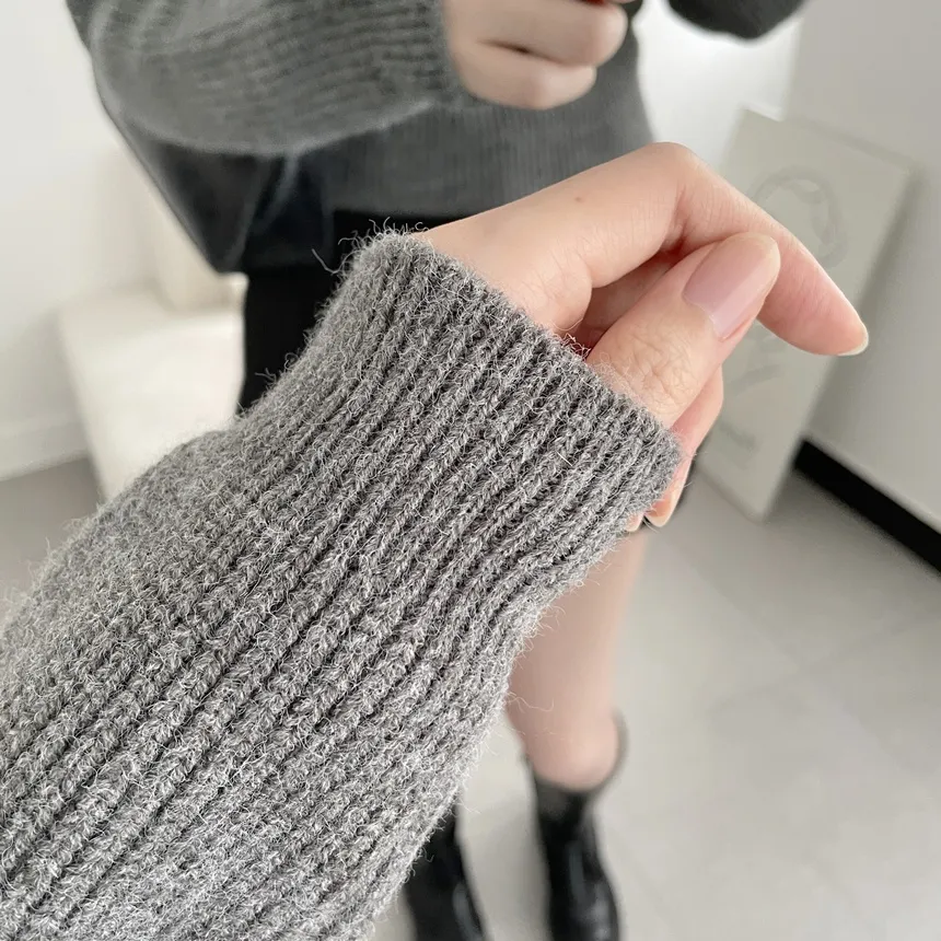 ウール混ラウンドネックケーブル長袖ニット