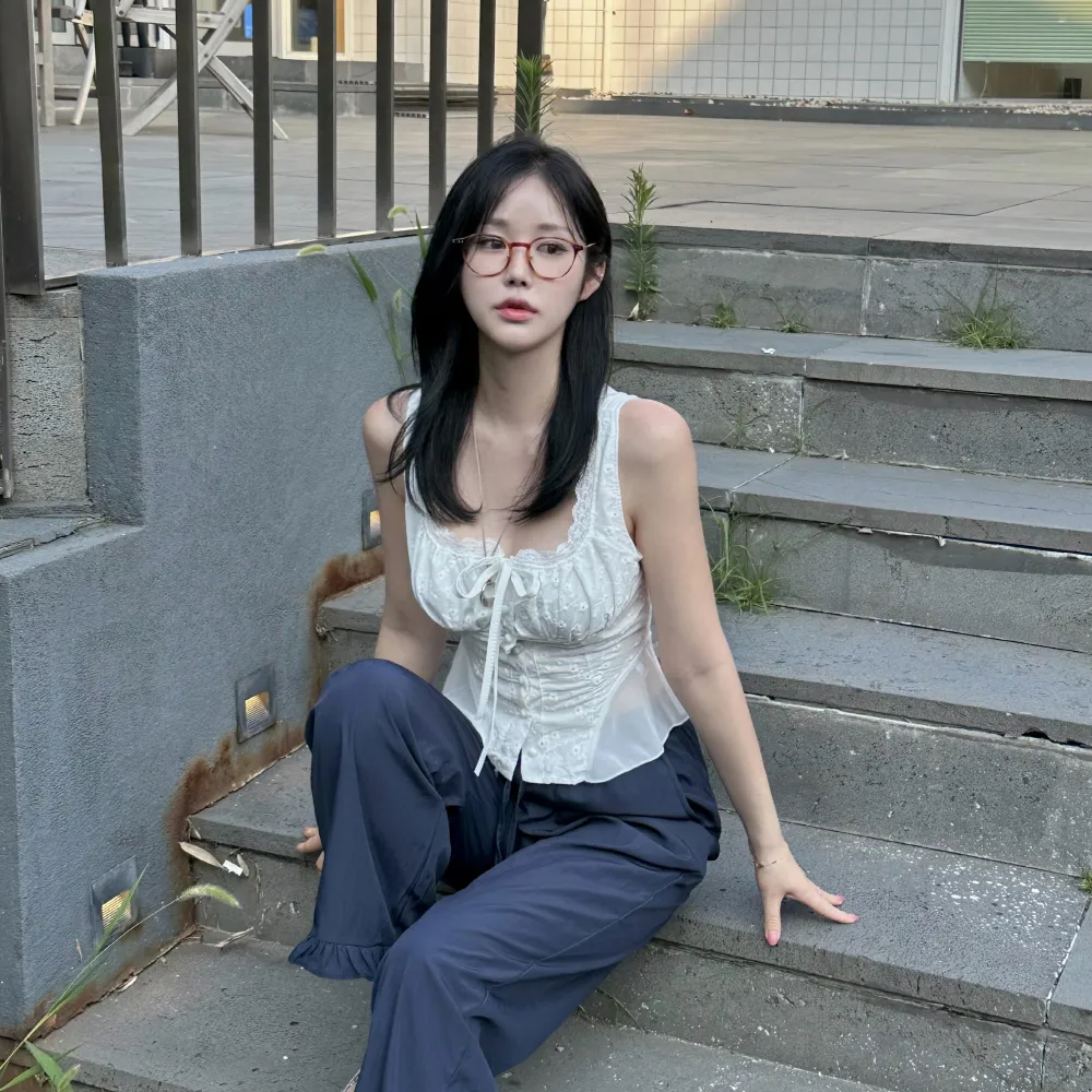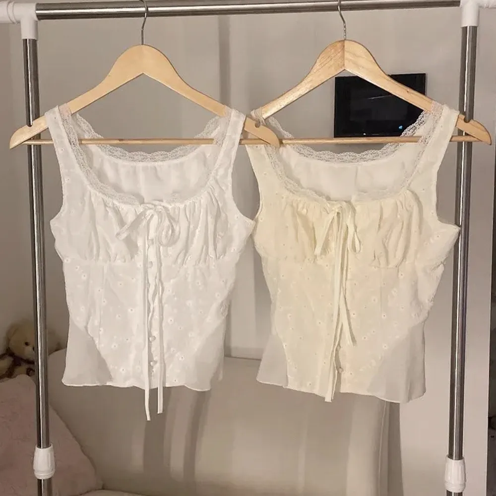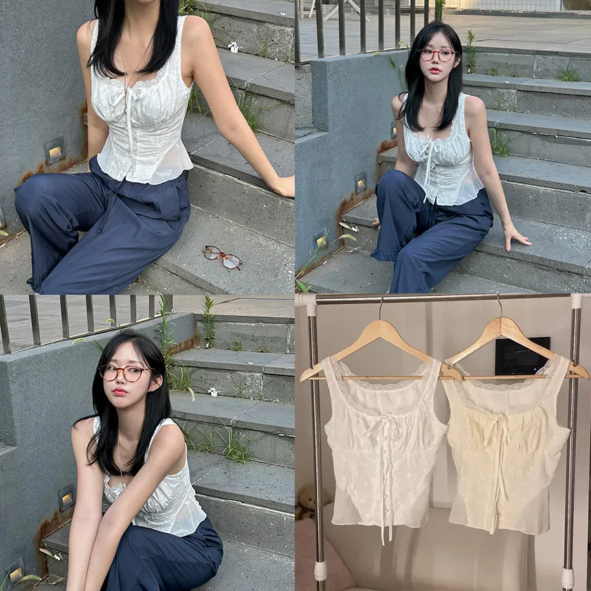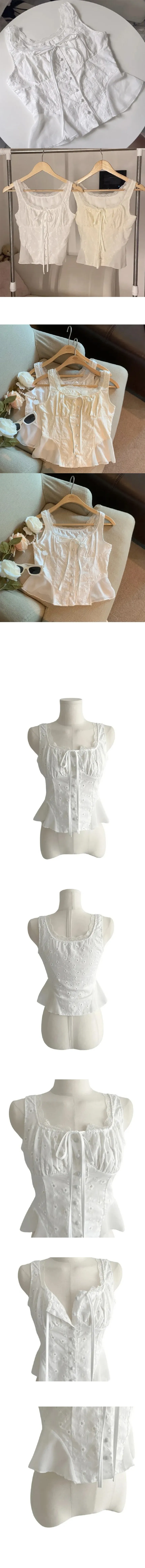 コットンリボンボタンシャーリングスリム刺繍レース花柄ノースリブラウス・S1938151
