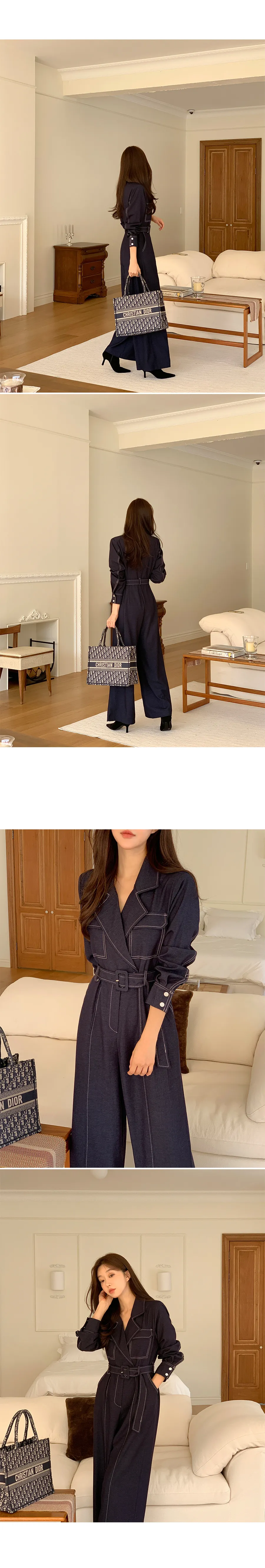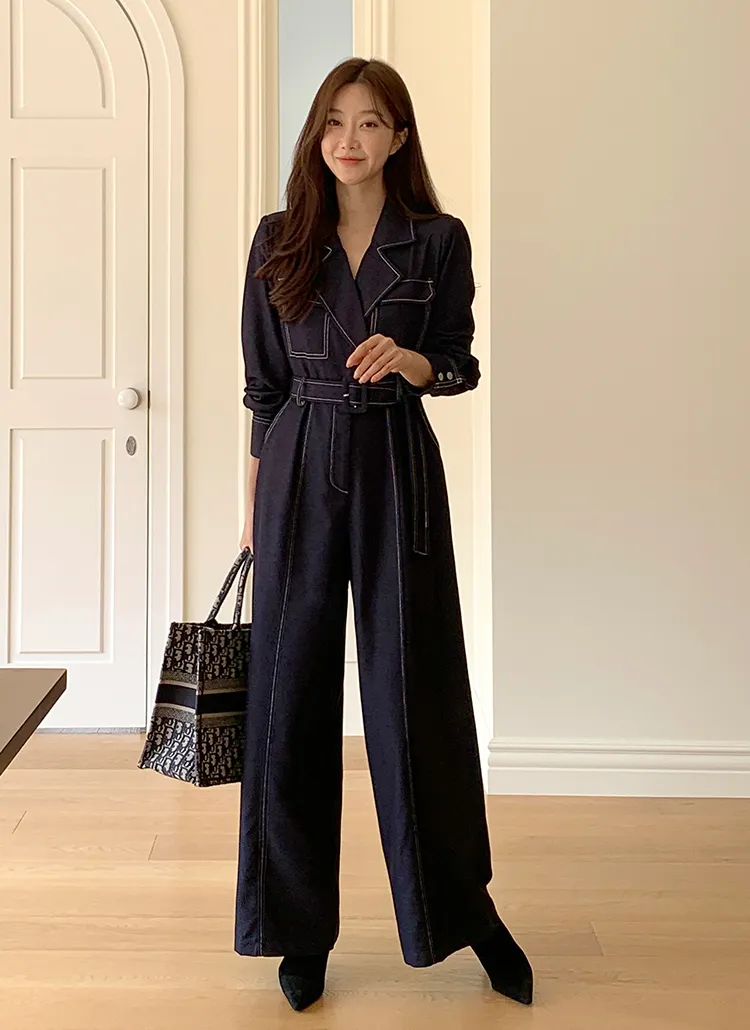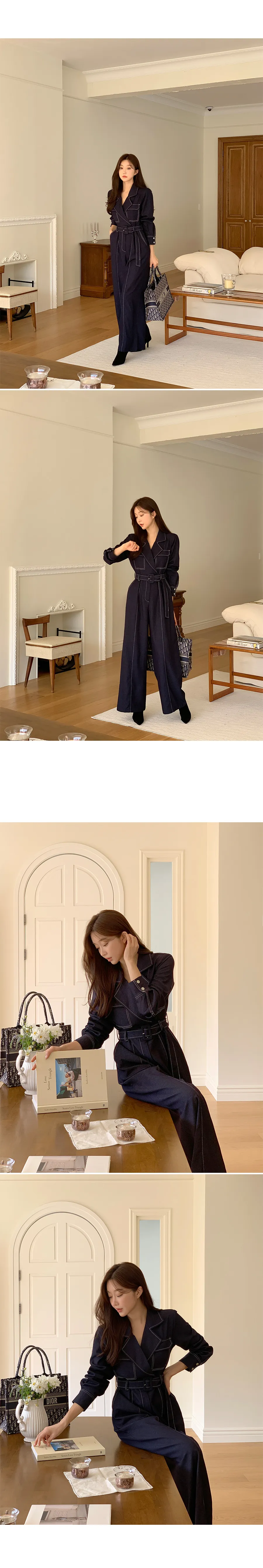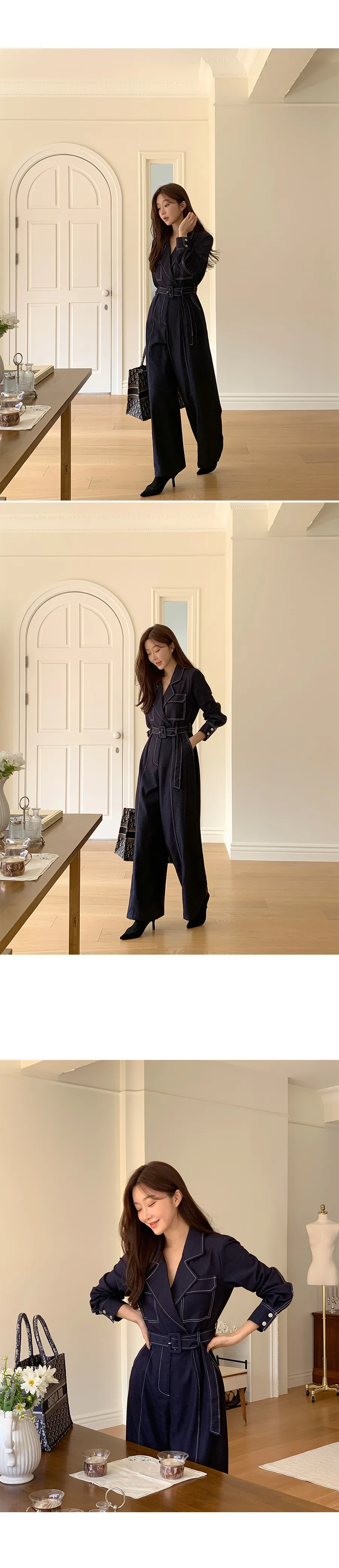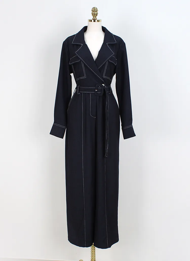 ベルト付ステッチ長袖カラーオールインワン・S1938322