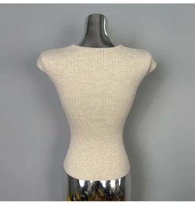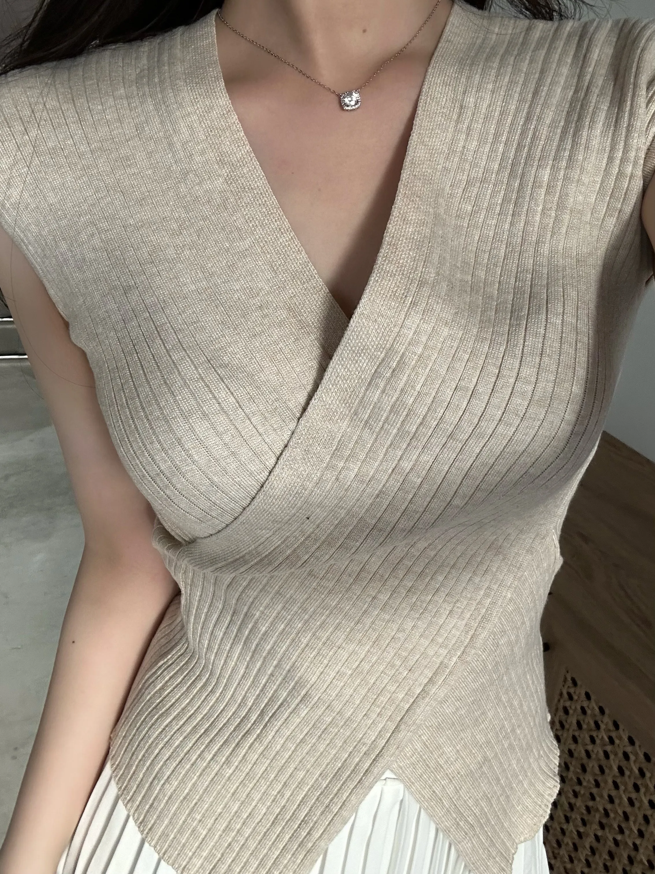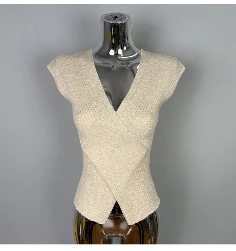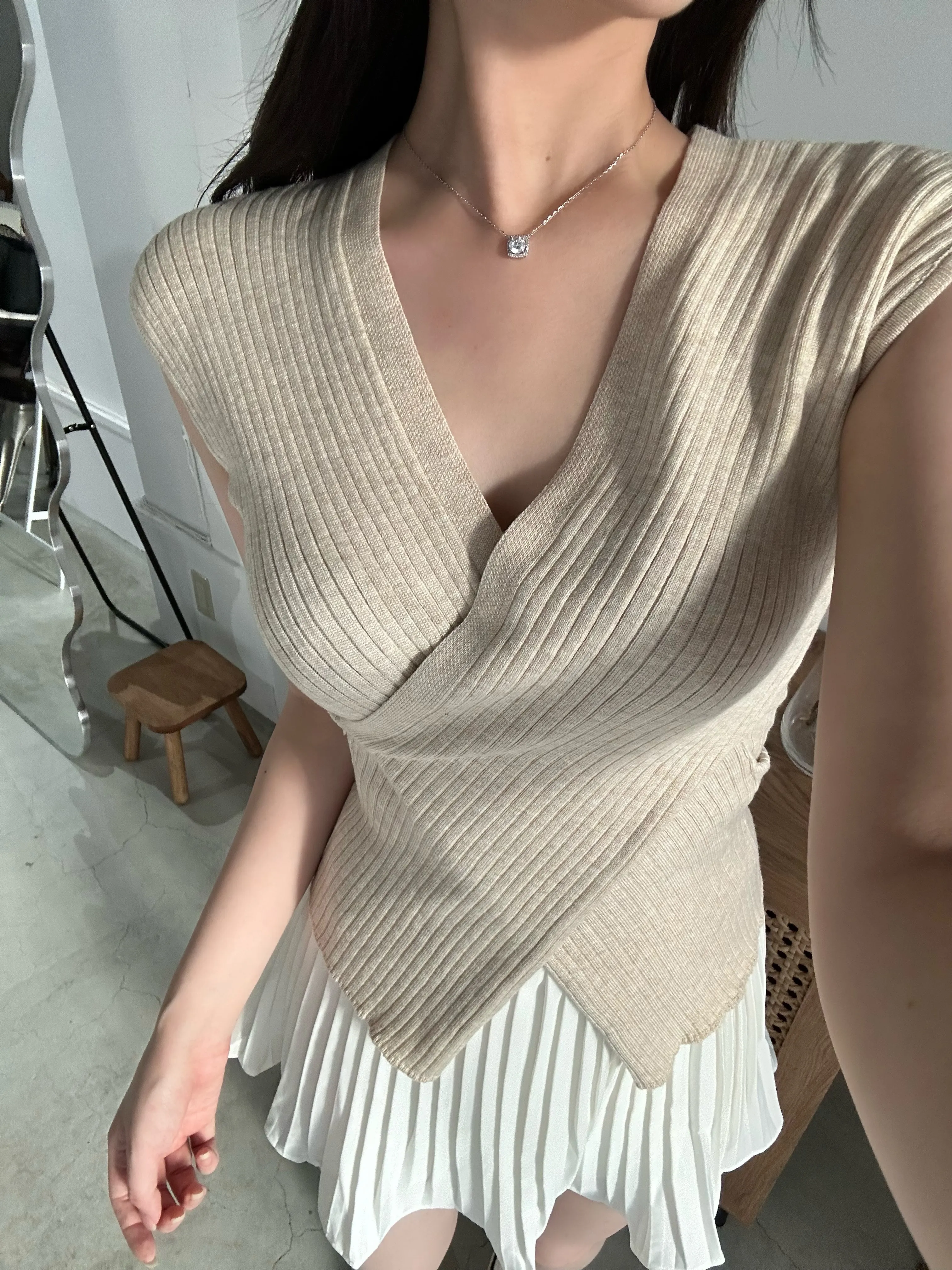 クロスがポイントの半袖ニット。