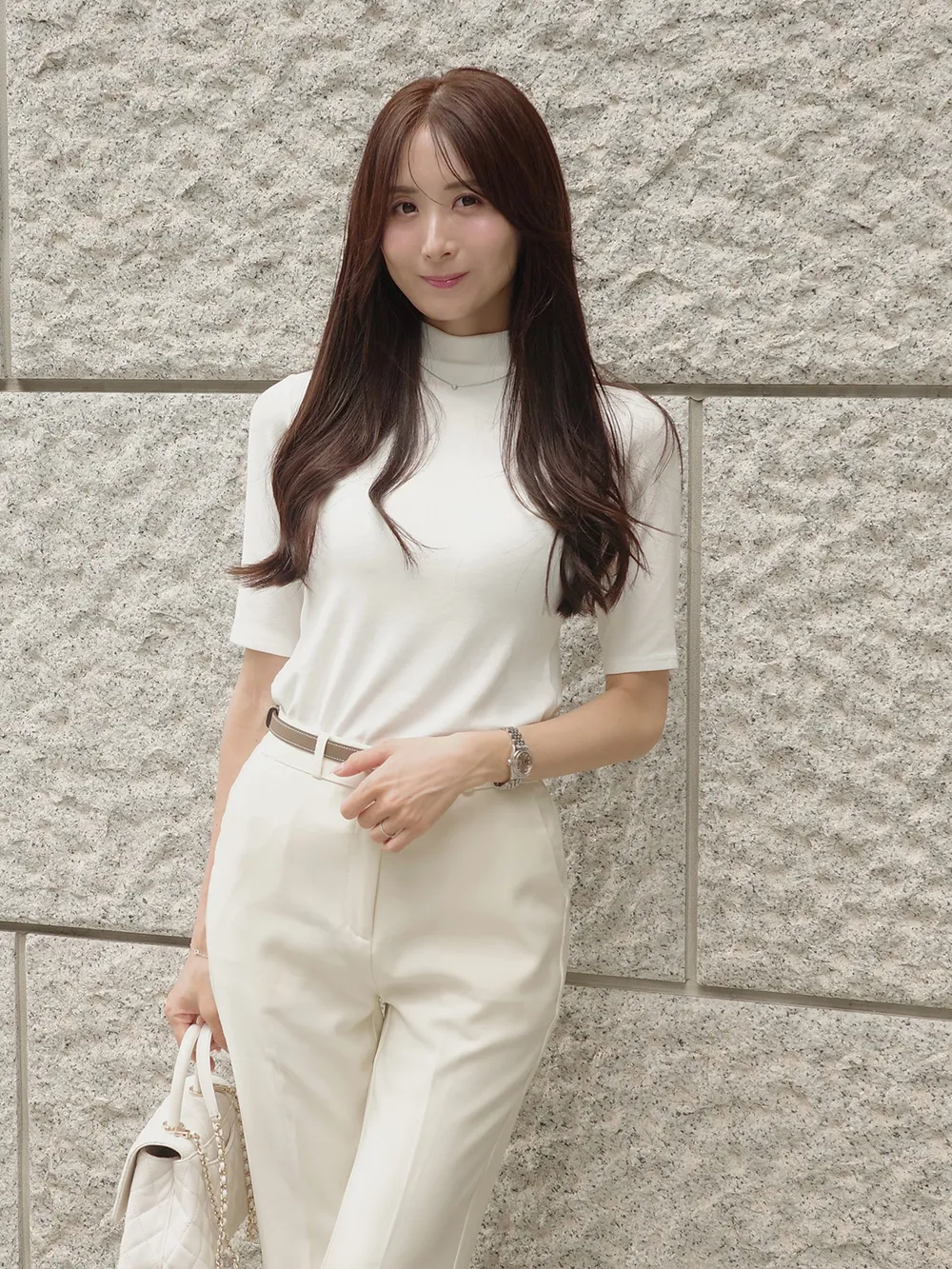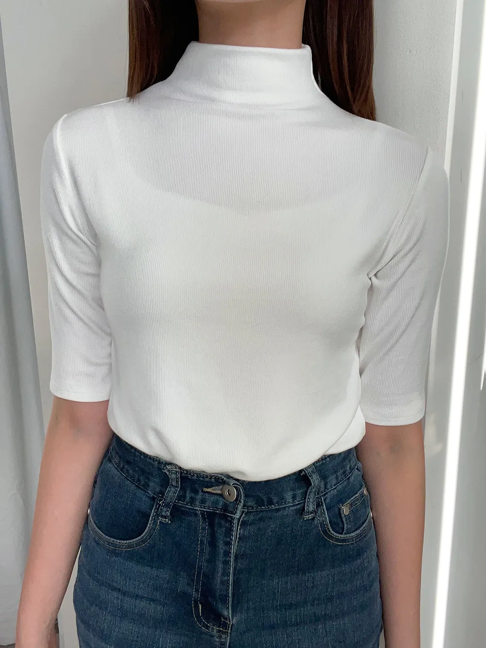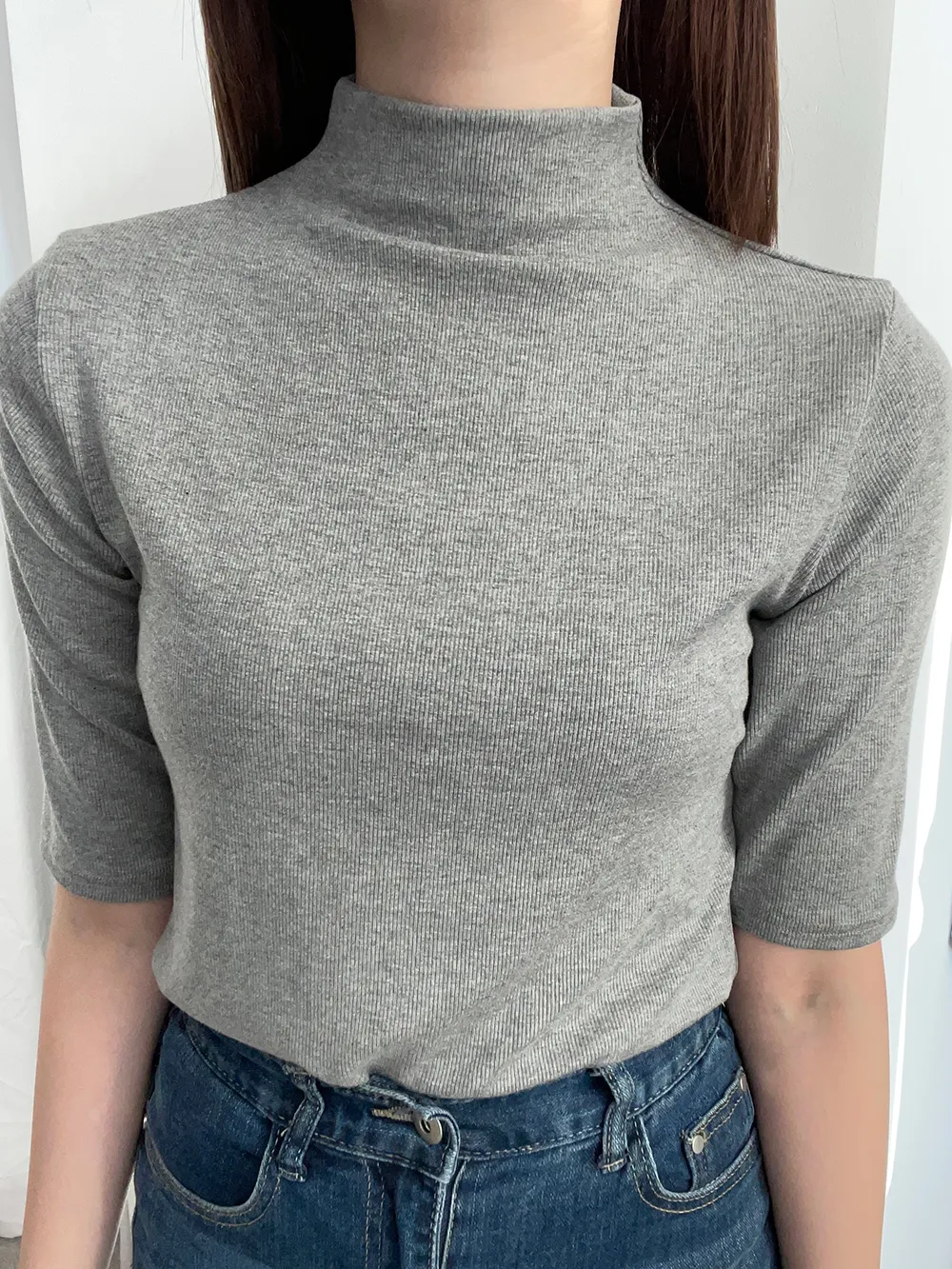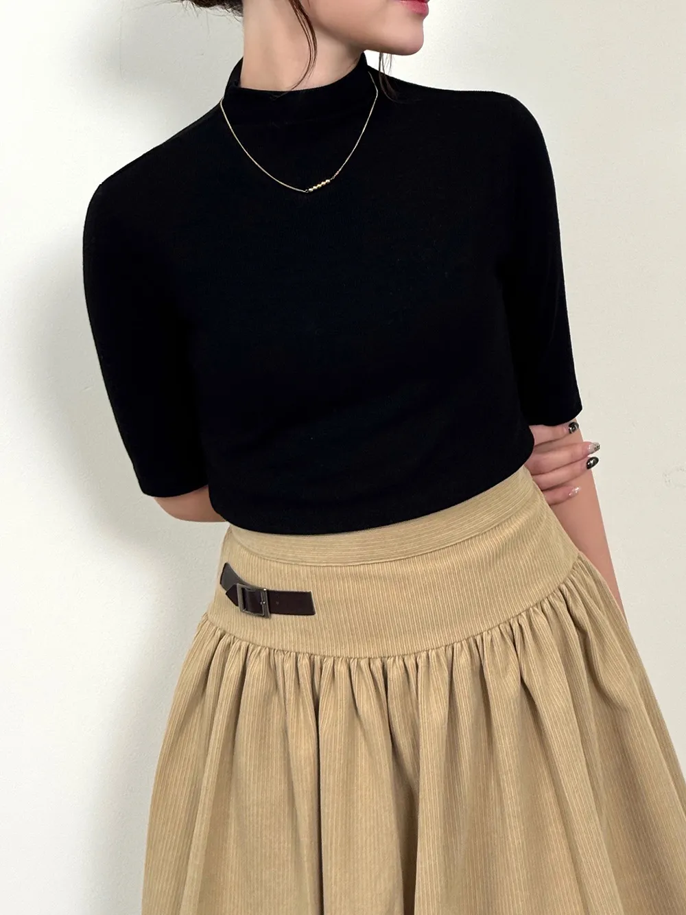 5分袖とハイネックが特徴でシンプルながらも高級感を与えます。