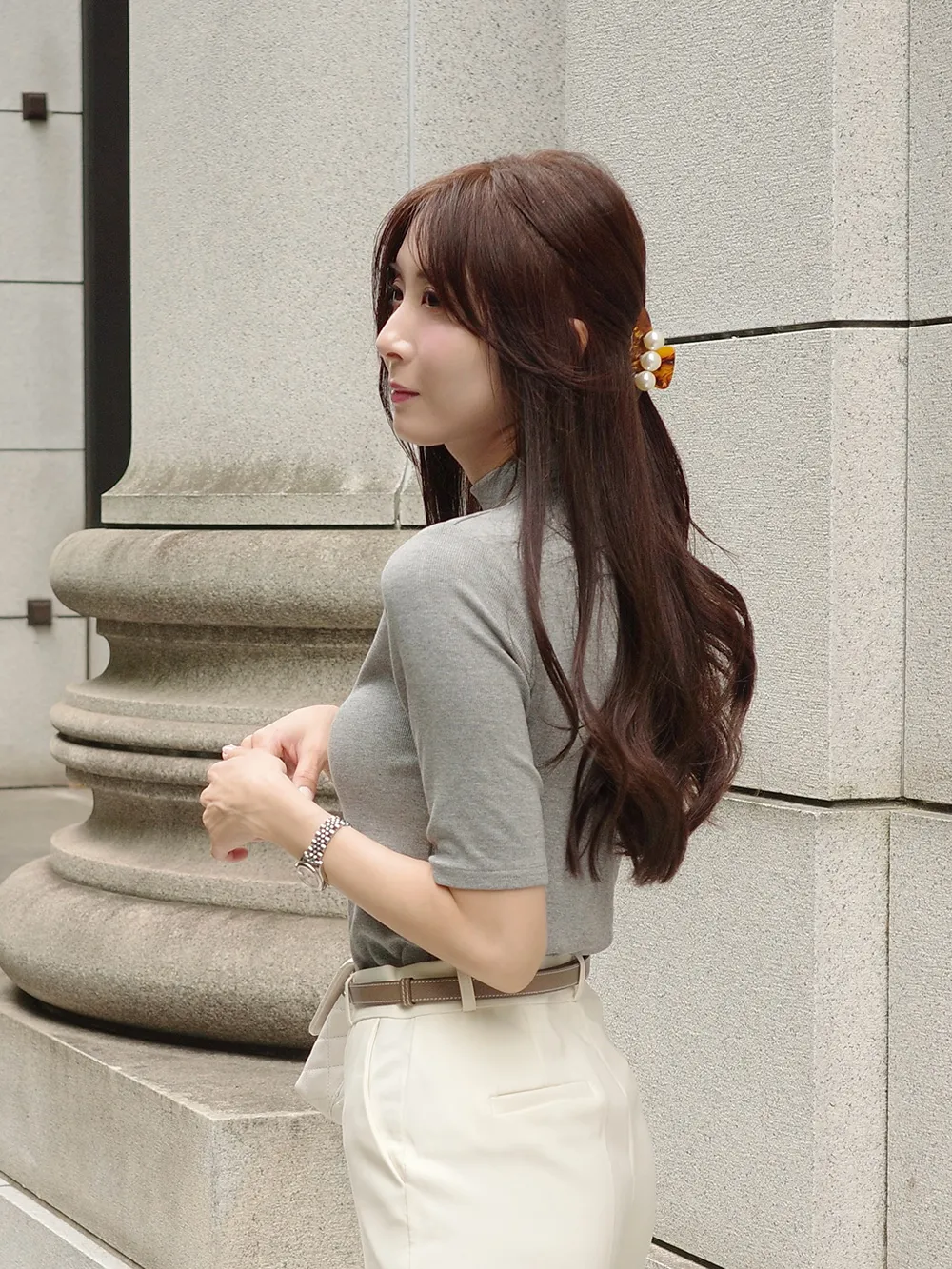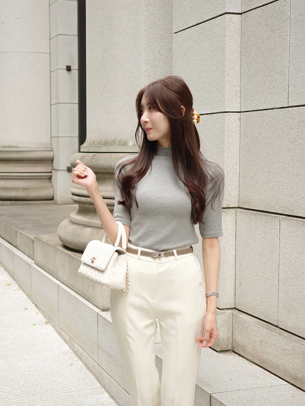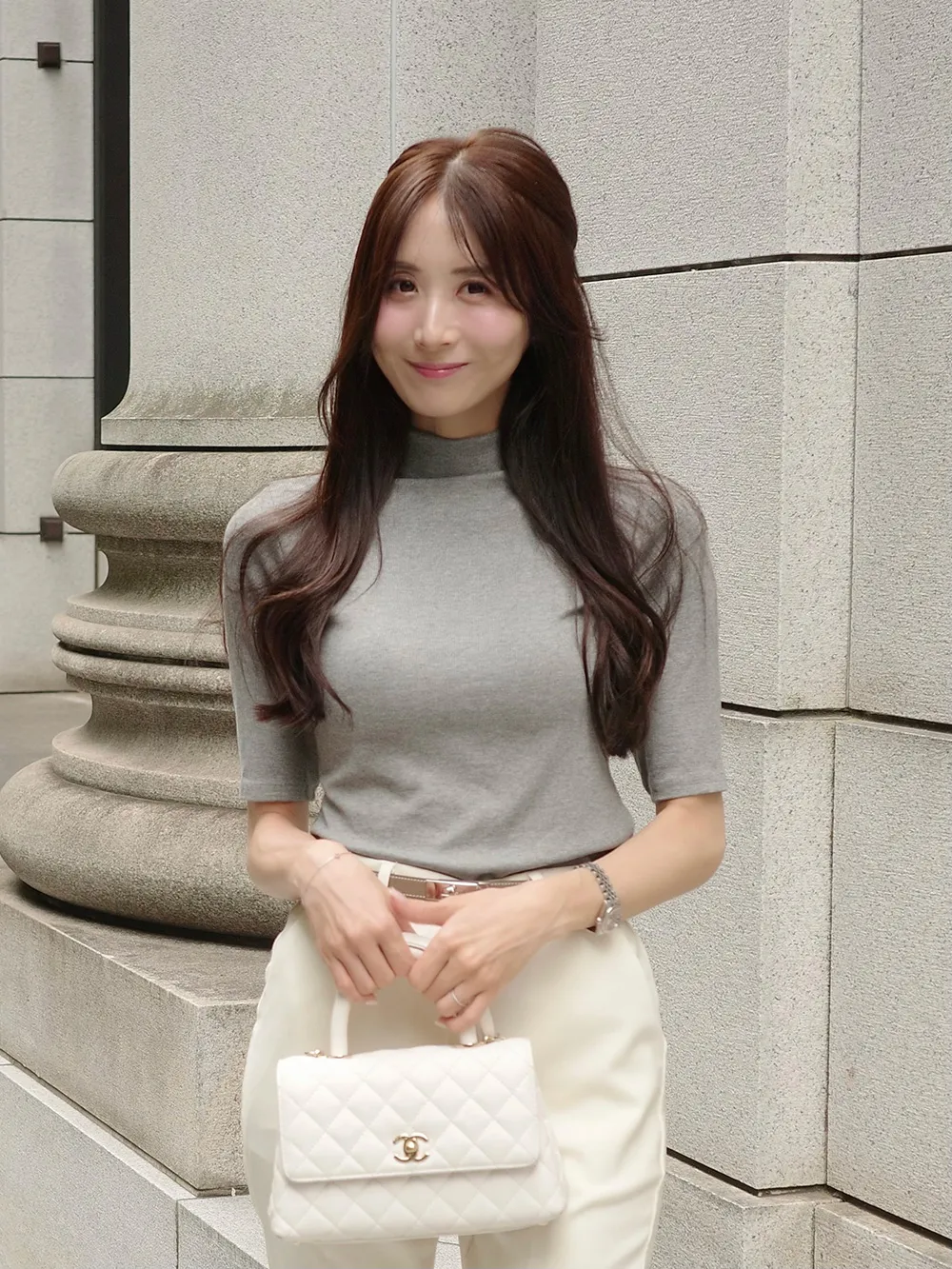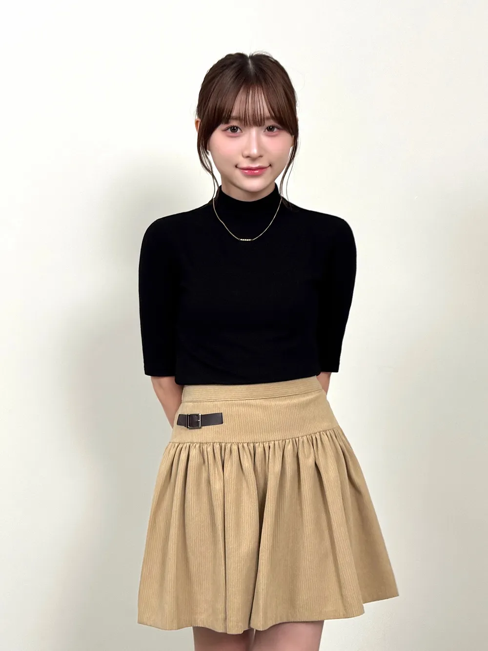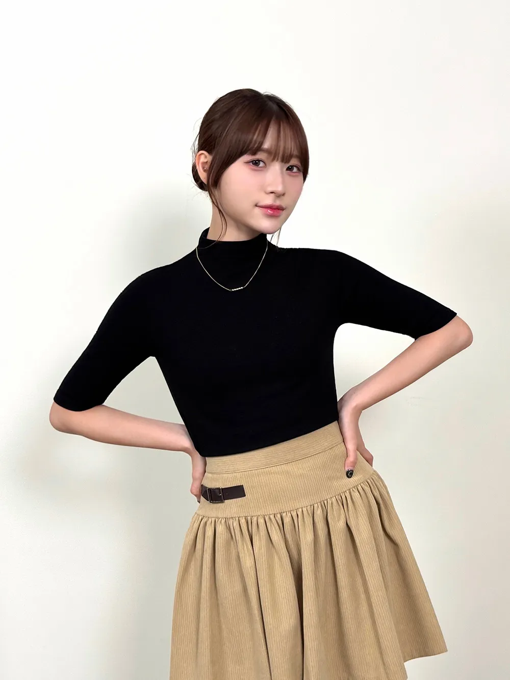 5分袖とハイネックが特徴でシンプルながらも高級感を与えます。