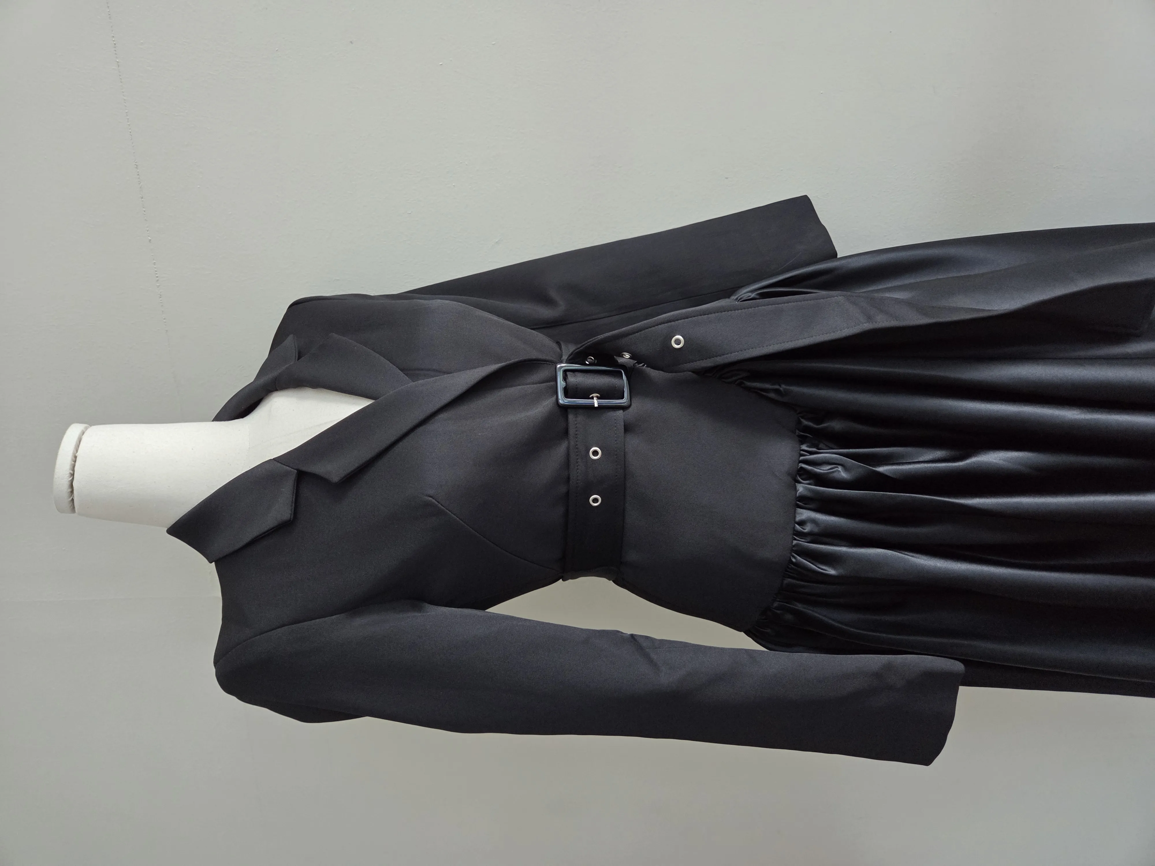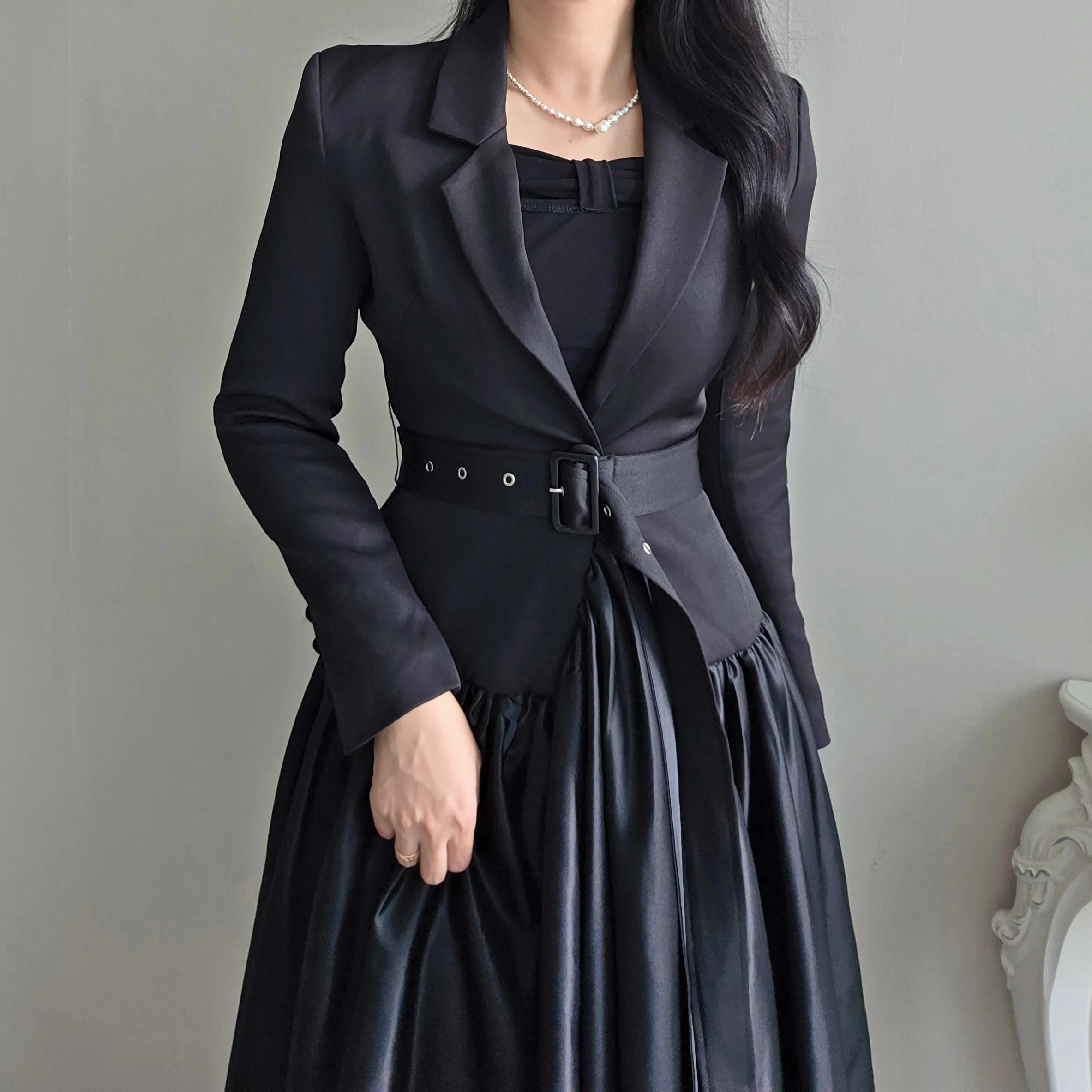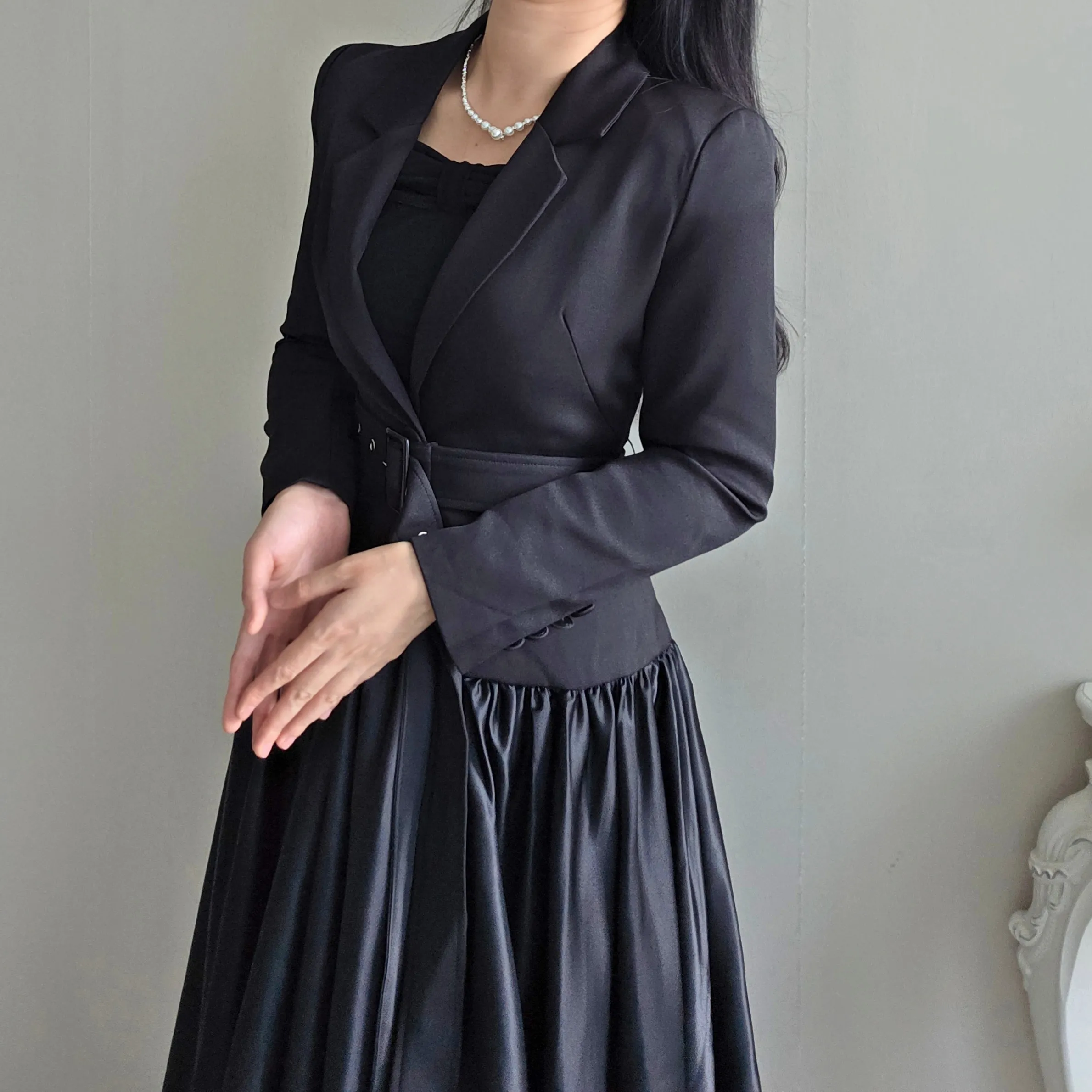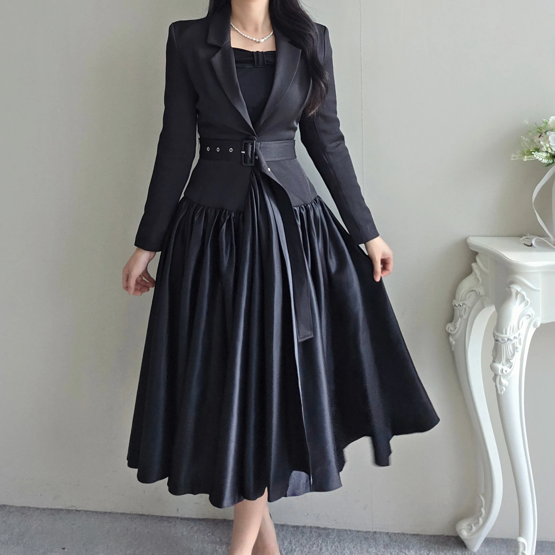 ベルト付肩パッドテーラードカラーギャザーフレアワンピース・S1939069