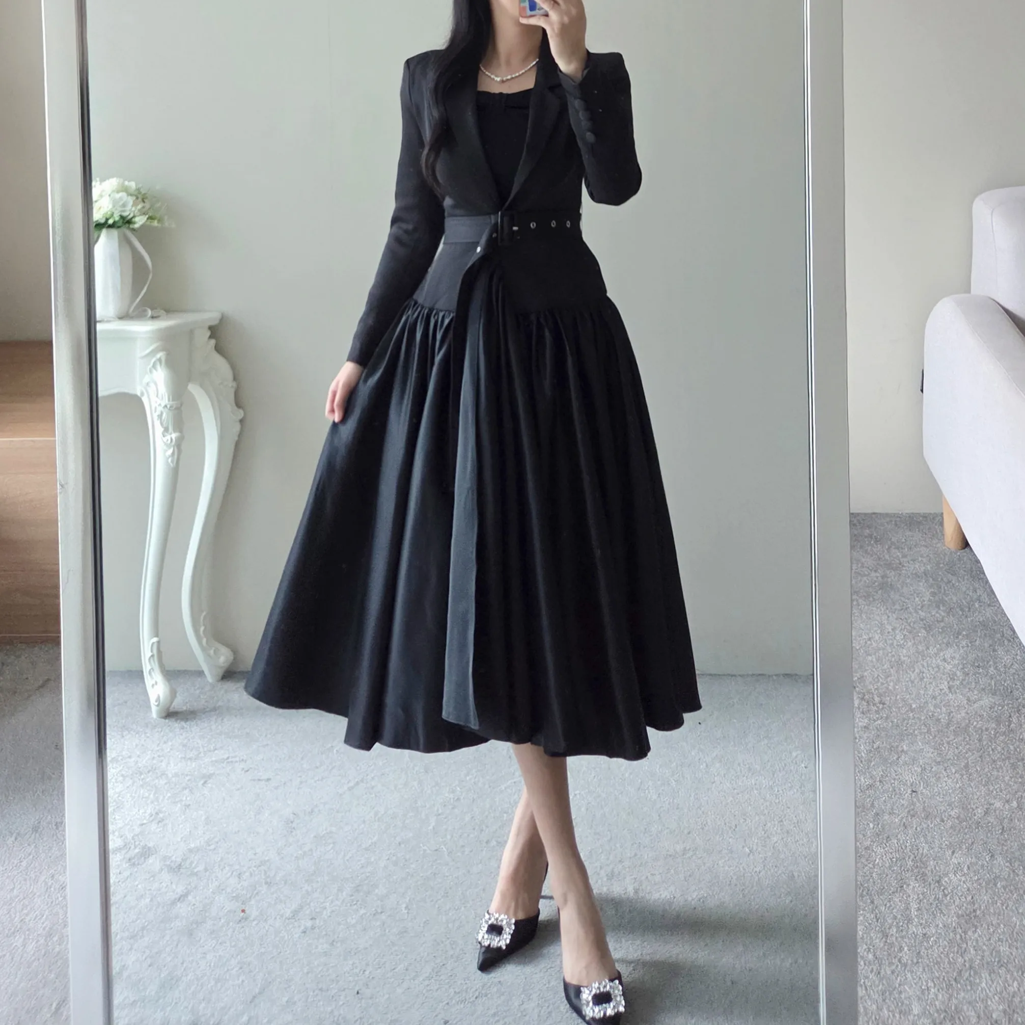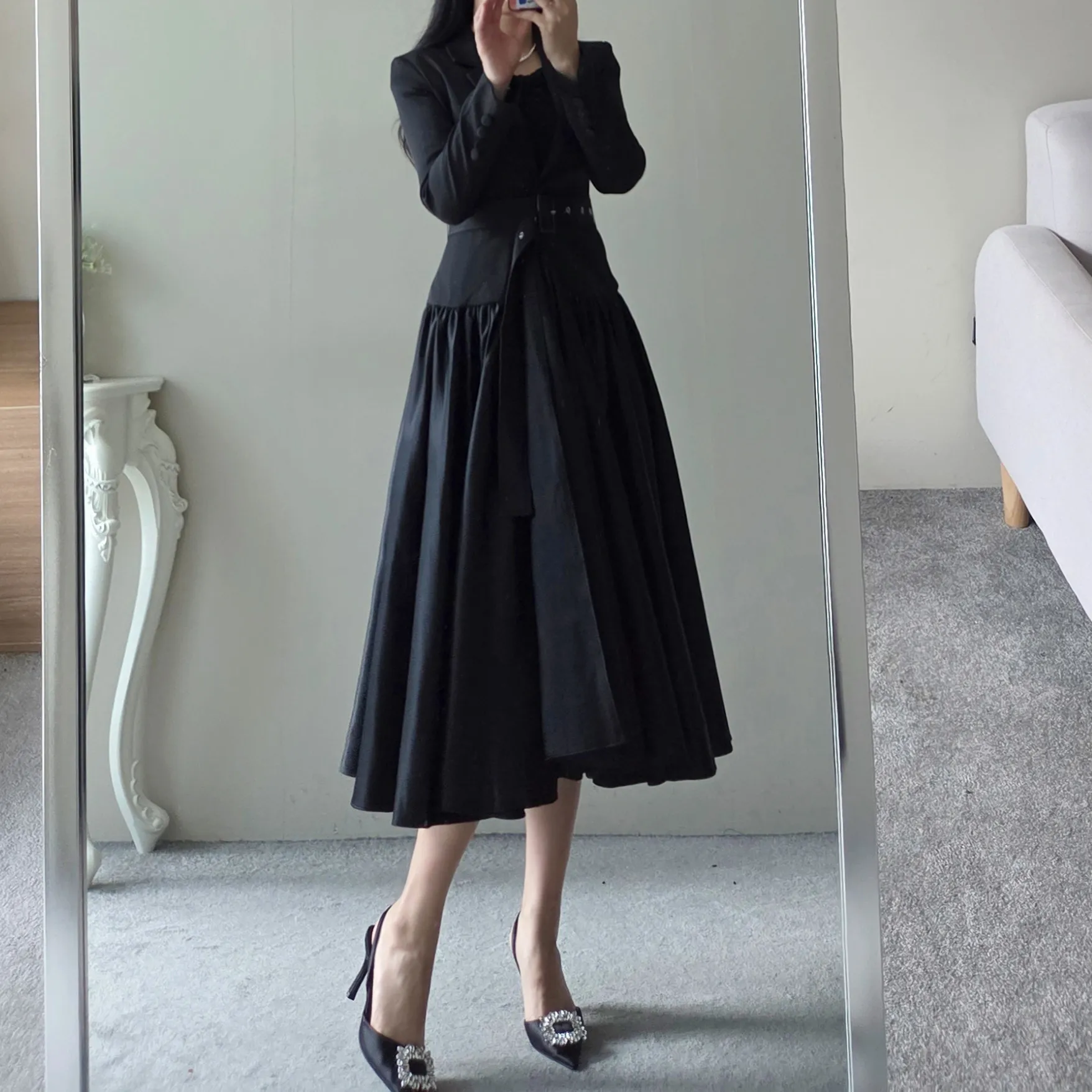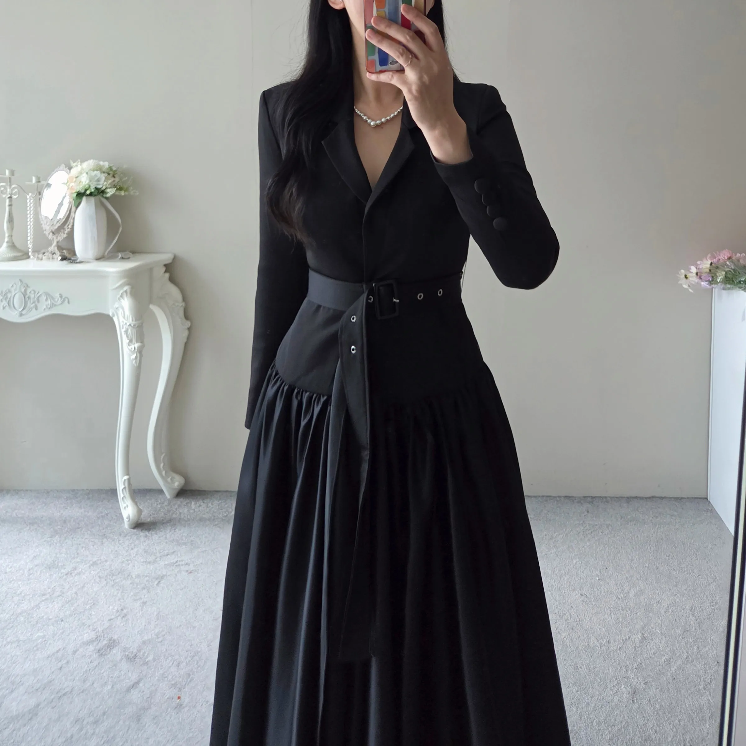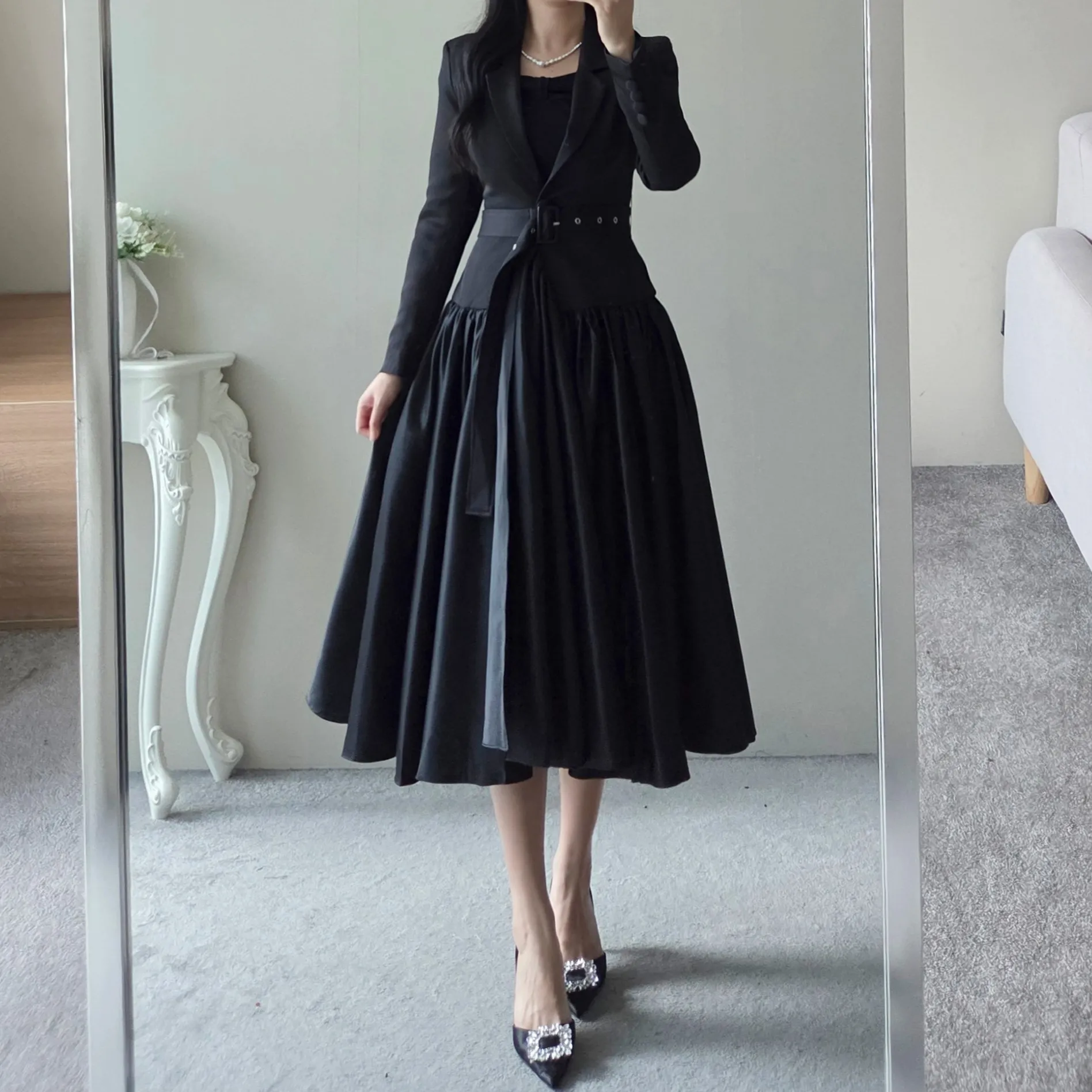 ベルト付肩パッドテーラードカラーギャザーフレアワンピース・S1939069