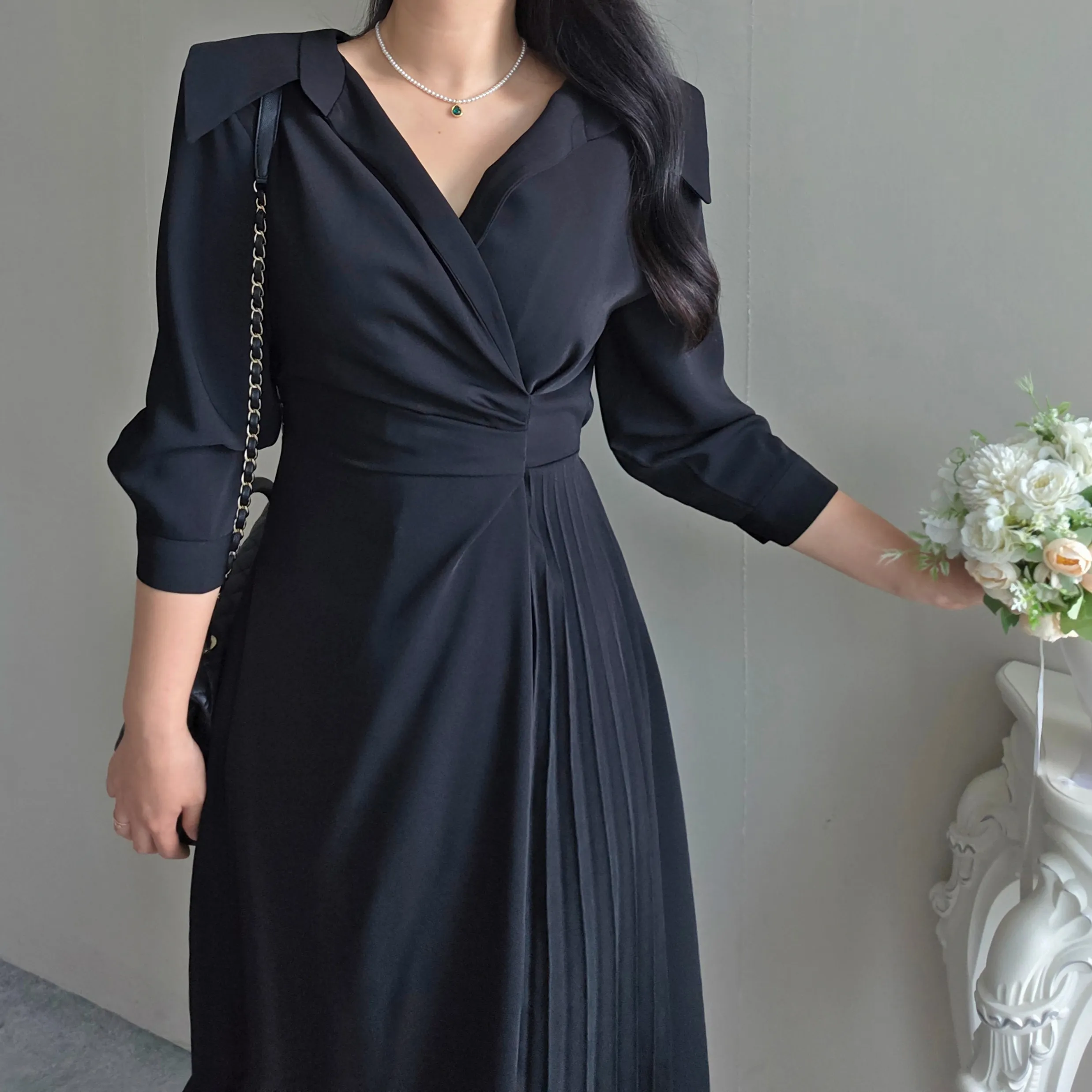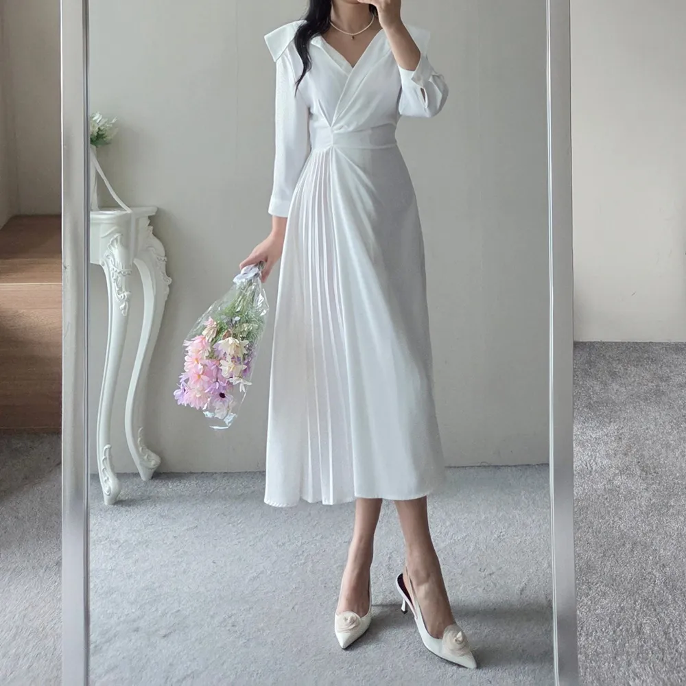 Vネックプリーツニットワンピース
