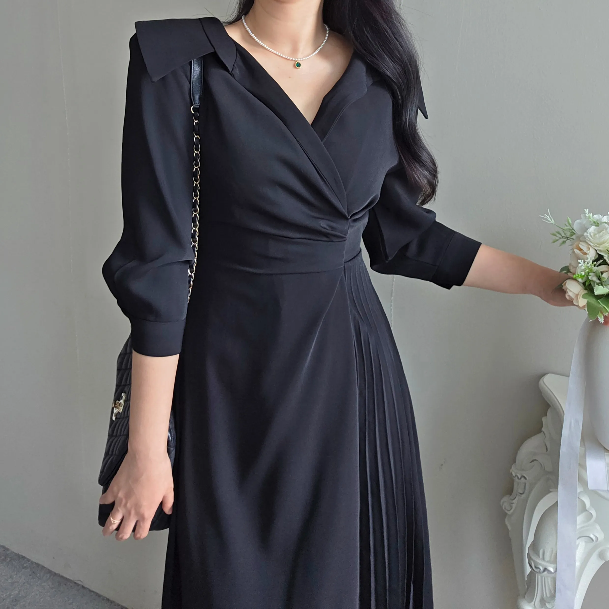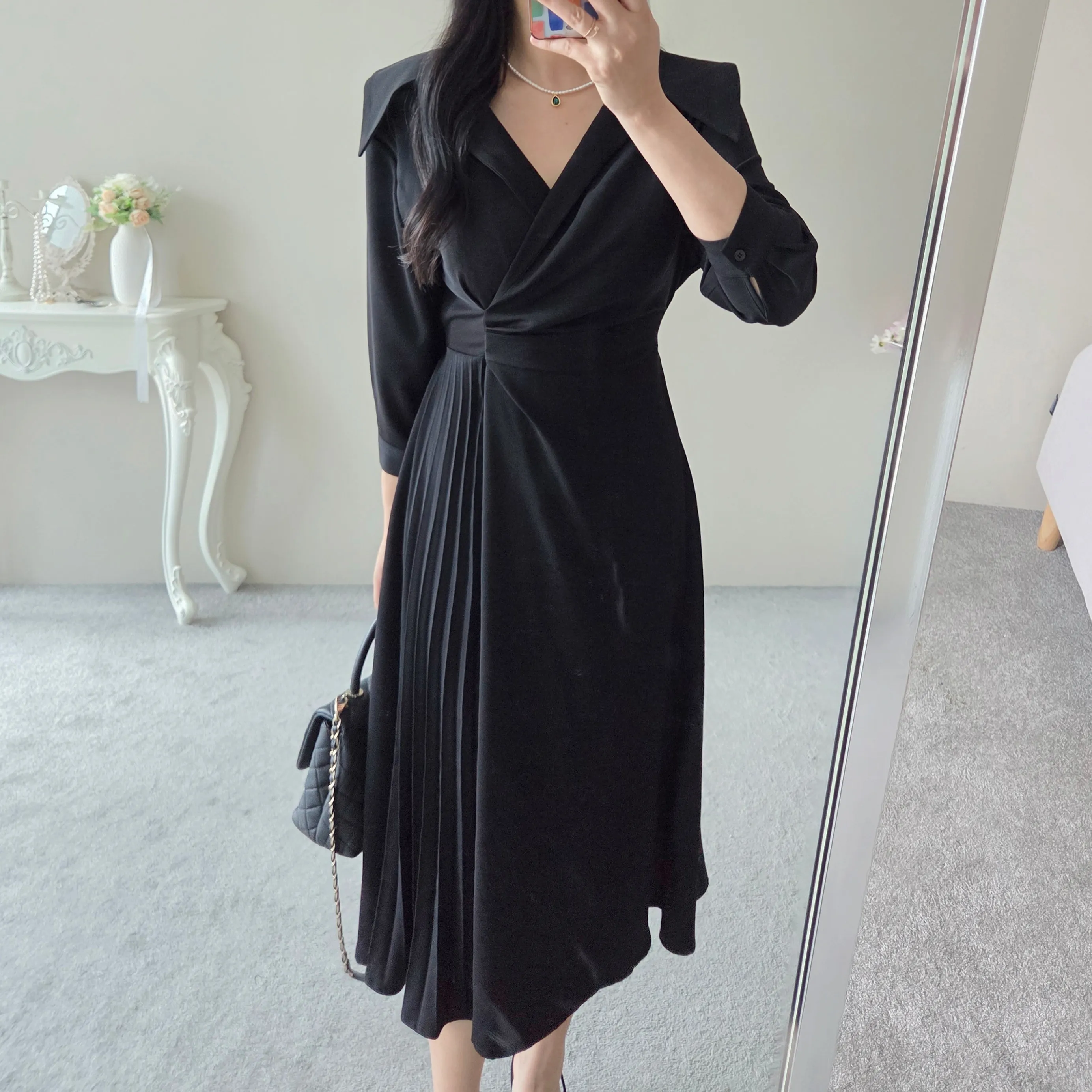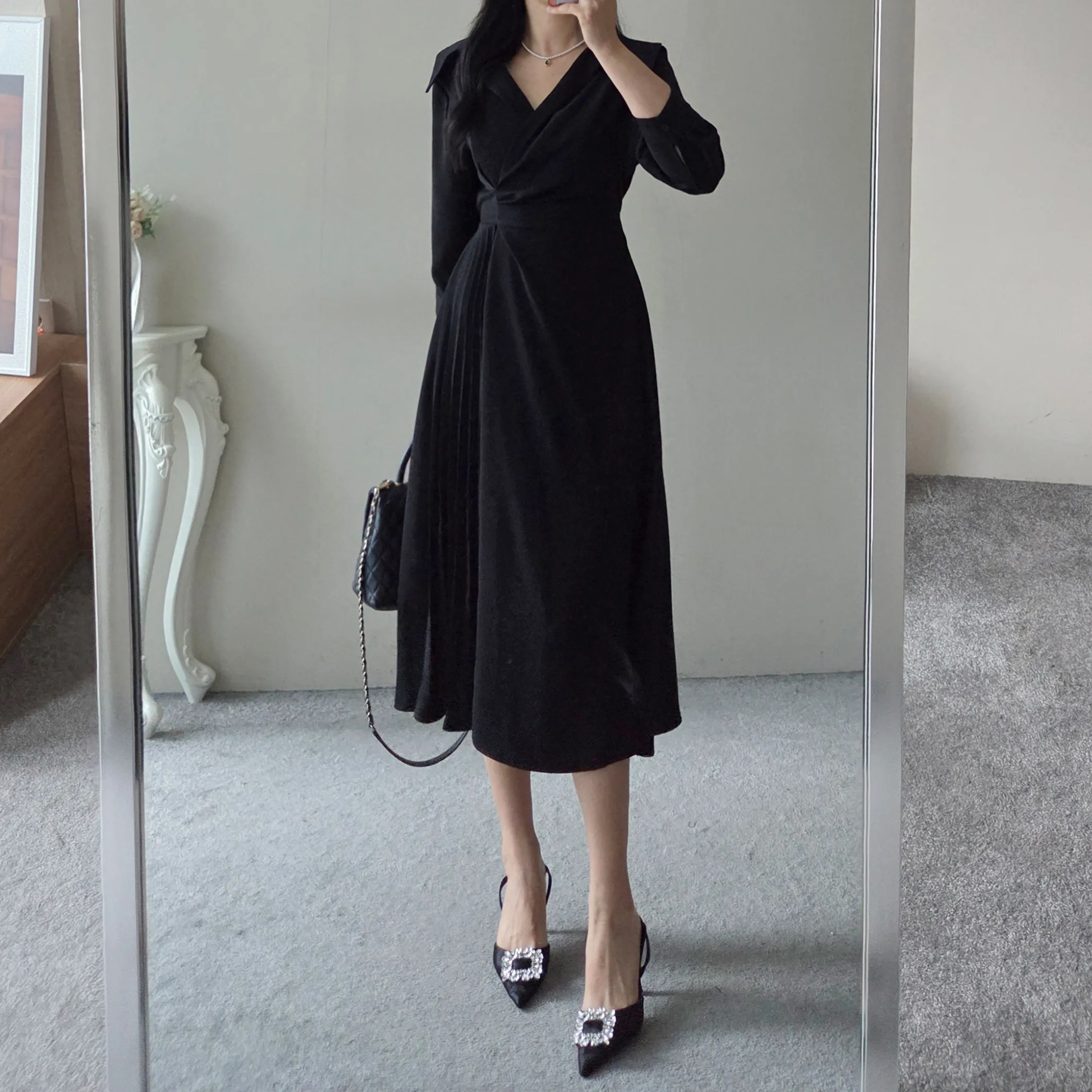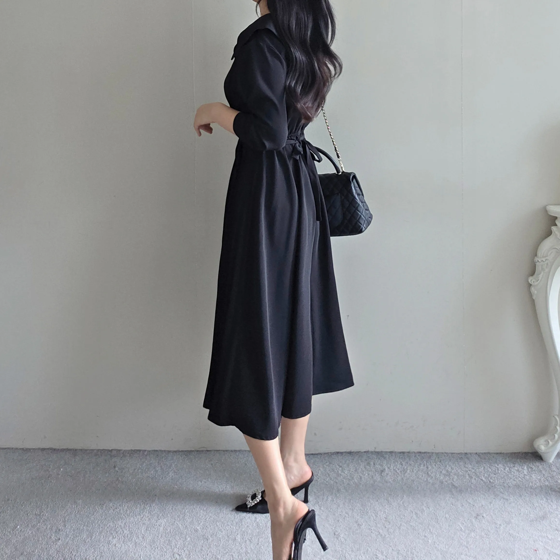 ラウンドネックラインロングマーメイドフェイクポケットワンピース