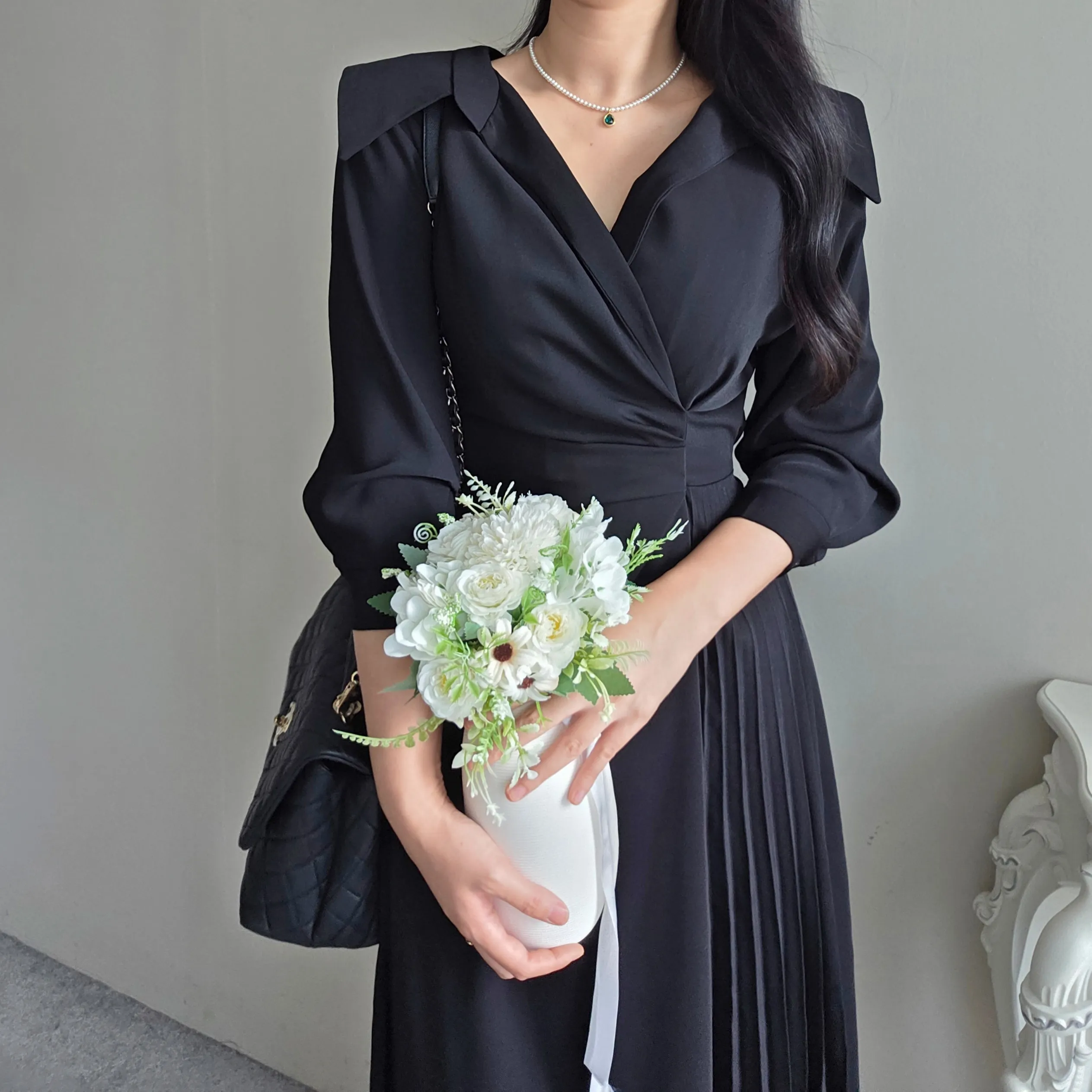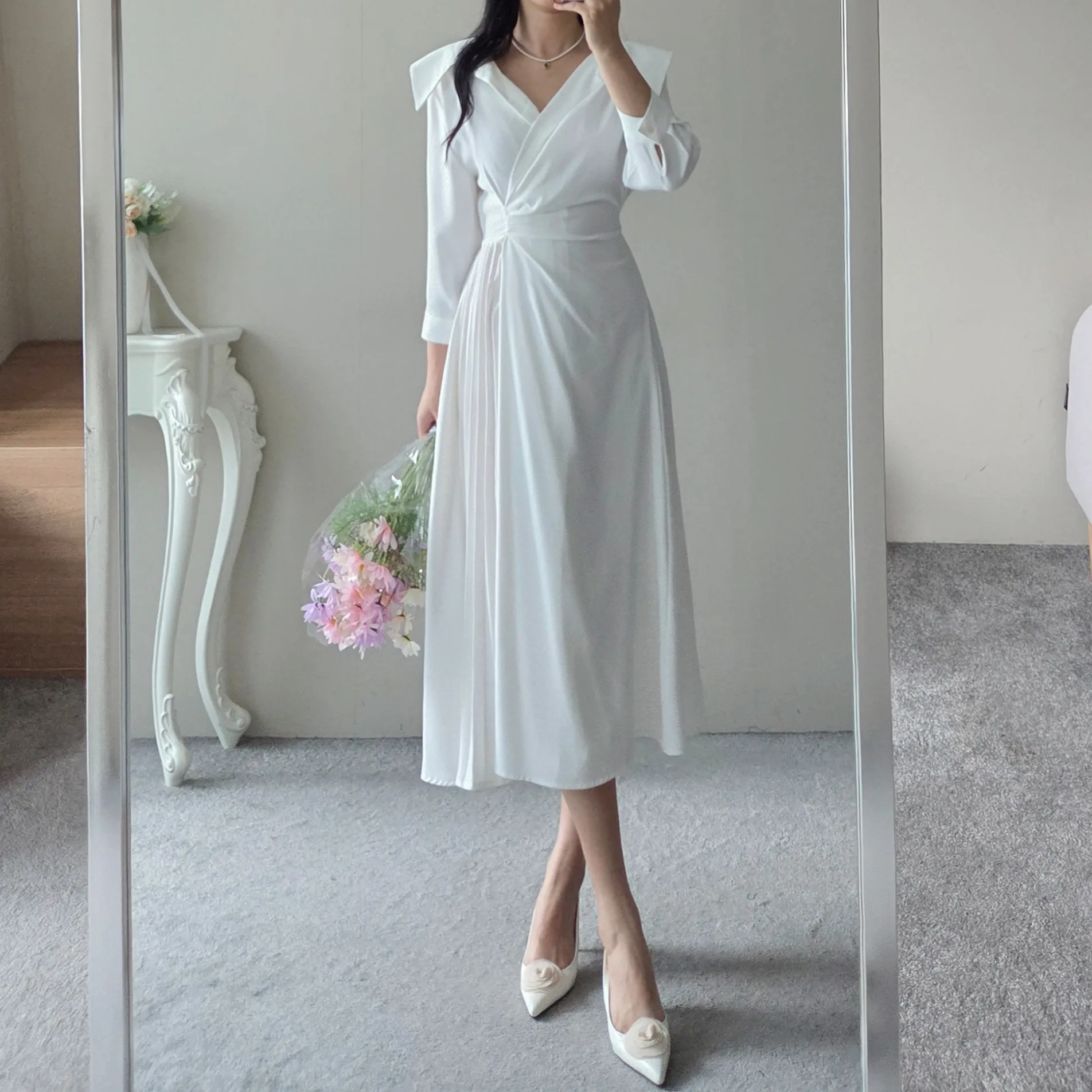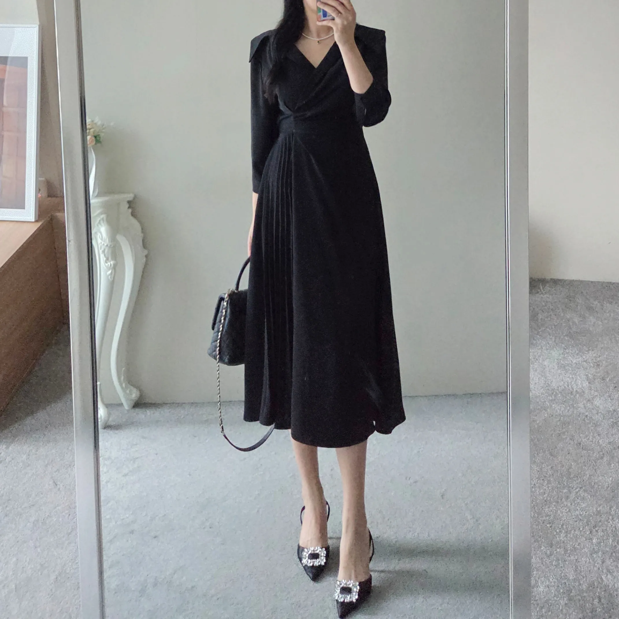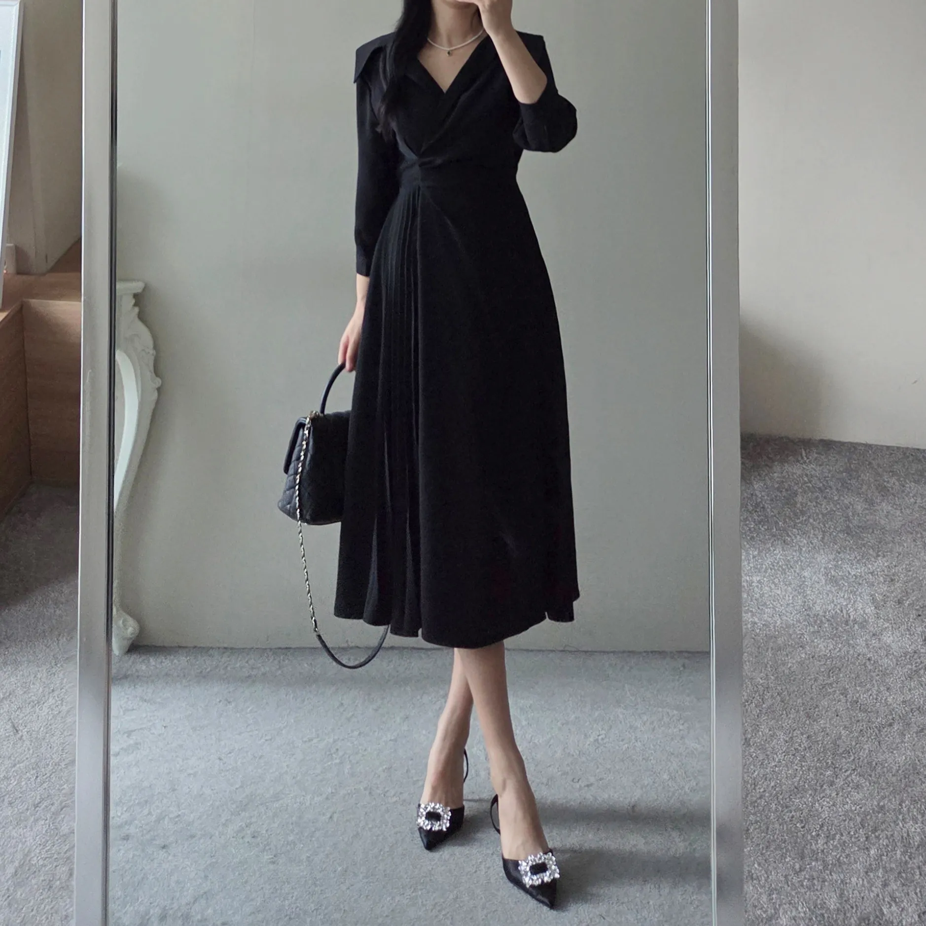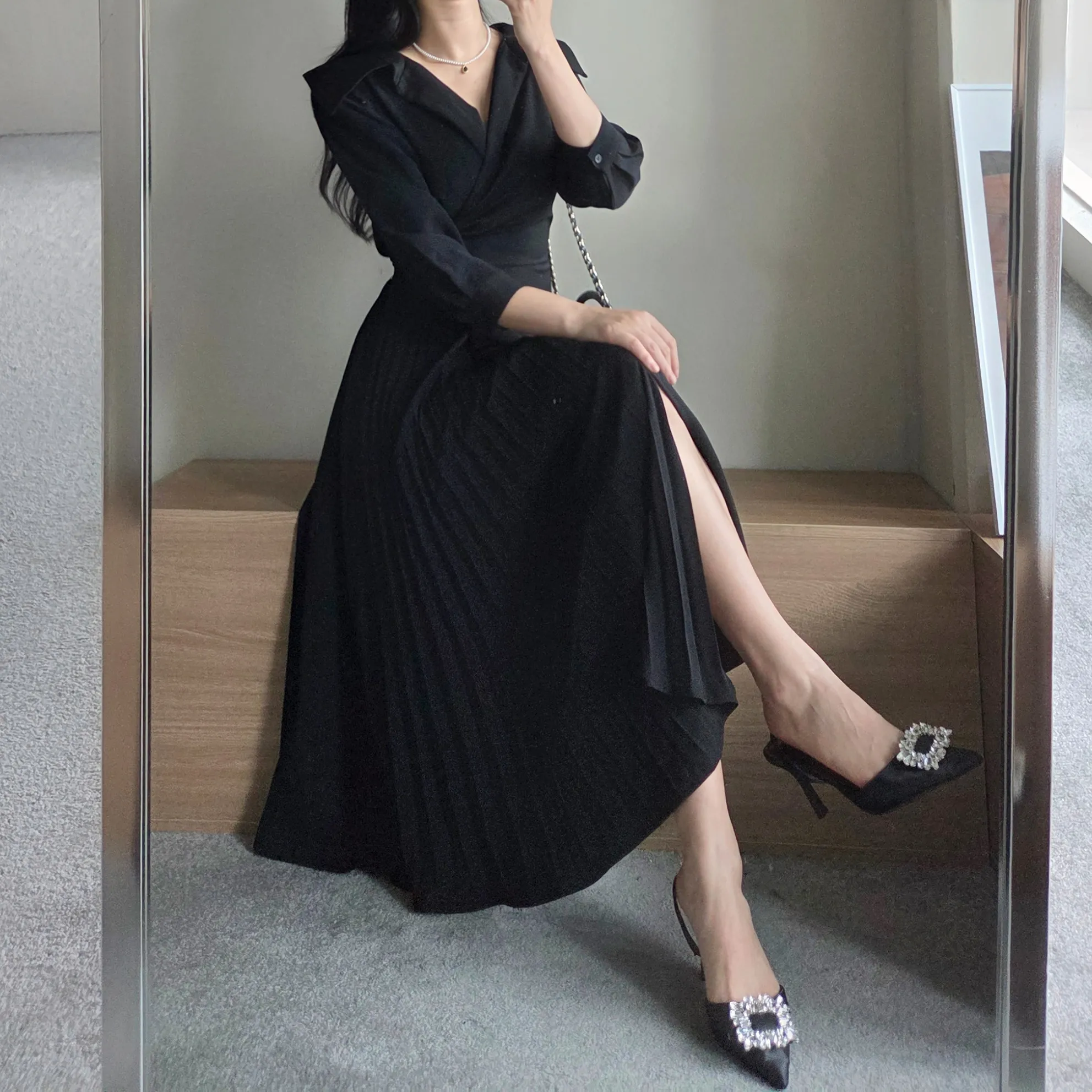 ラウンドネックラインロングマーメイドフェイクポケットワンピース
